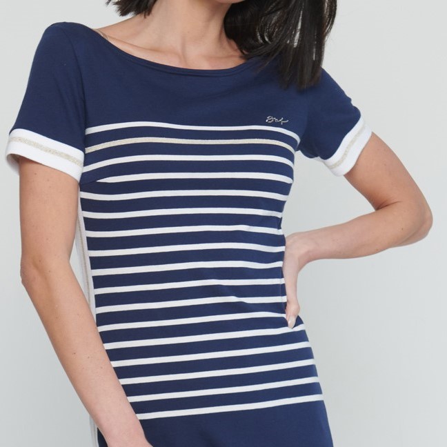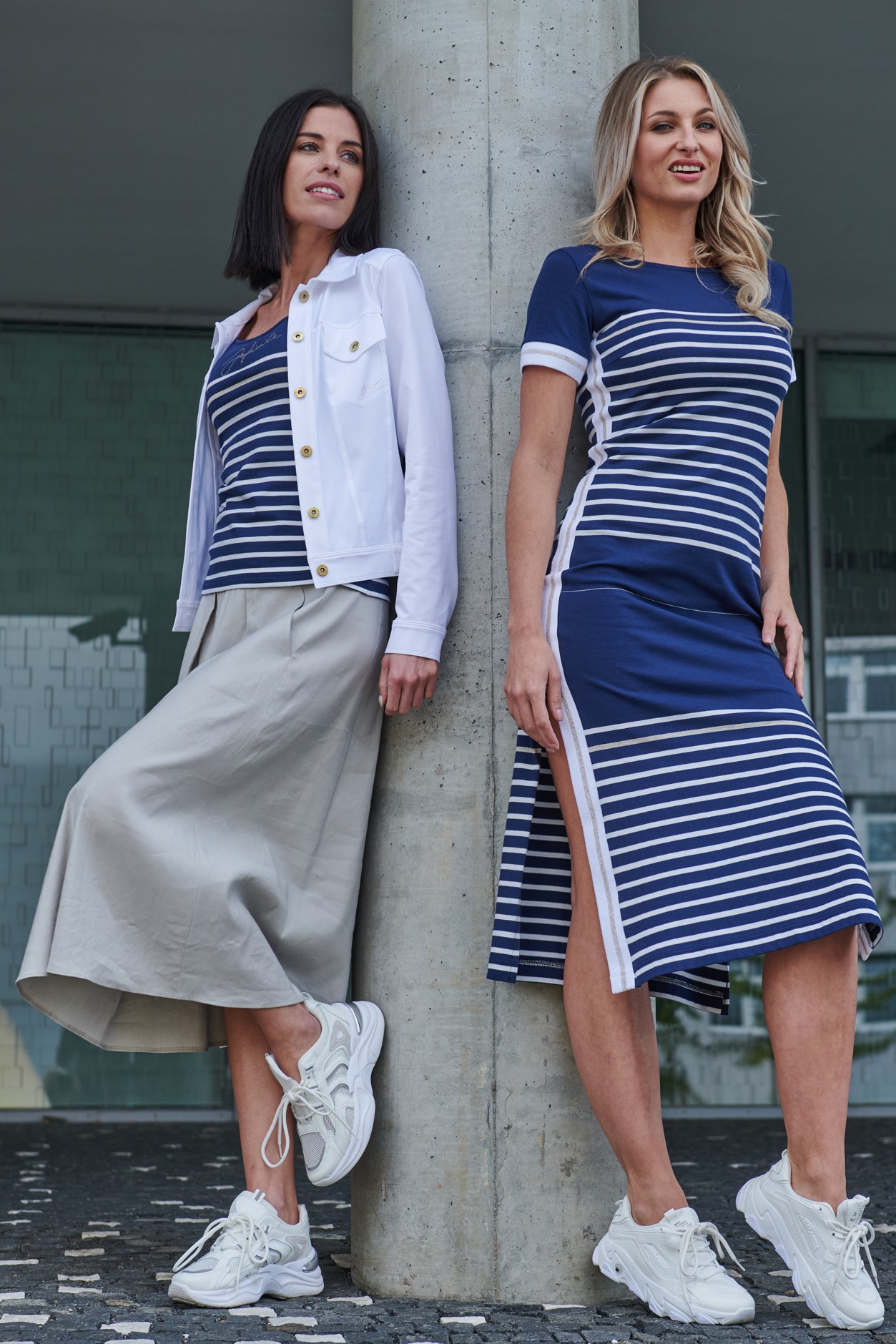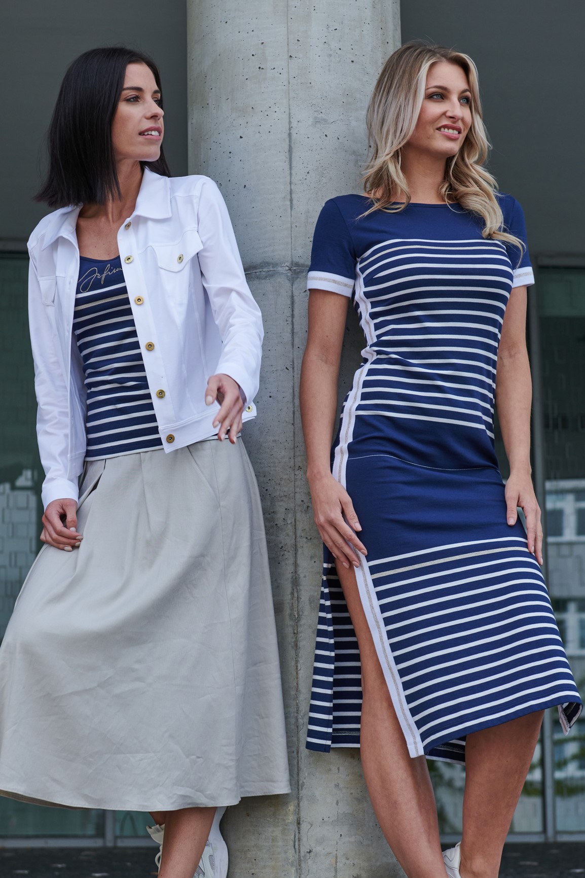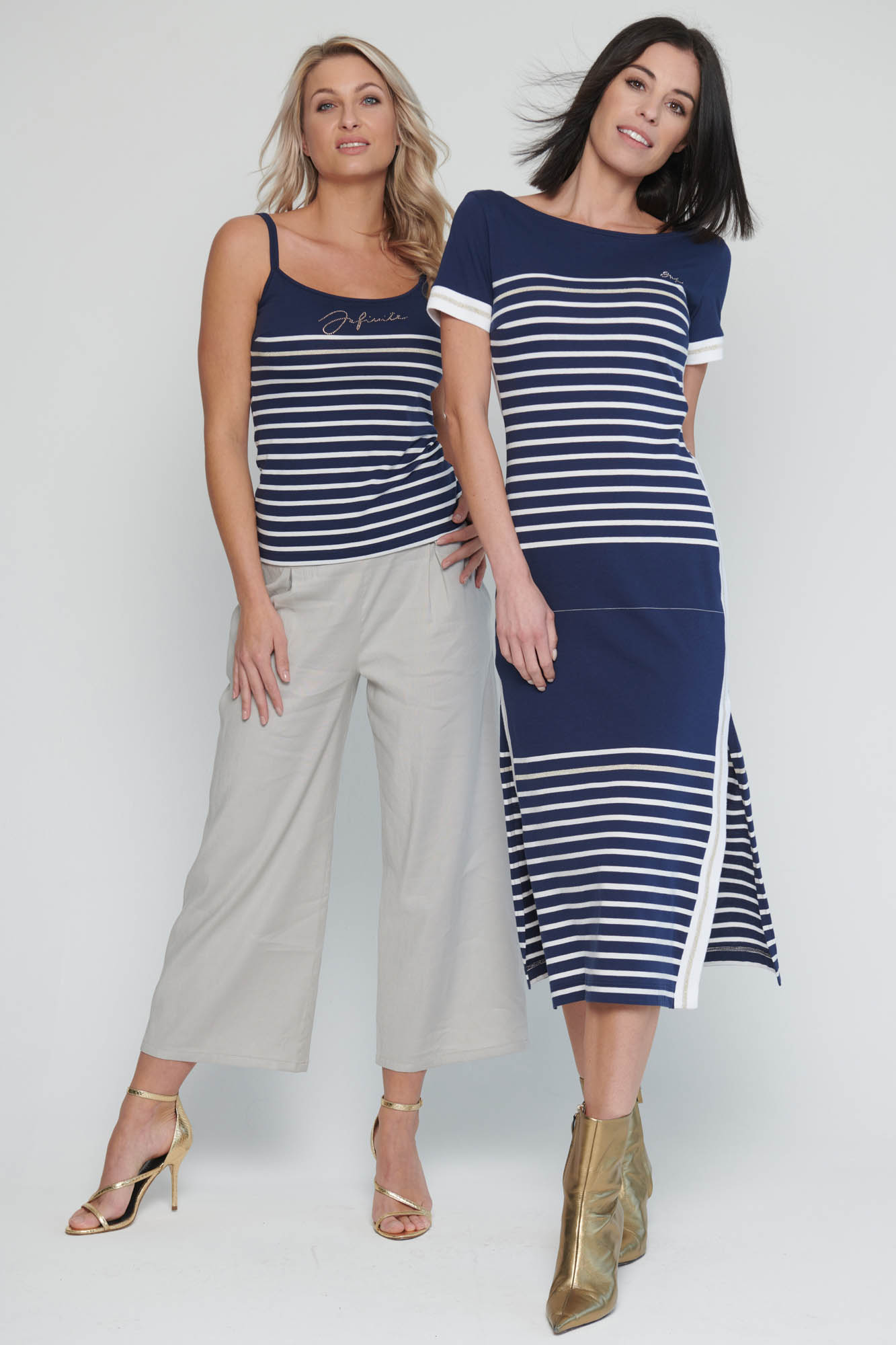 Bestseller INF. Šaty v délce do půlky lýtek. Efektní lampasy na bocích. Rozparky. Na předním díle malé krystalové logo INF.