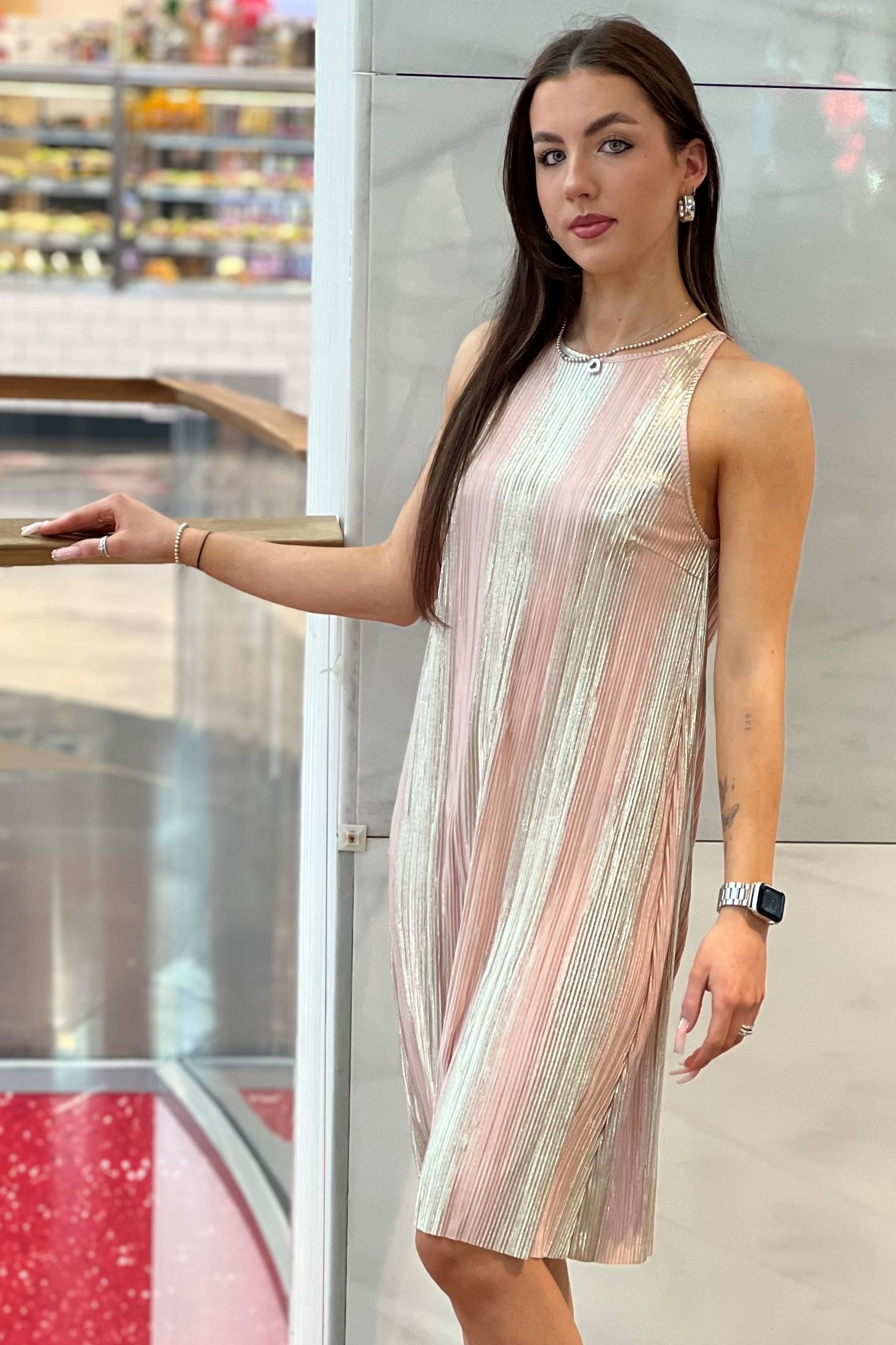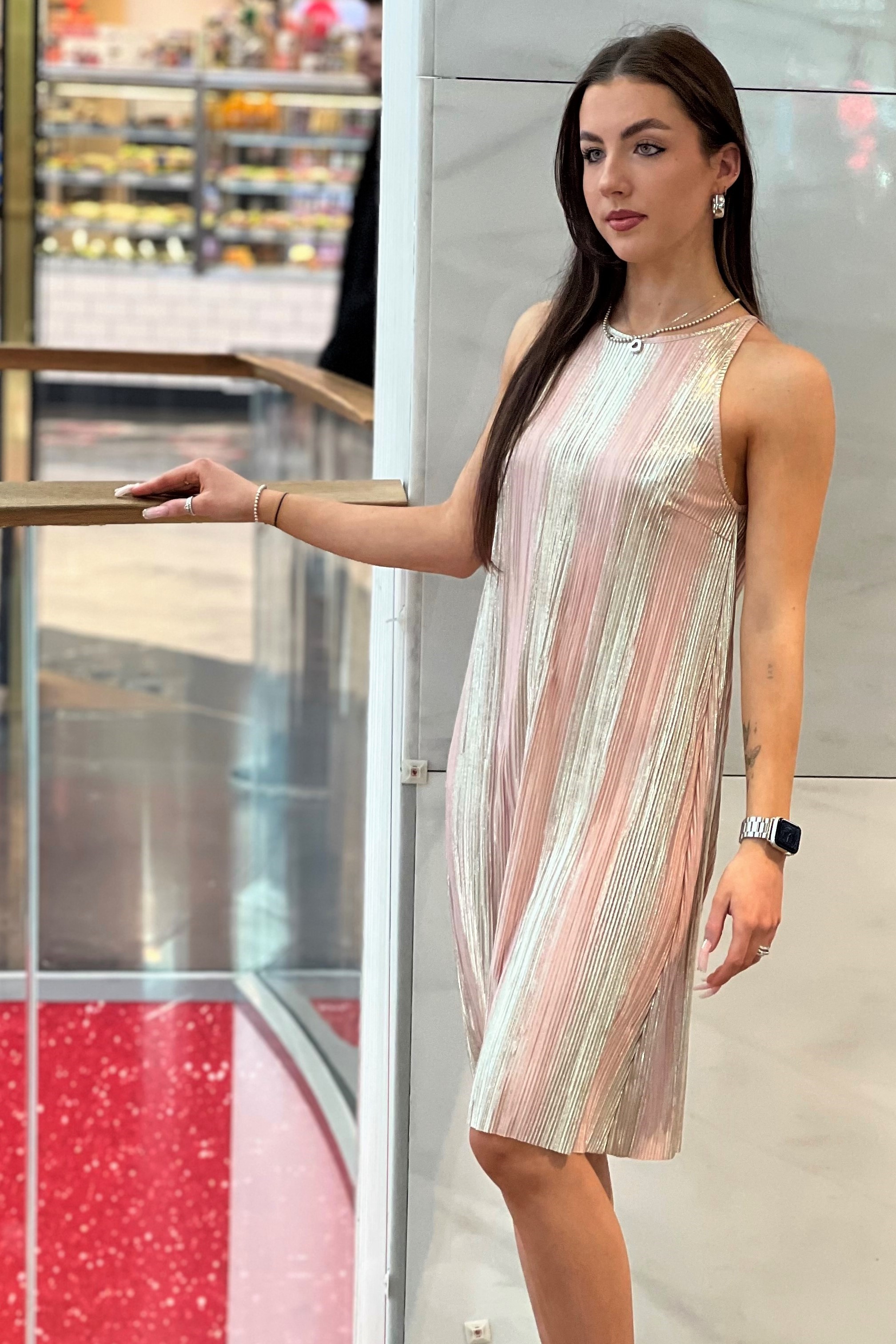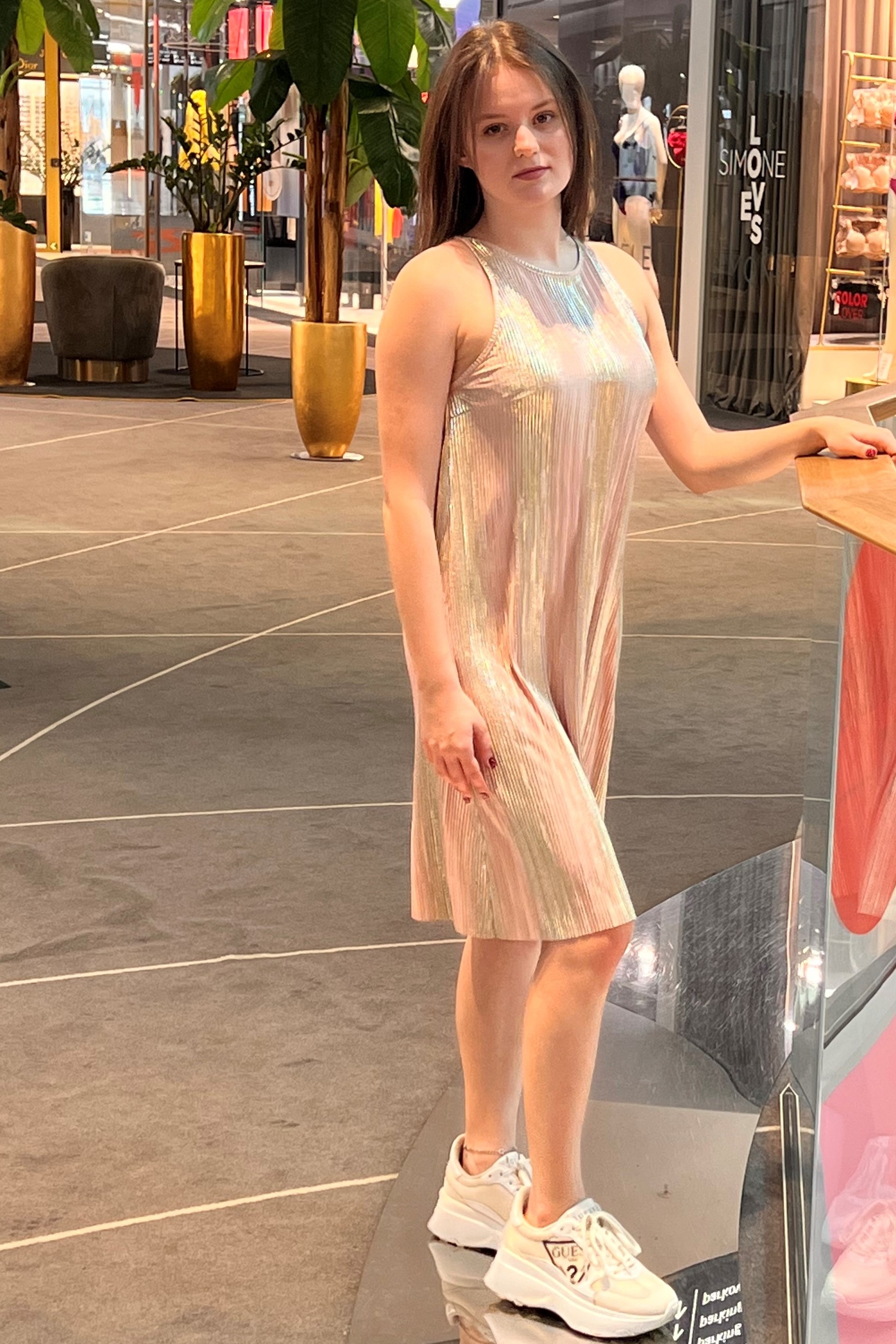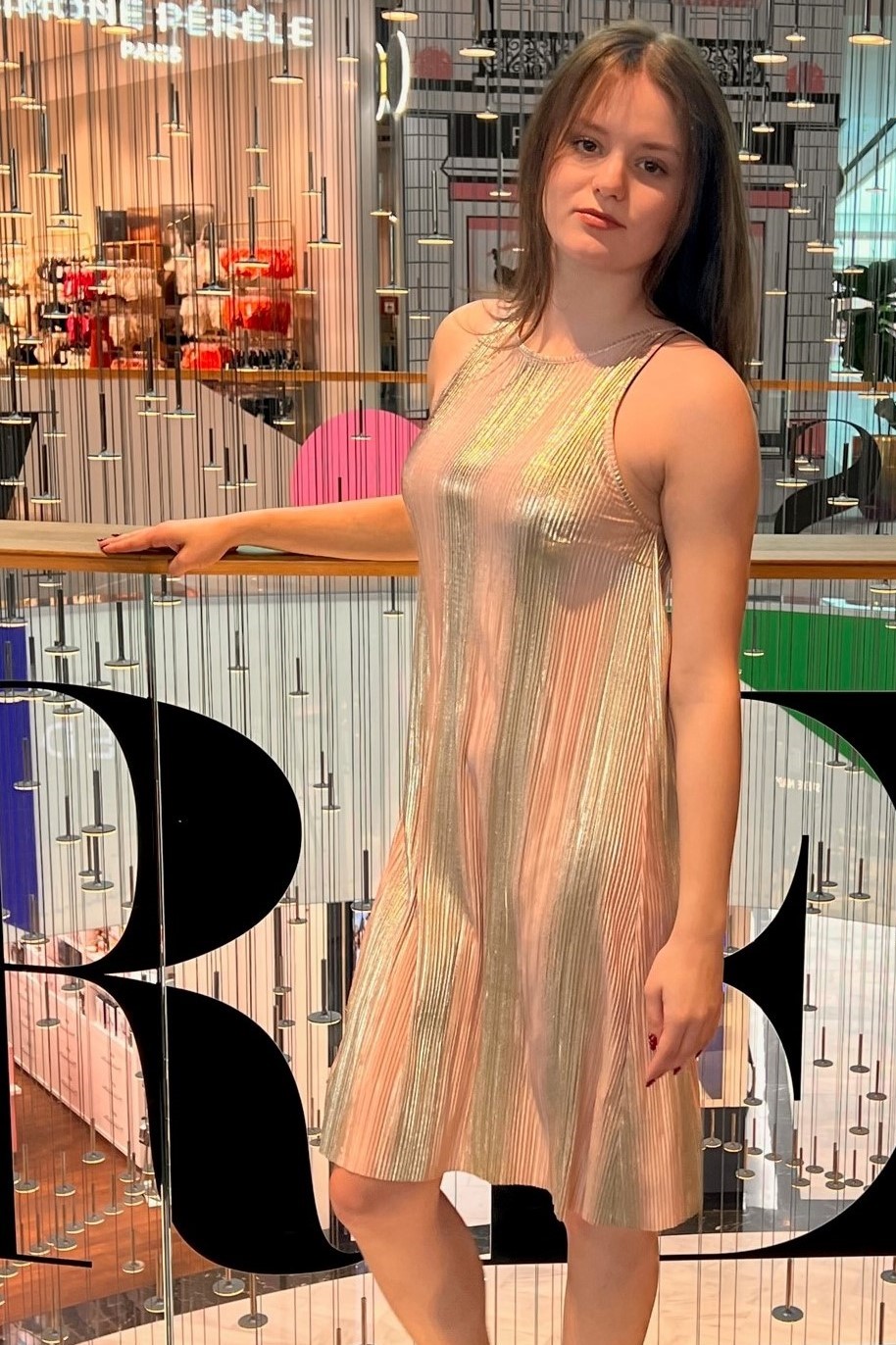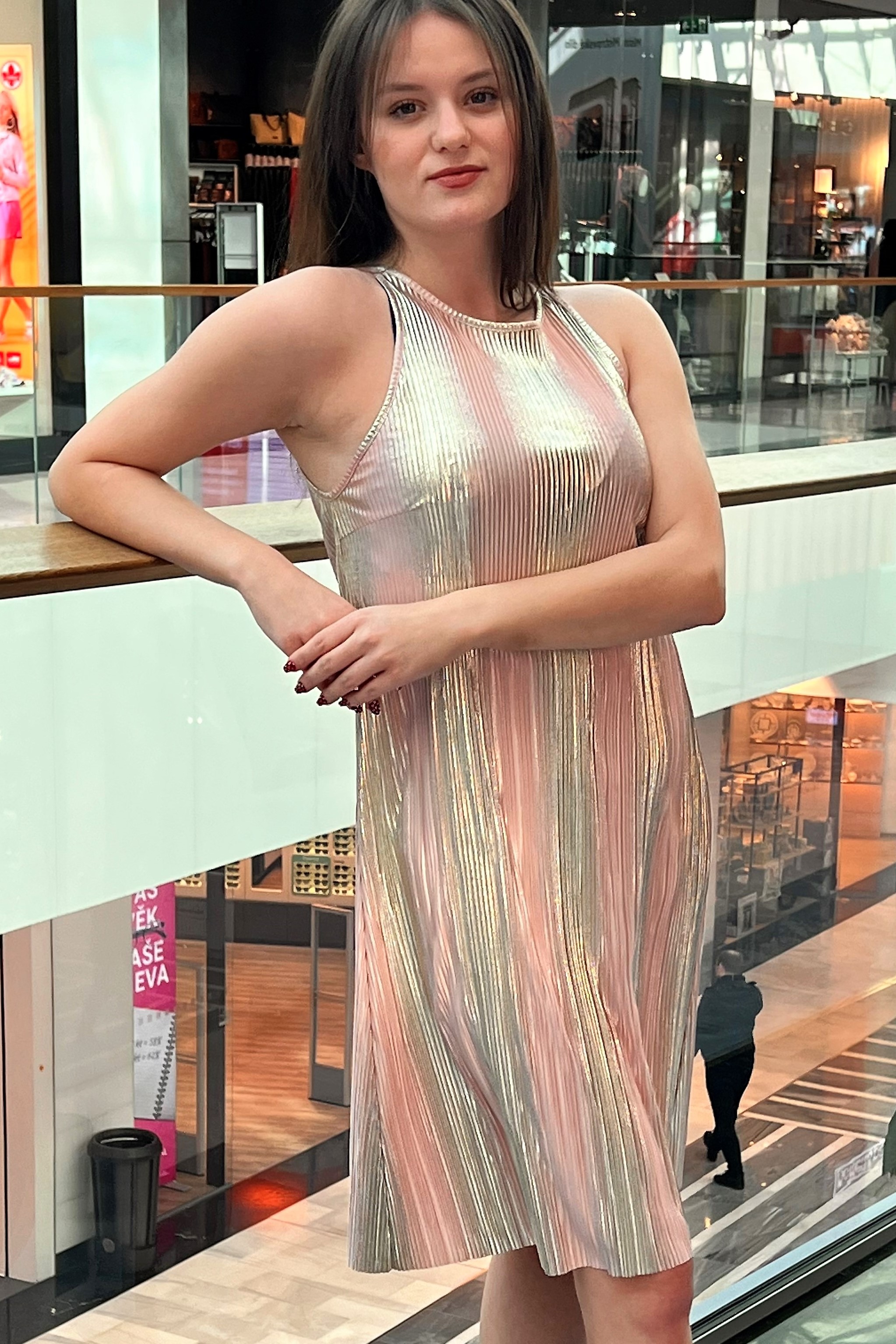 Jednoduché šaty z atraktivního materiálu. V délce lehce rozšířené. Vzadu na zavázání.