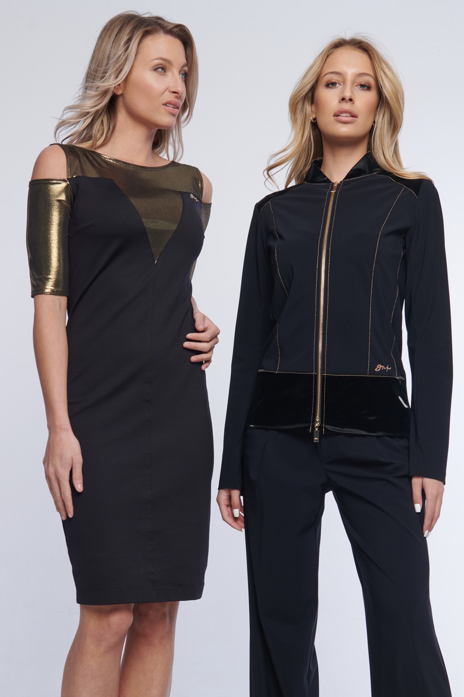 Úpletové černé šaty v kombinaci se zlatým lesklým materiálem. Na předním díle malé zlaté crystalové logo INF. Šaty vhodné na svatbu nebo jinou slavnostní událost.