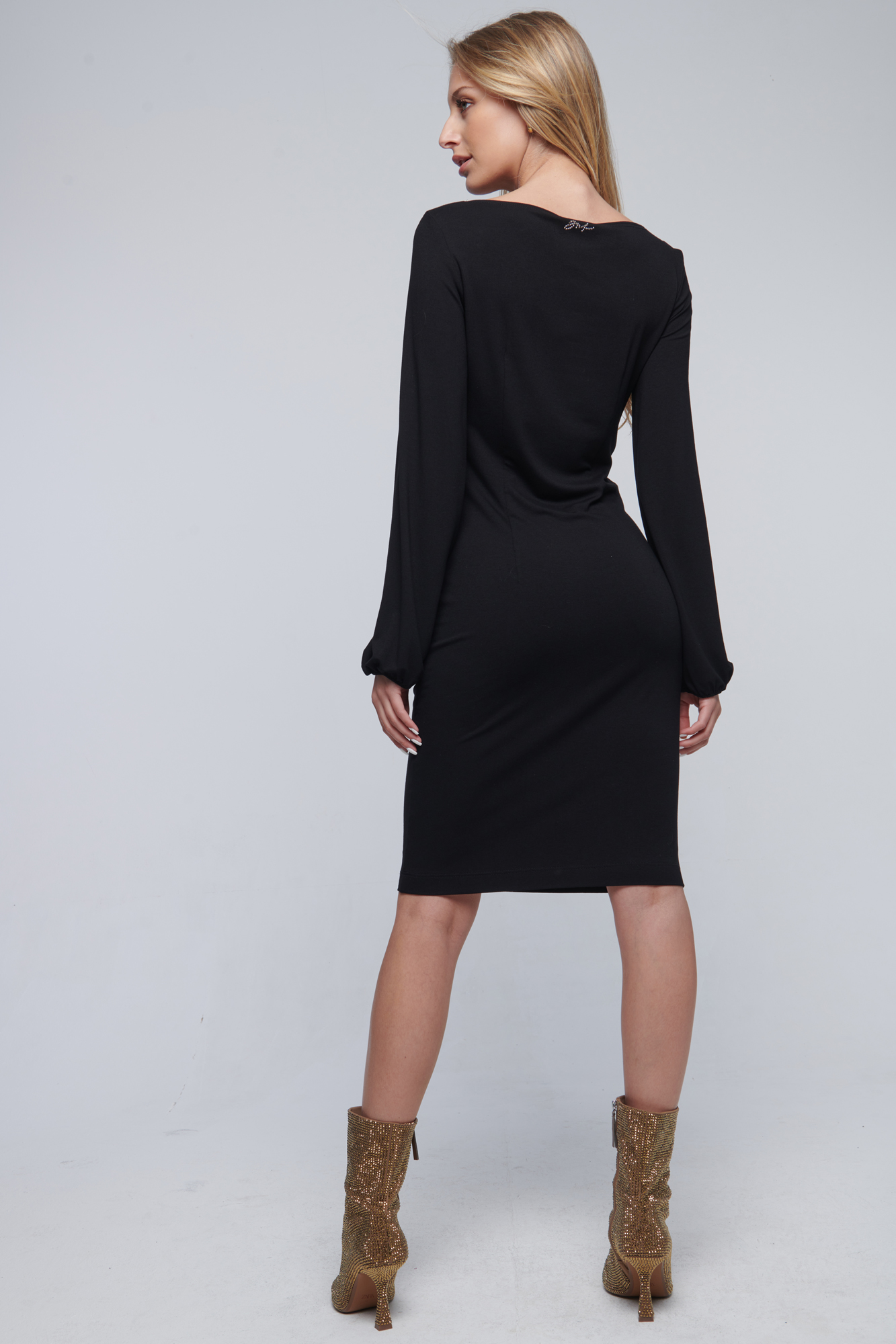 Úpletové tubové šaty. Na předním díle stříbrná spona. Crystalové logo INF.