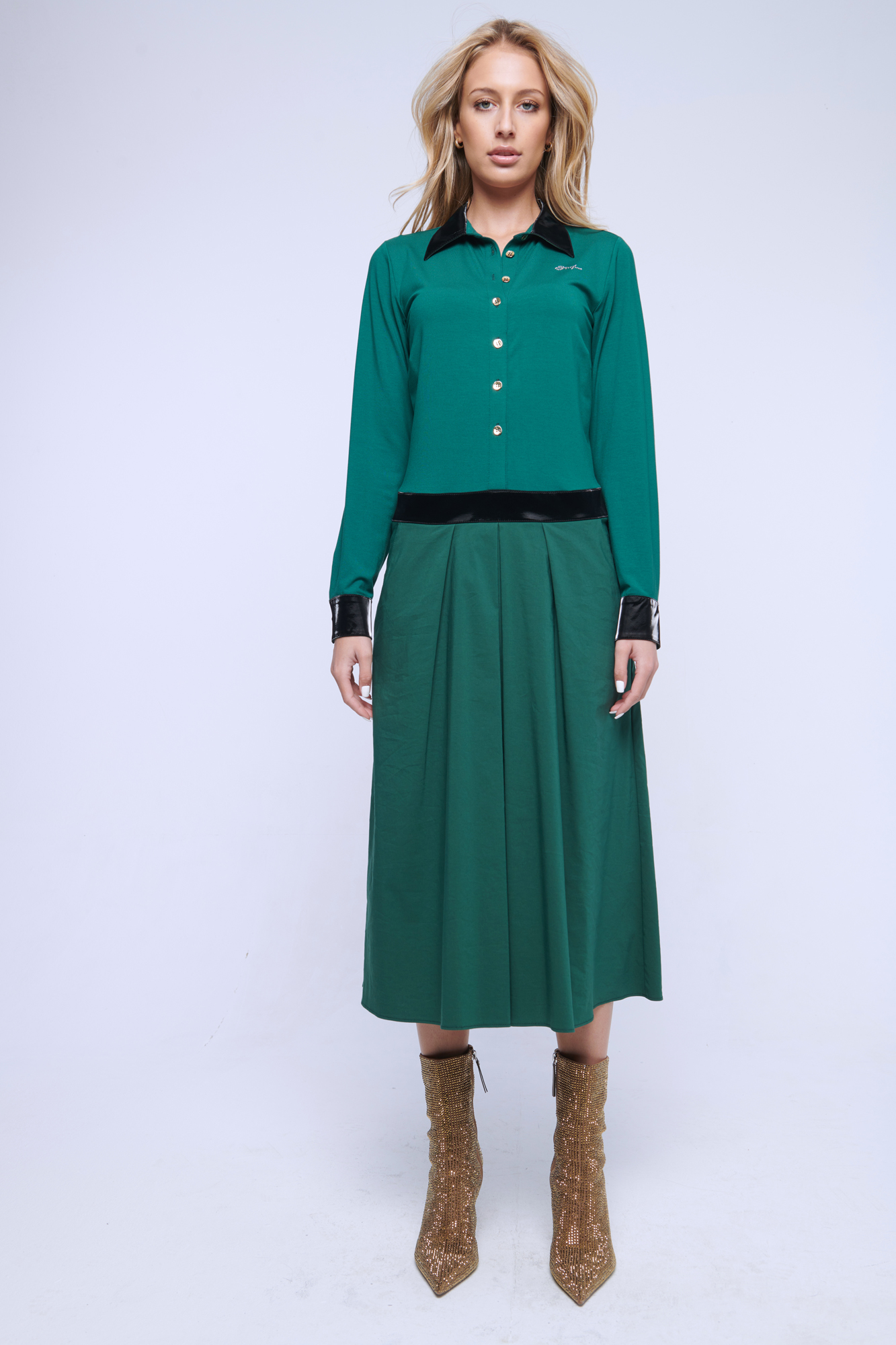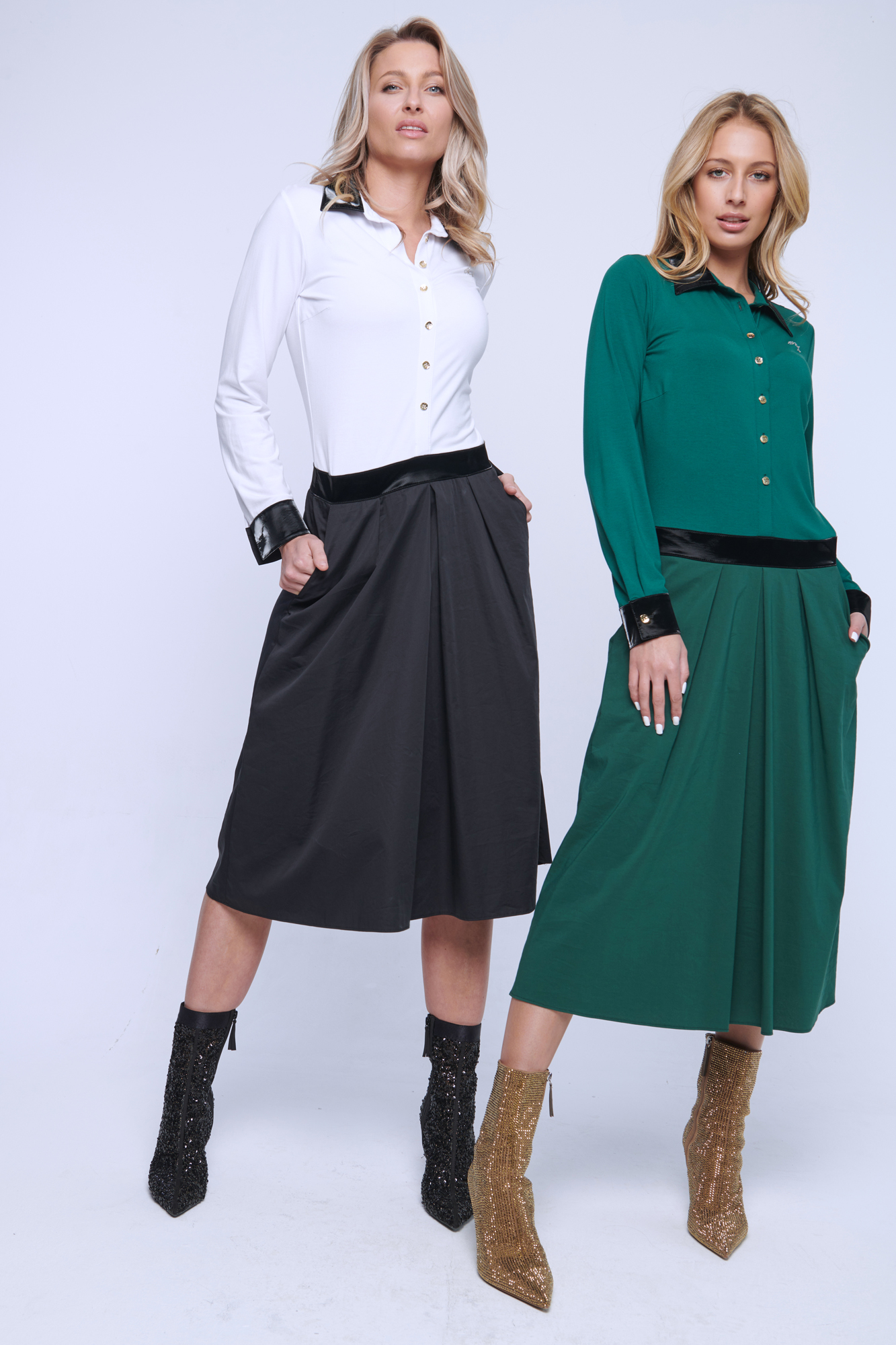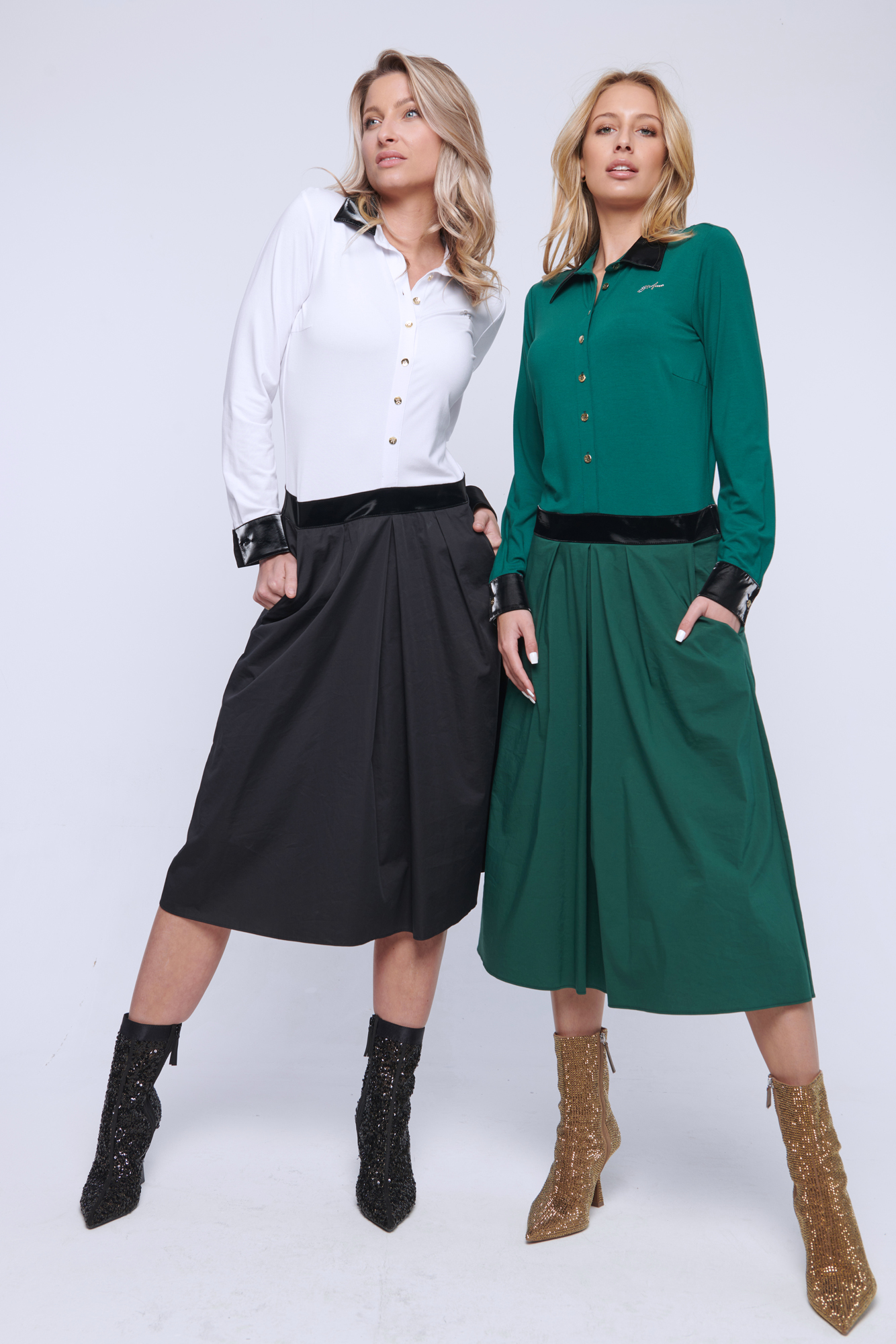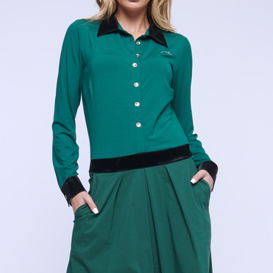 Košilové šaty. V pase, na manžetách a límečku je efektní lakovaný materiál. Na předním díle zlaté crystalové logo INF.