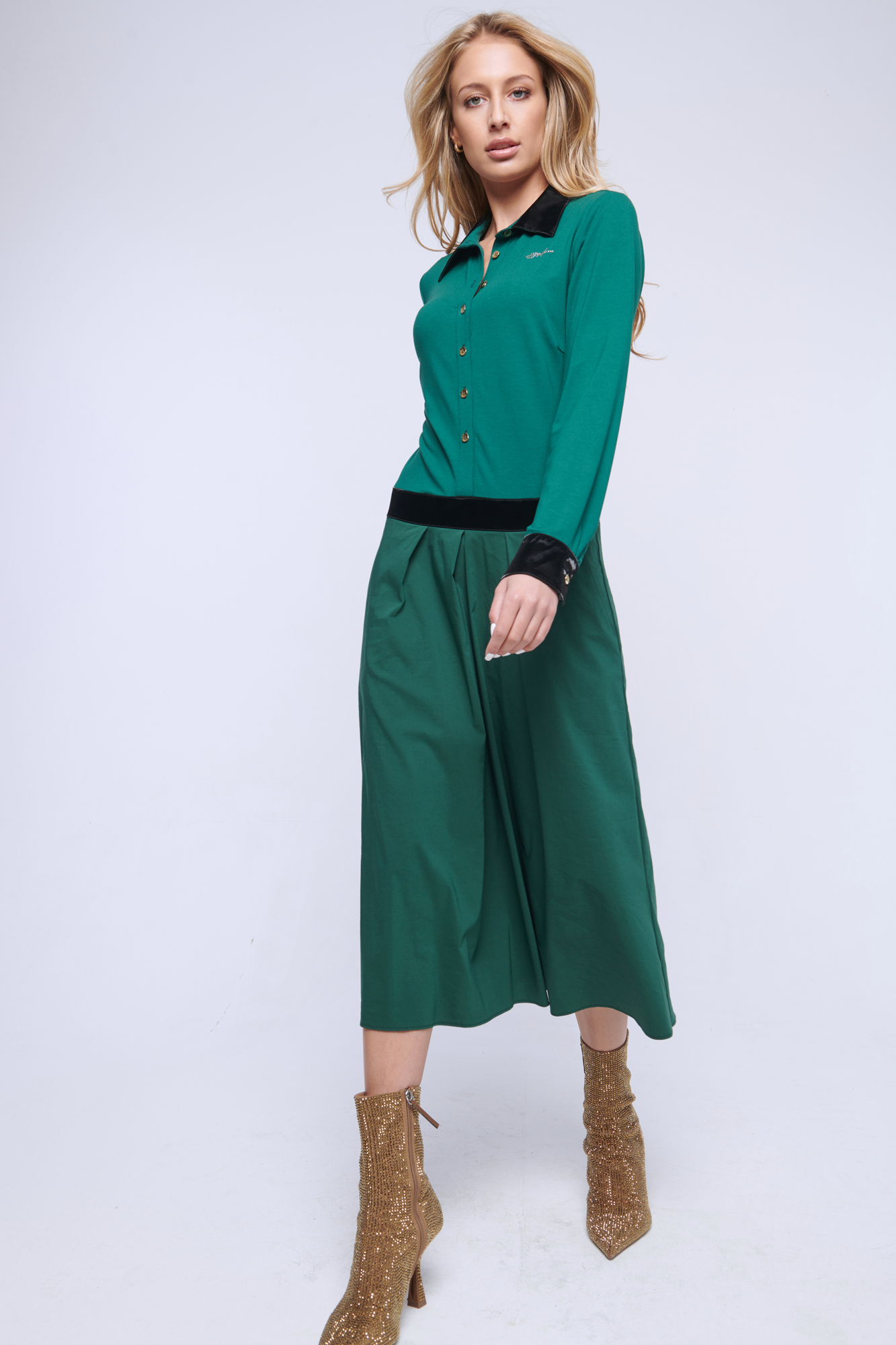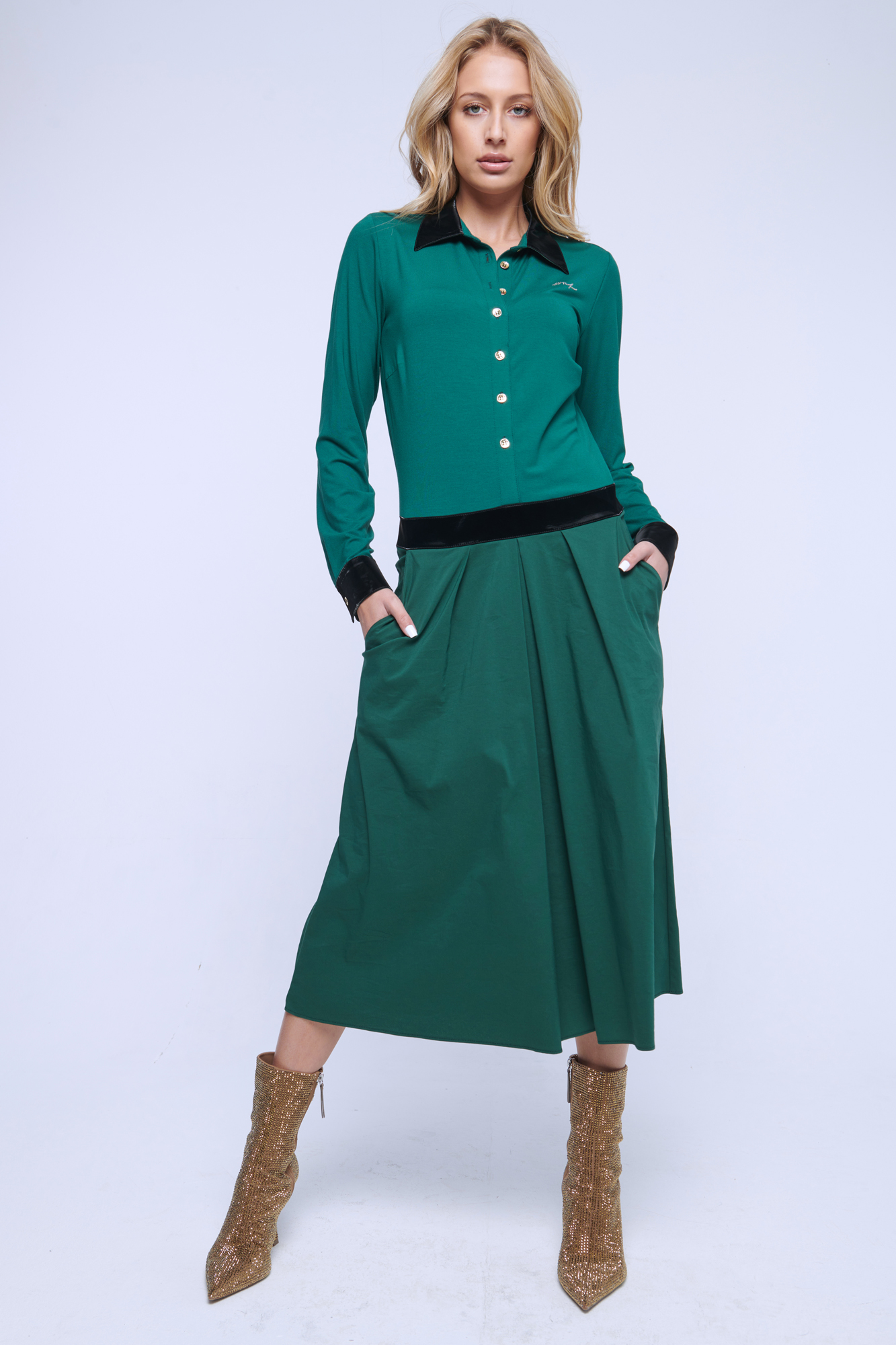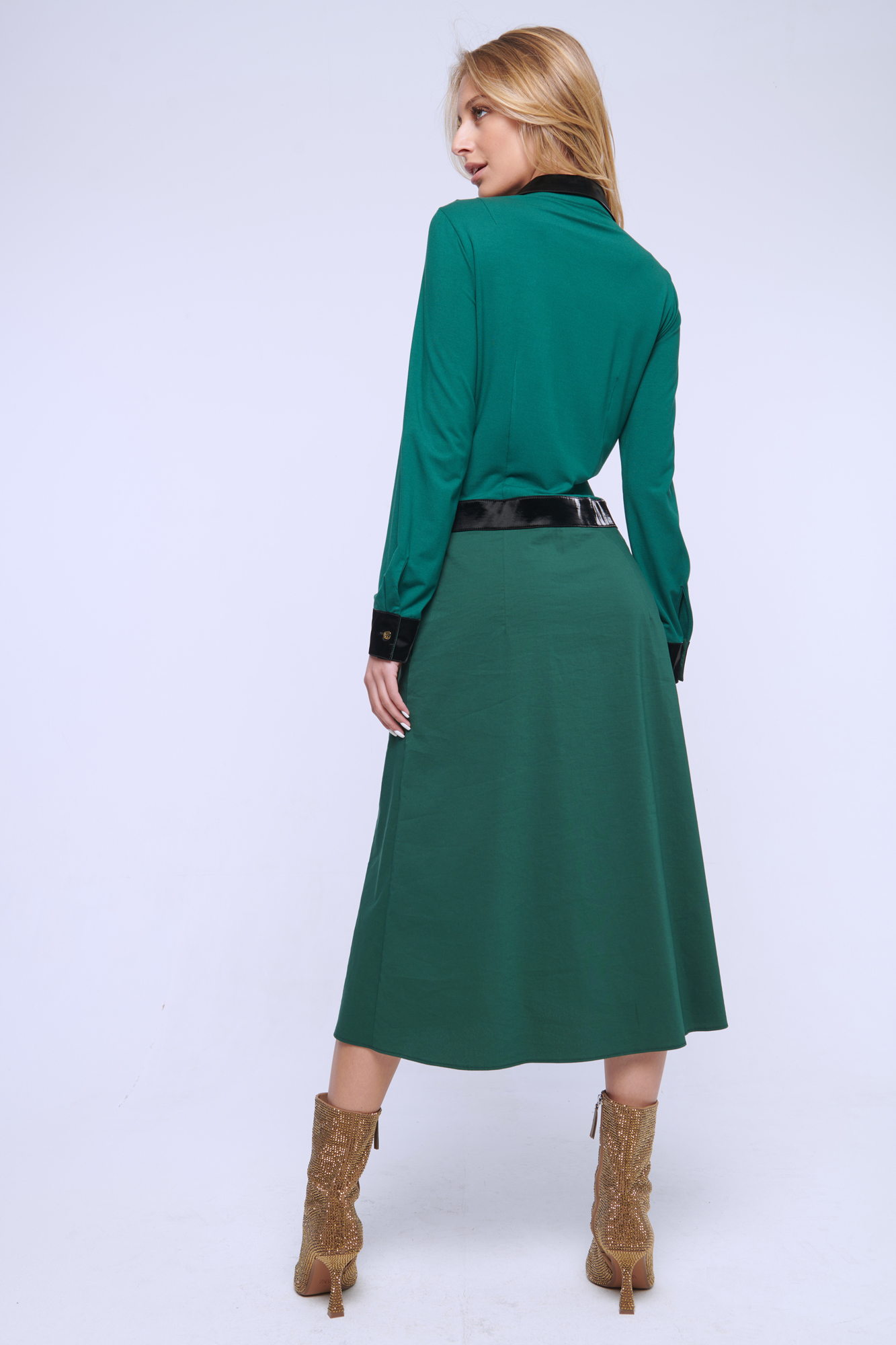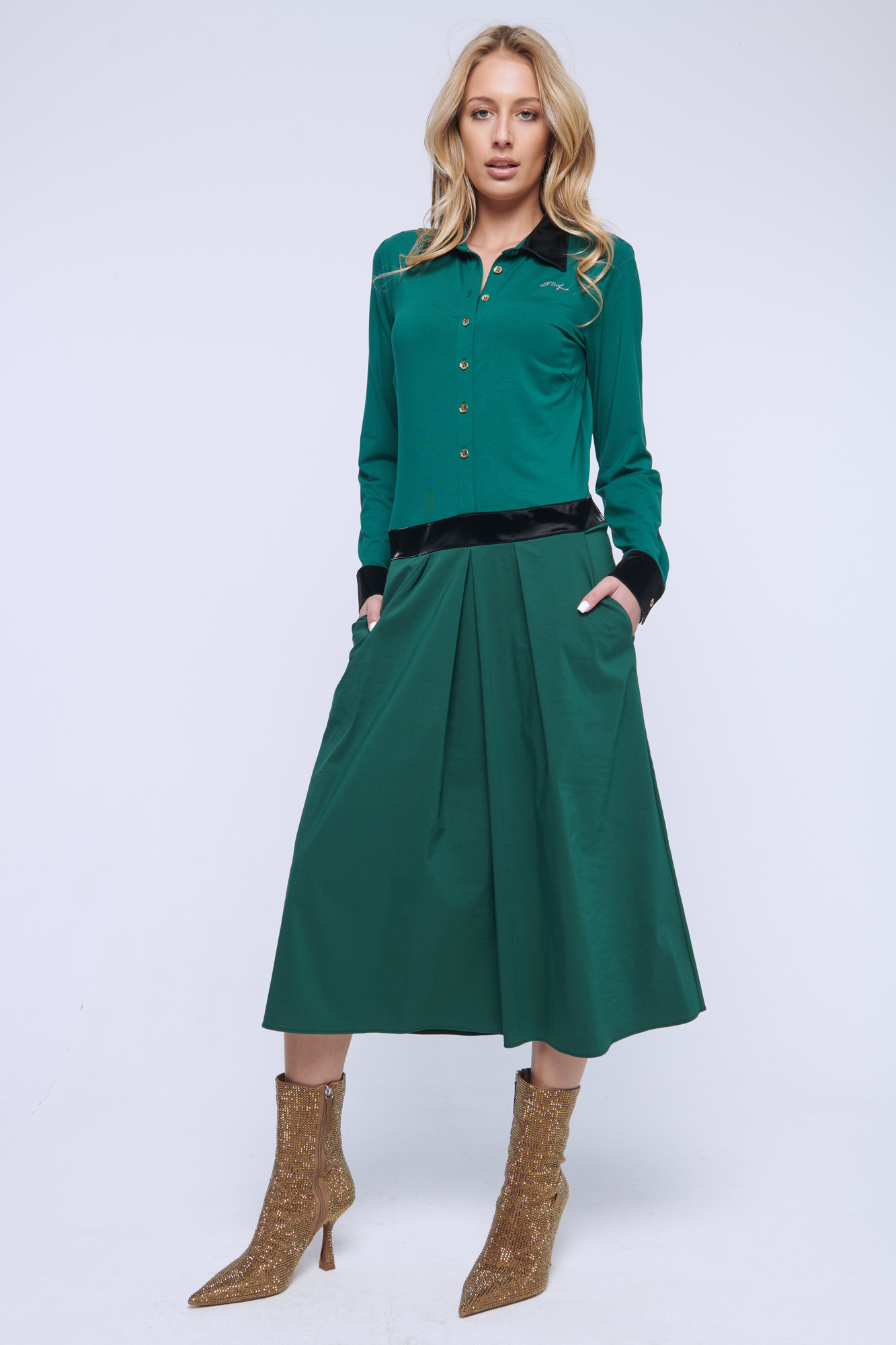 Košilové šaty. V pase, na manžetách a límečku je efektní lakovaný materiál. Na předním díle zlaté crystalové logo INF.