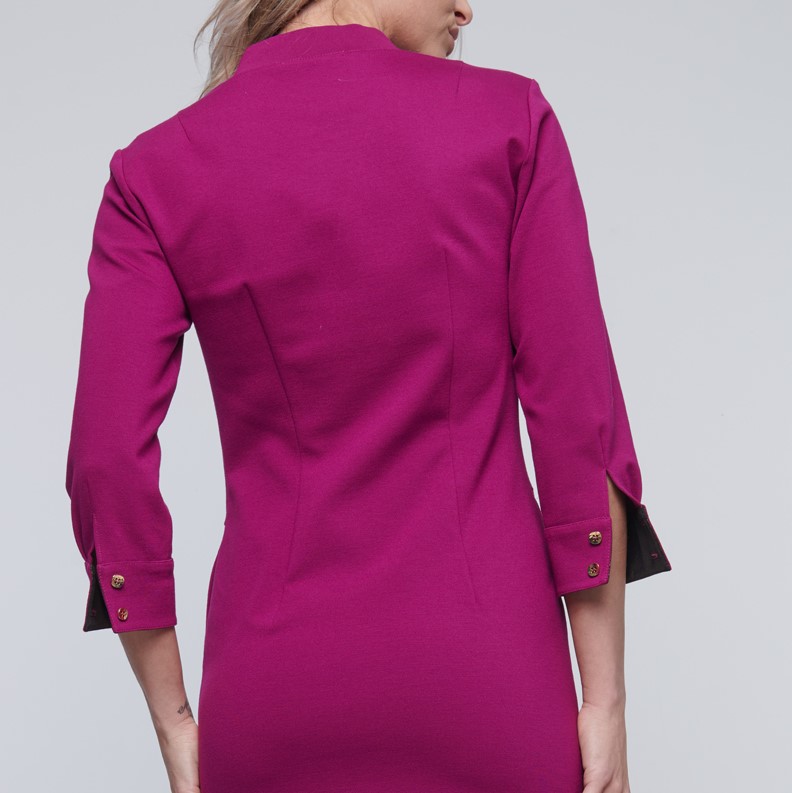 Bussiness šaty se stojákem v kombinaci s efektním zlatým materiálem. Zlaté doplňky a zlaté crystalové logo INF na kapse.