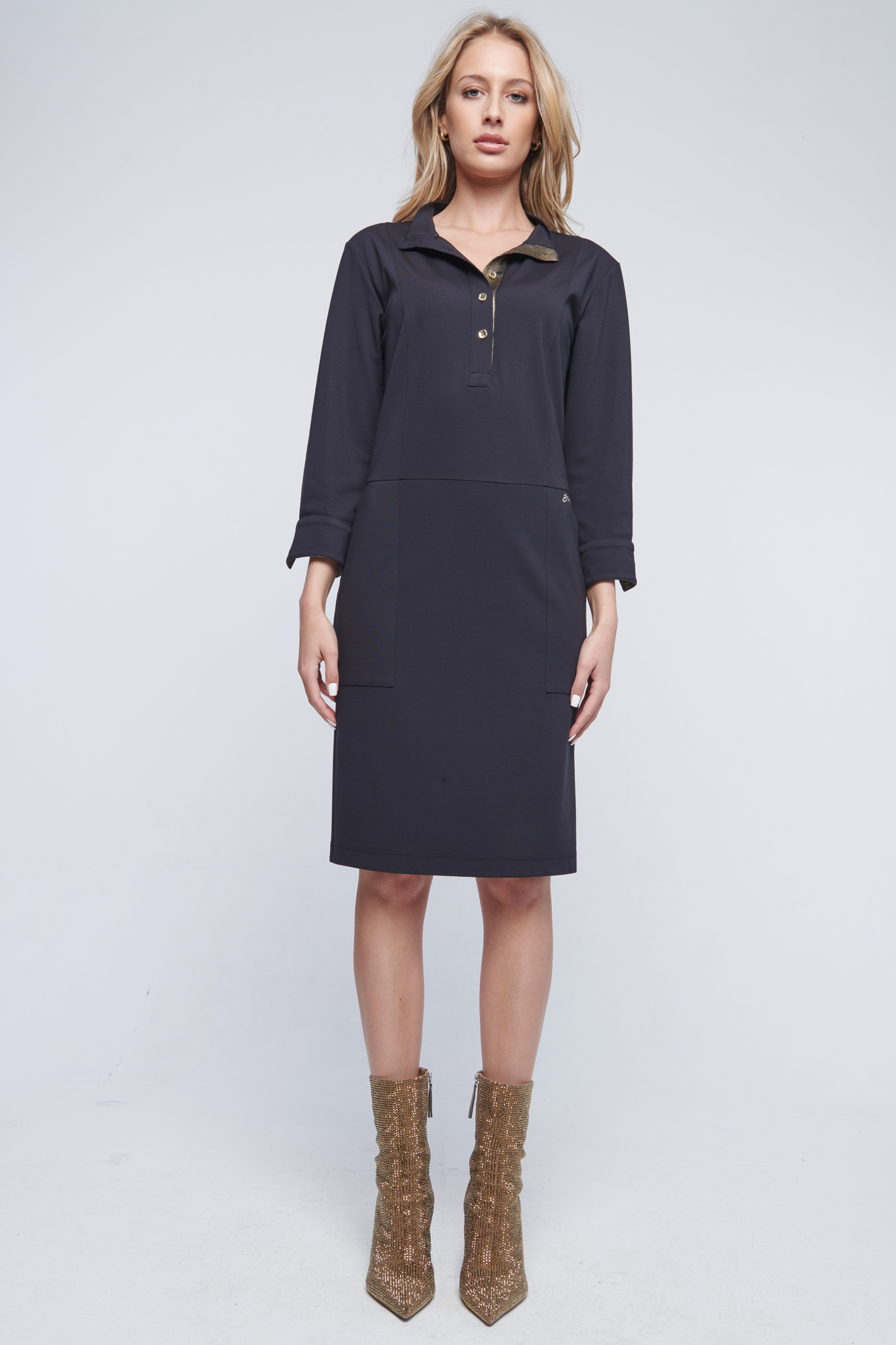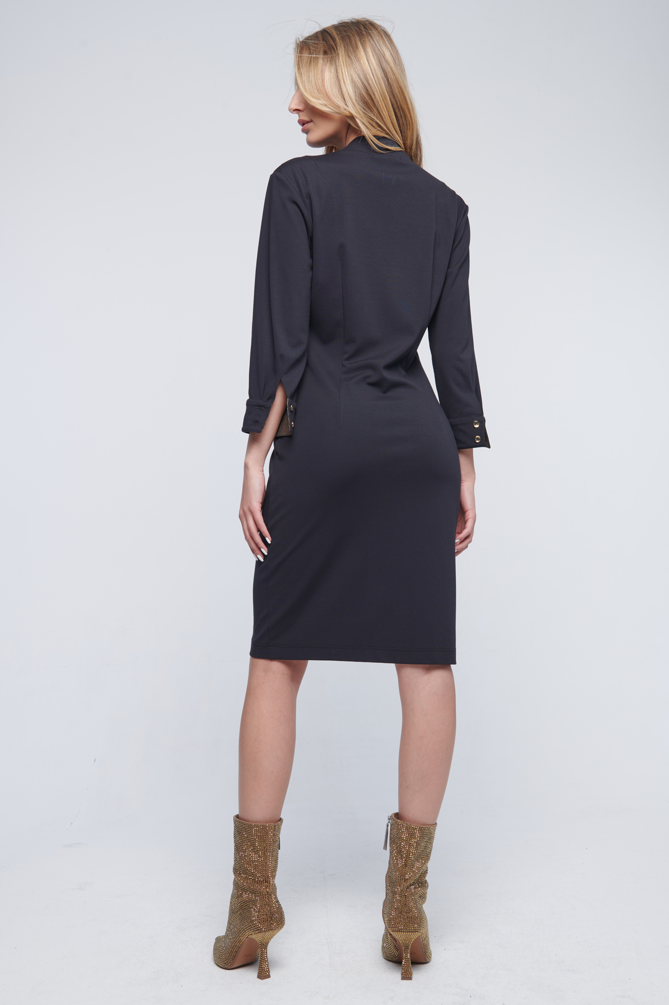 Bussiness šaty se stojákem v kombinaci s efektním zlatým materiálem. Zlaté doplňky a zlaté crystalové logo INF na kapse.