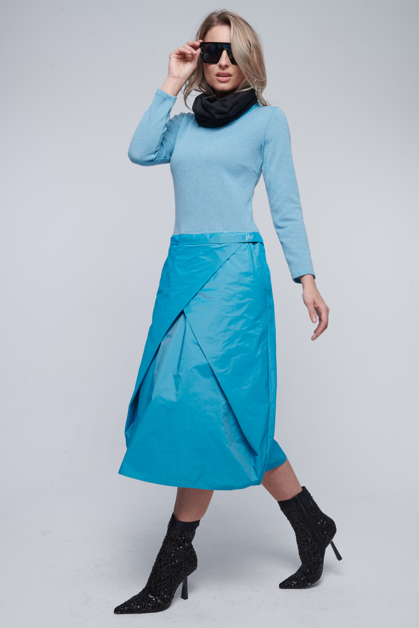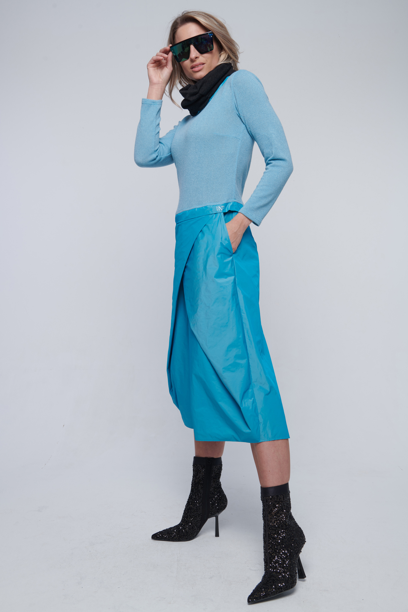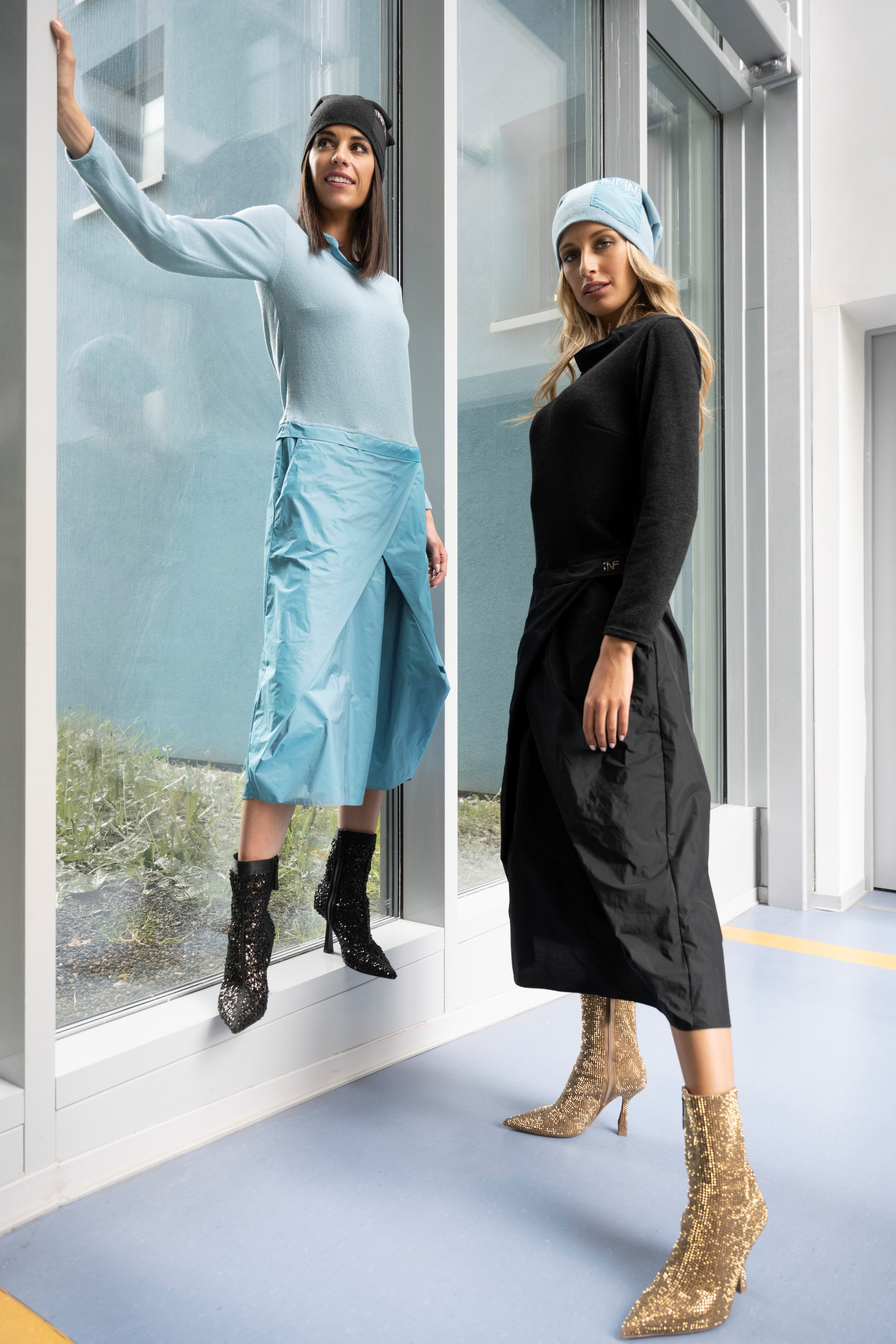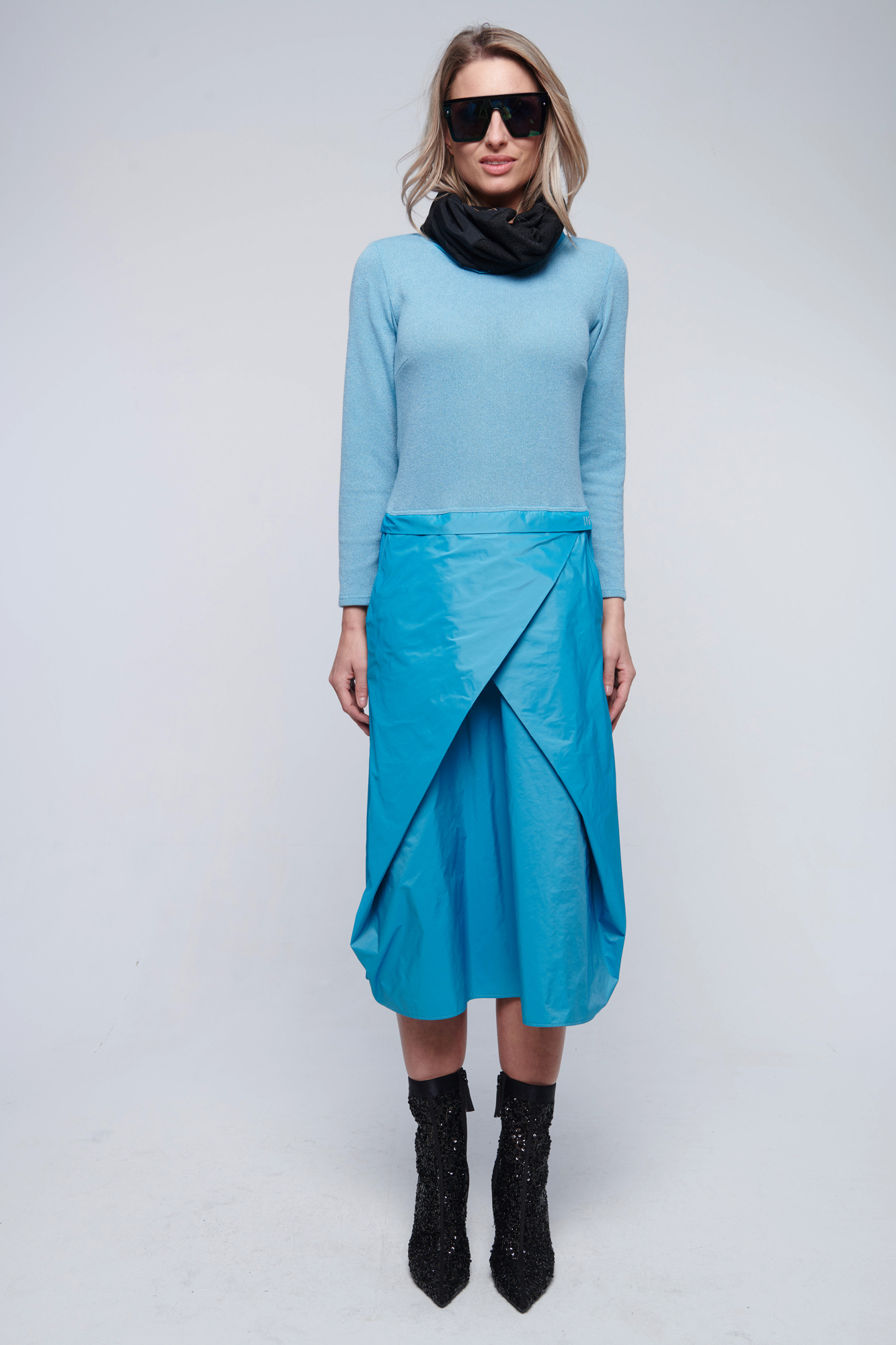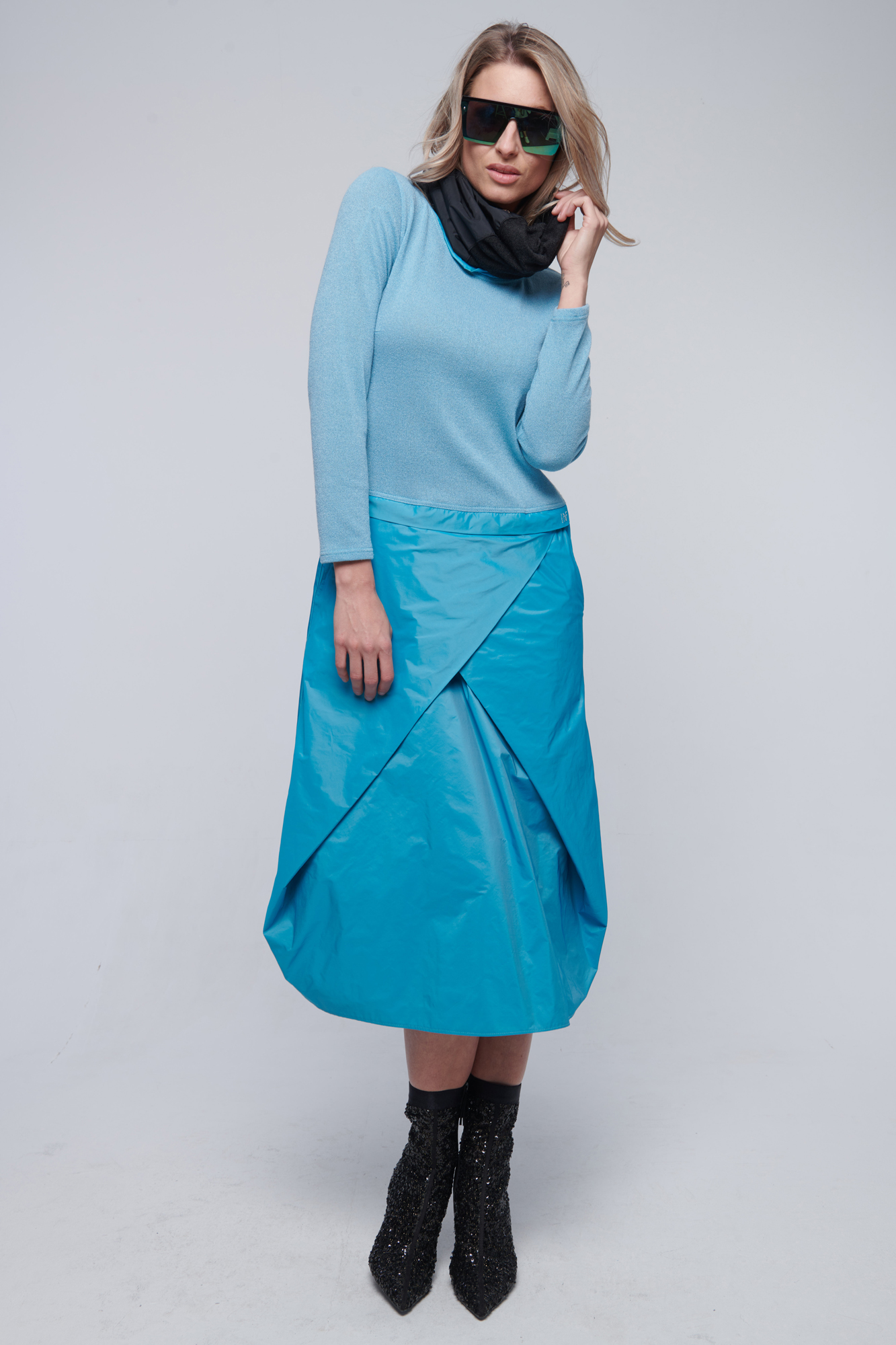 Módní šaty se šusťákovou sukní. Vrchní díl z pletáže. V pase efektní crystaly INF.
