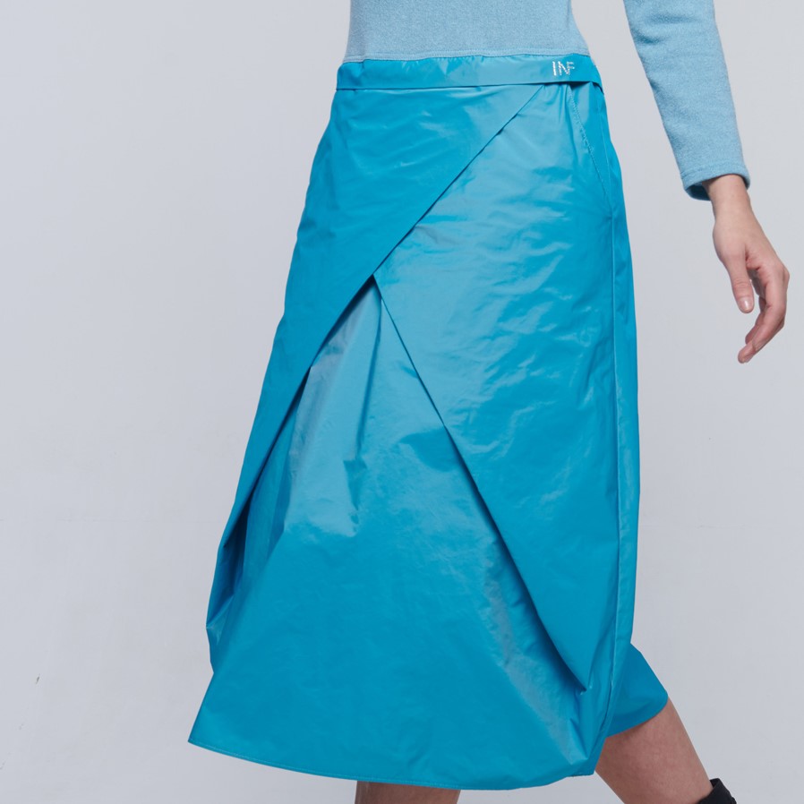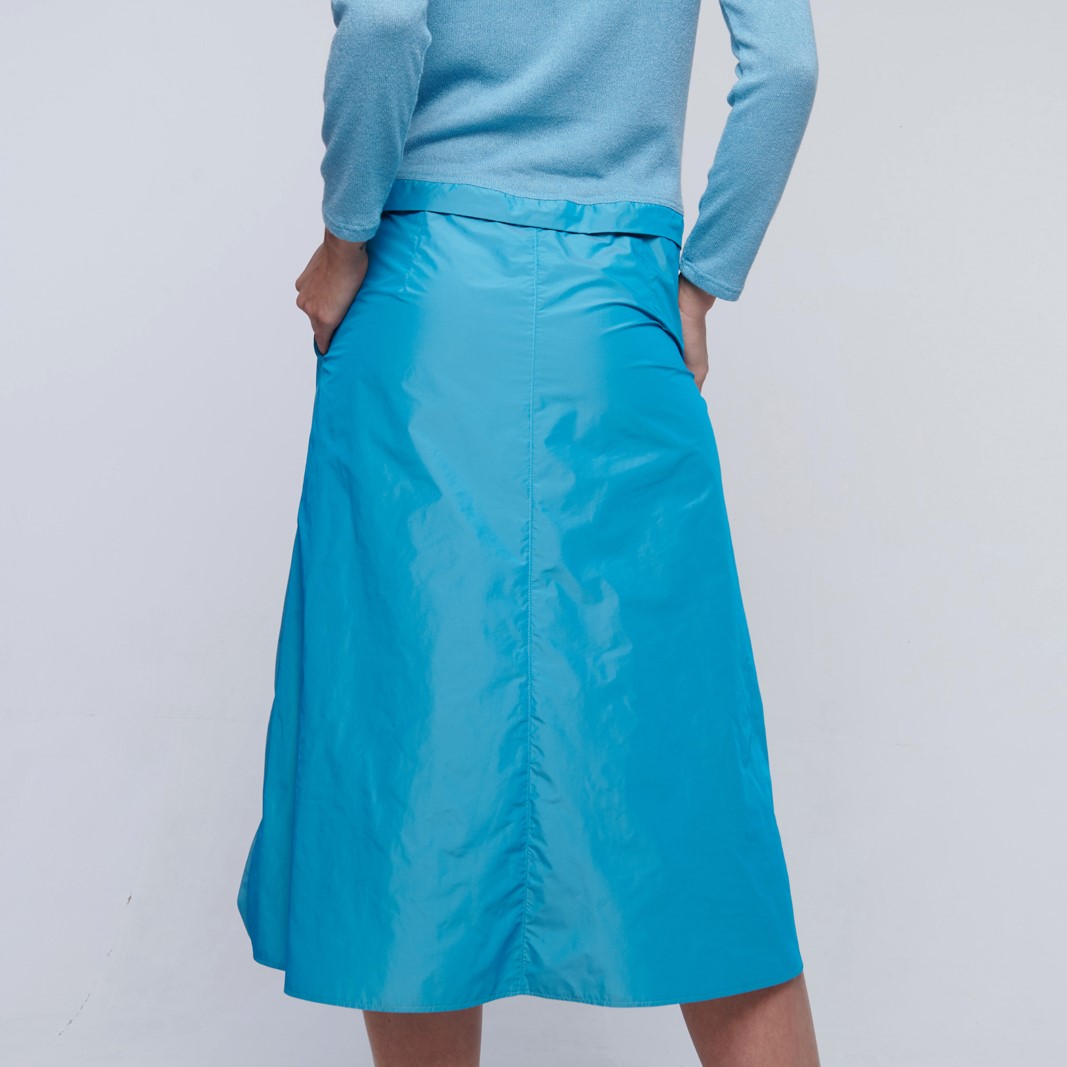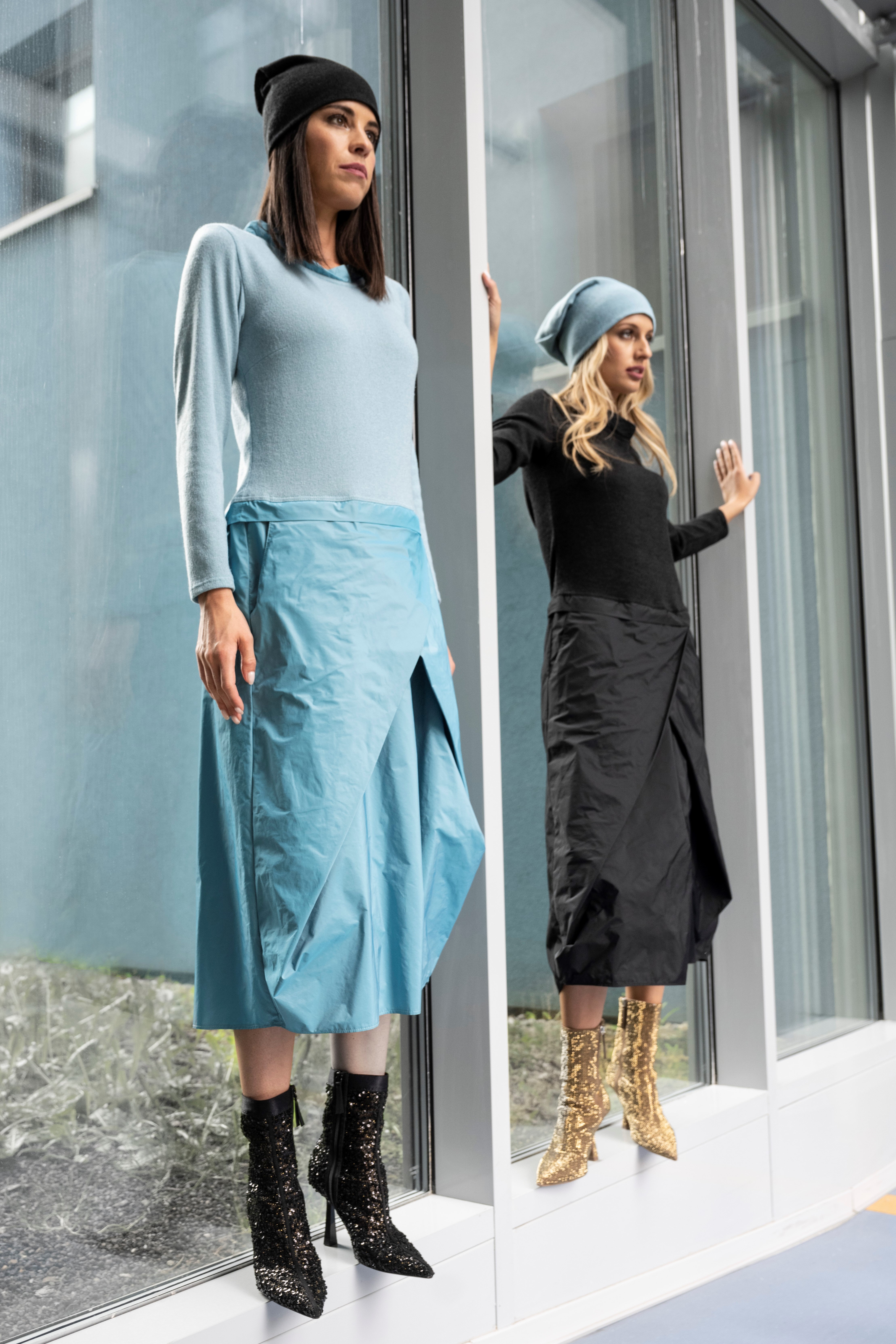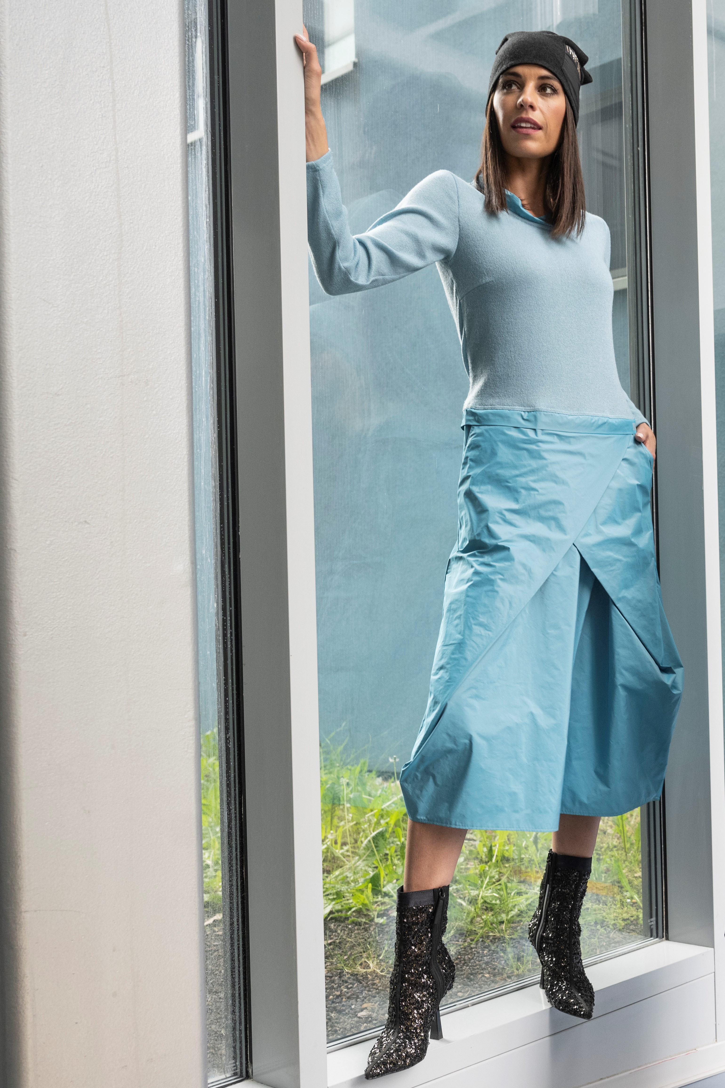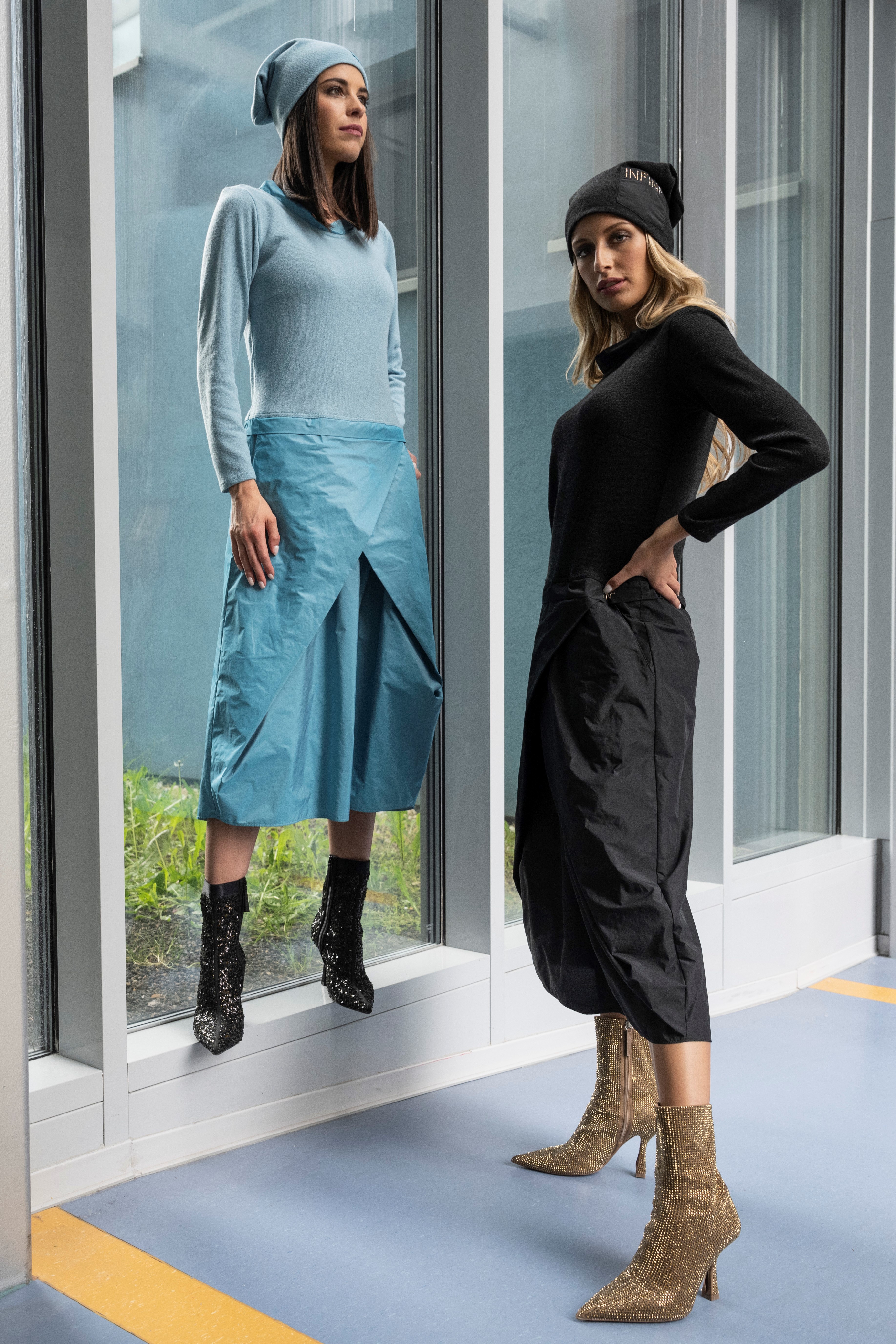 Módní šaty se šusťákovou sukní. Vrchní díl z pletáže. V pase efektní crystaly INF.