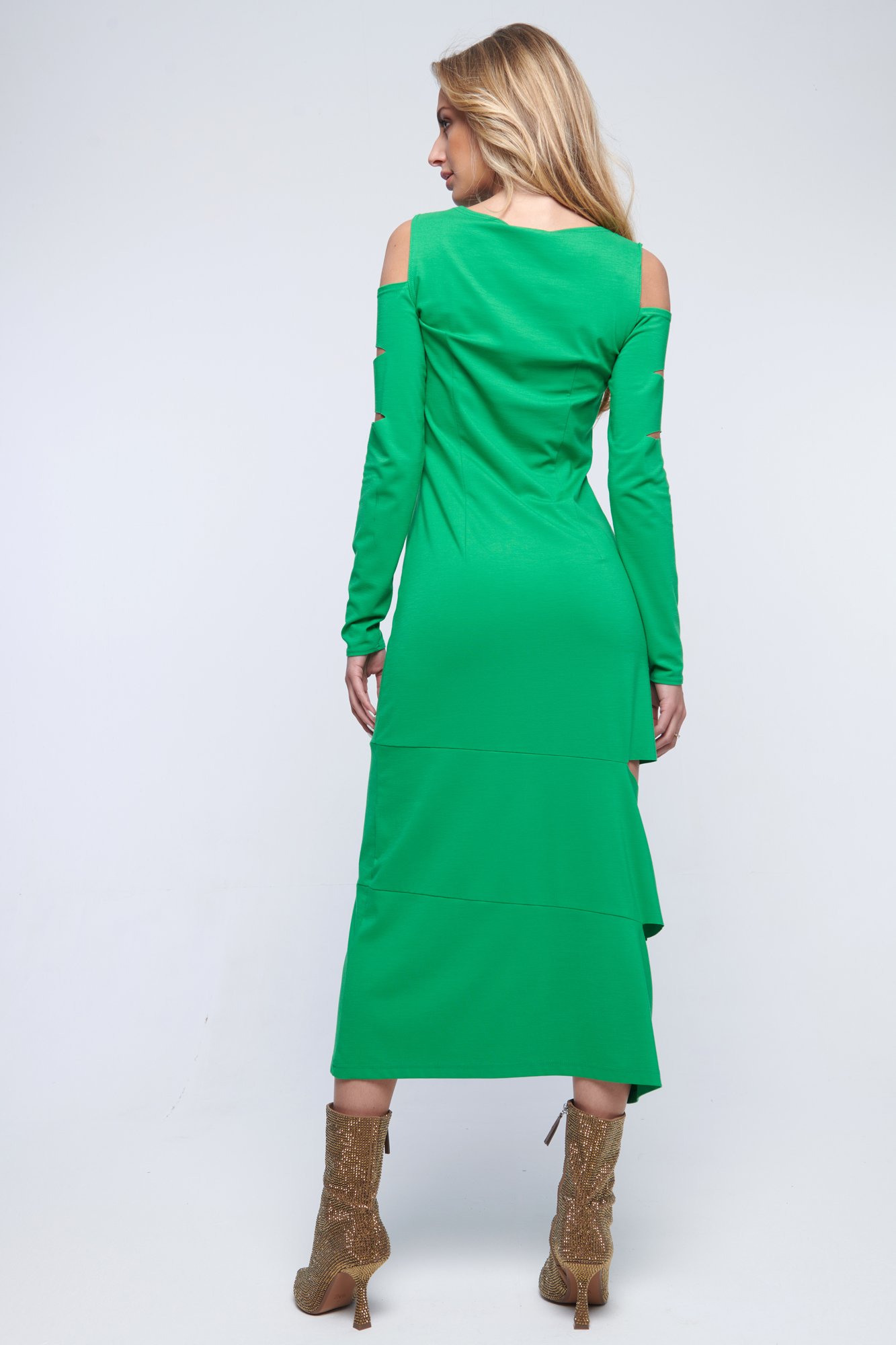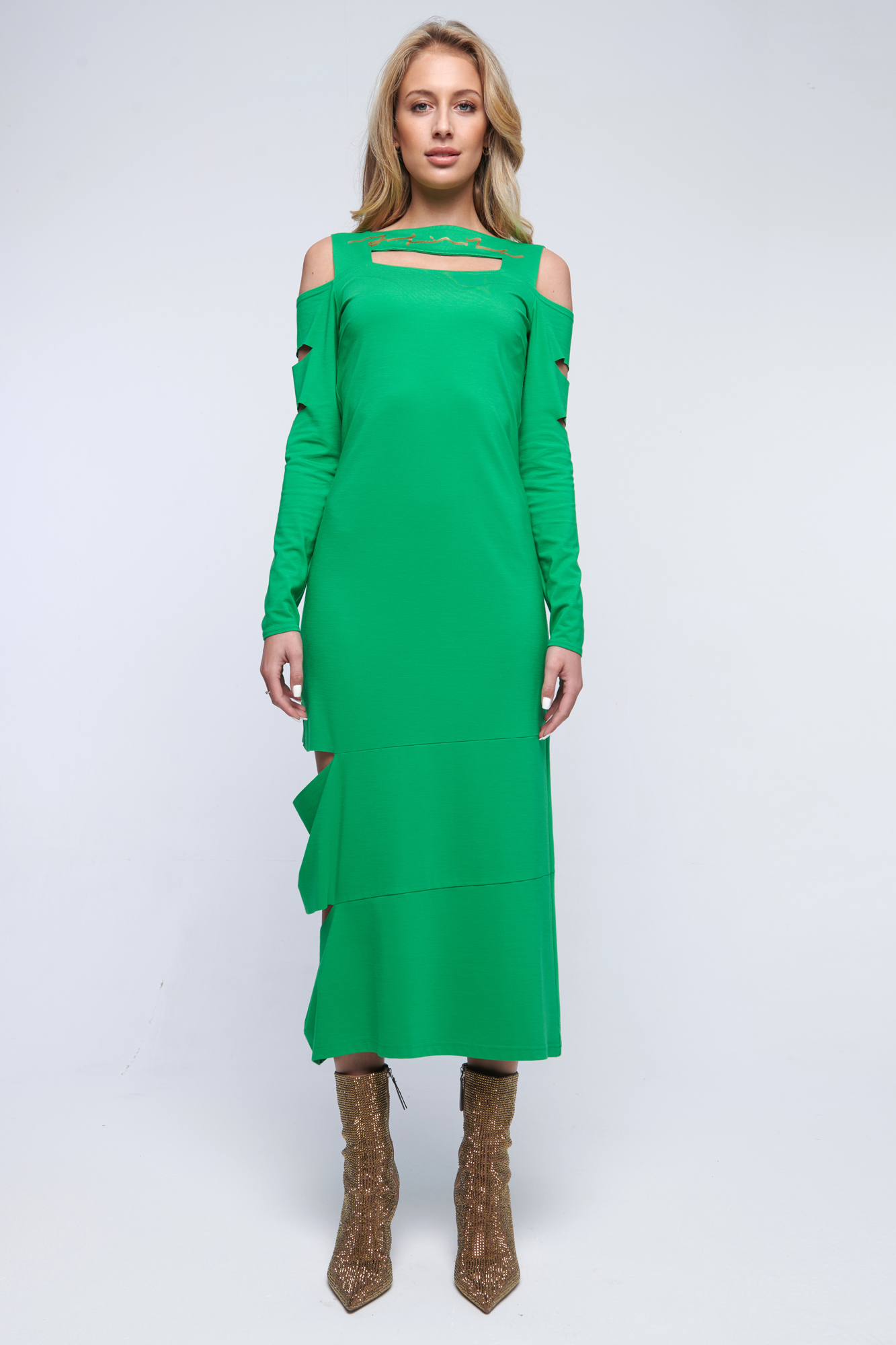 Na rukávech a v délce sukně průstřihy. Na předním díle zlatý glitrový tisk Infinite.