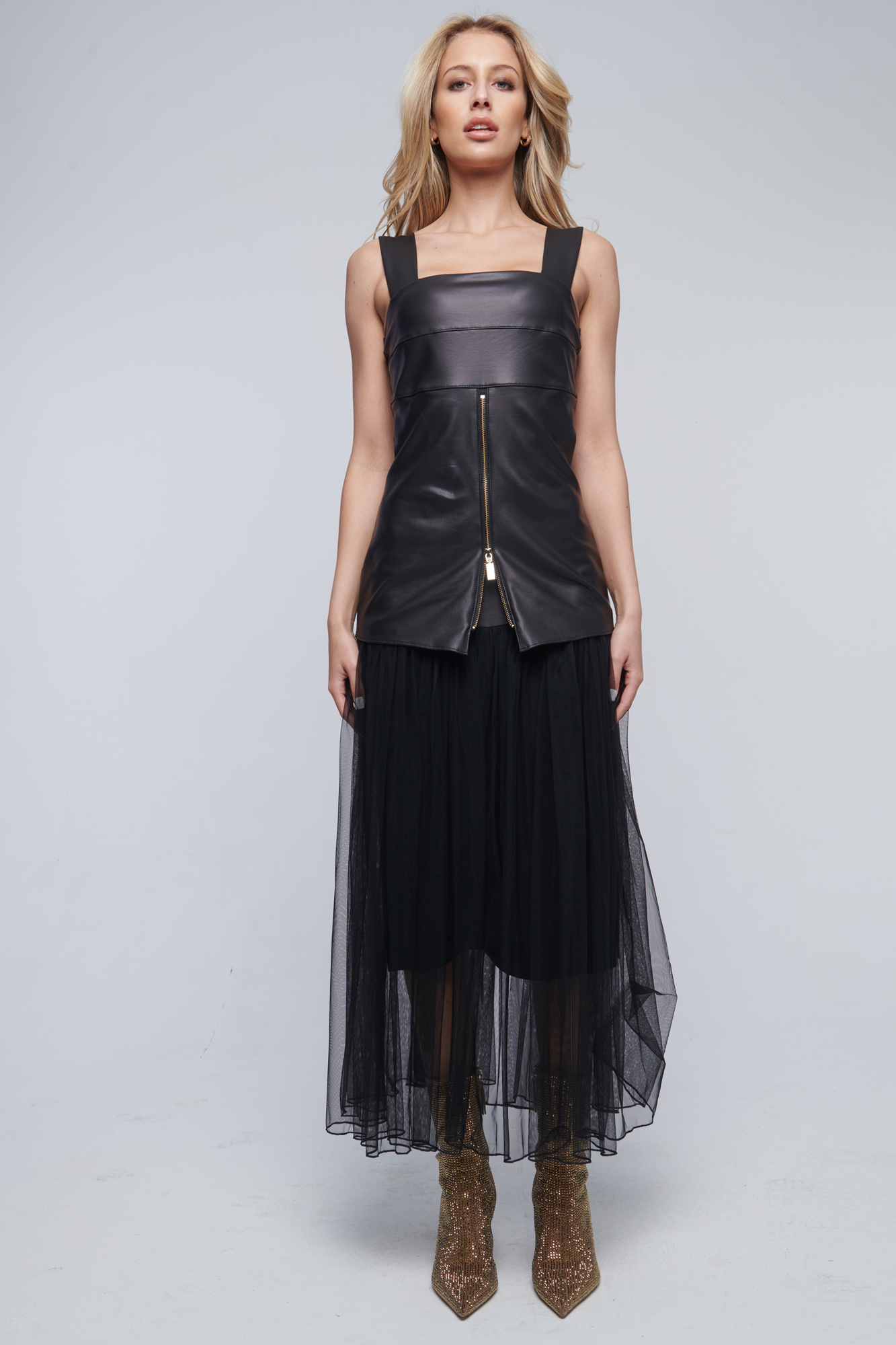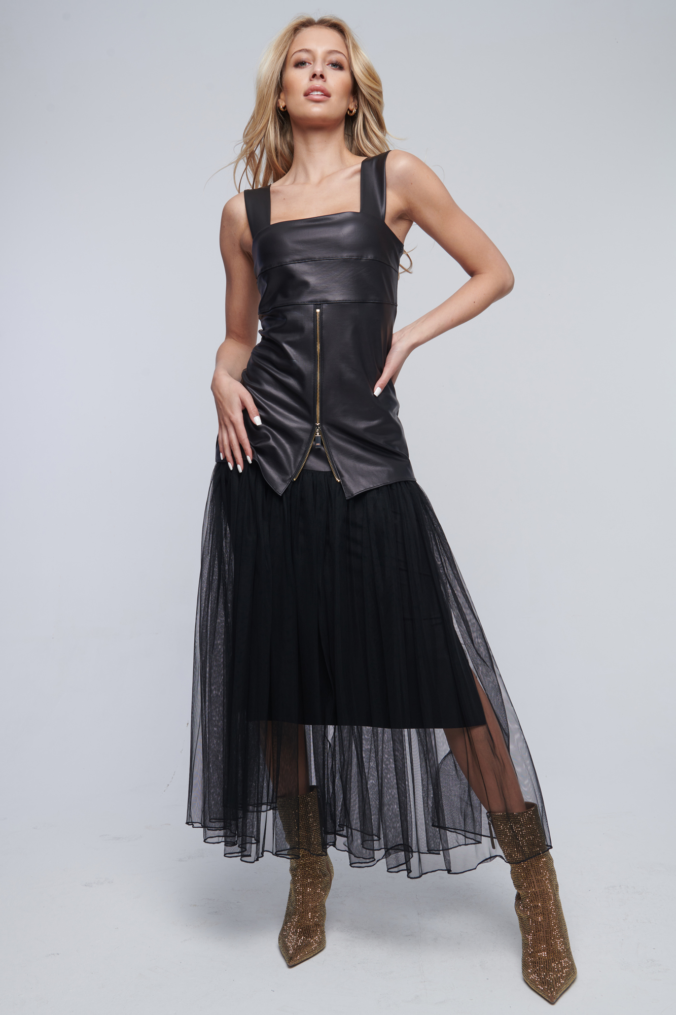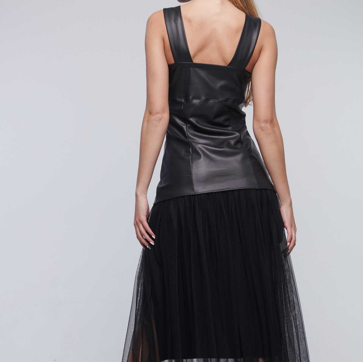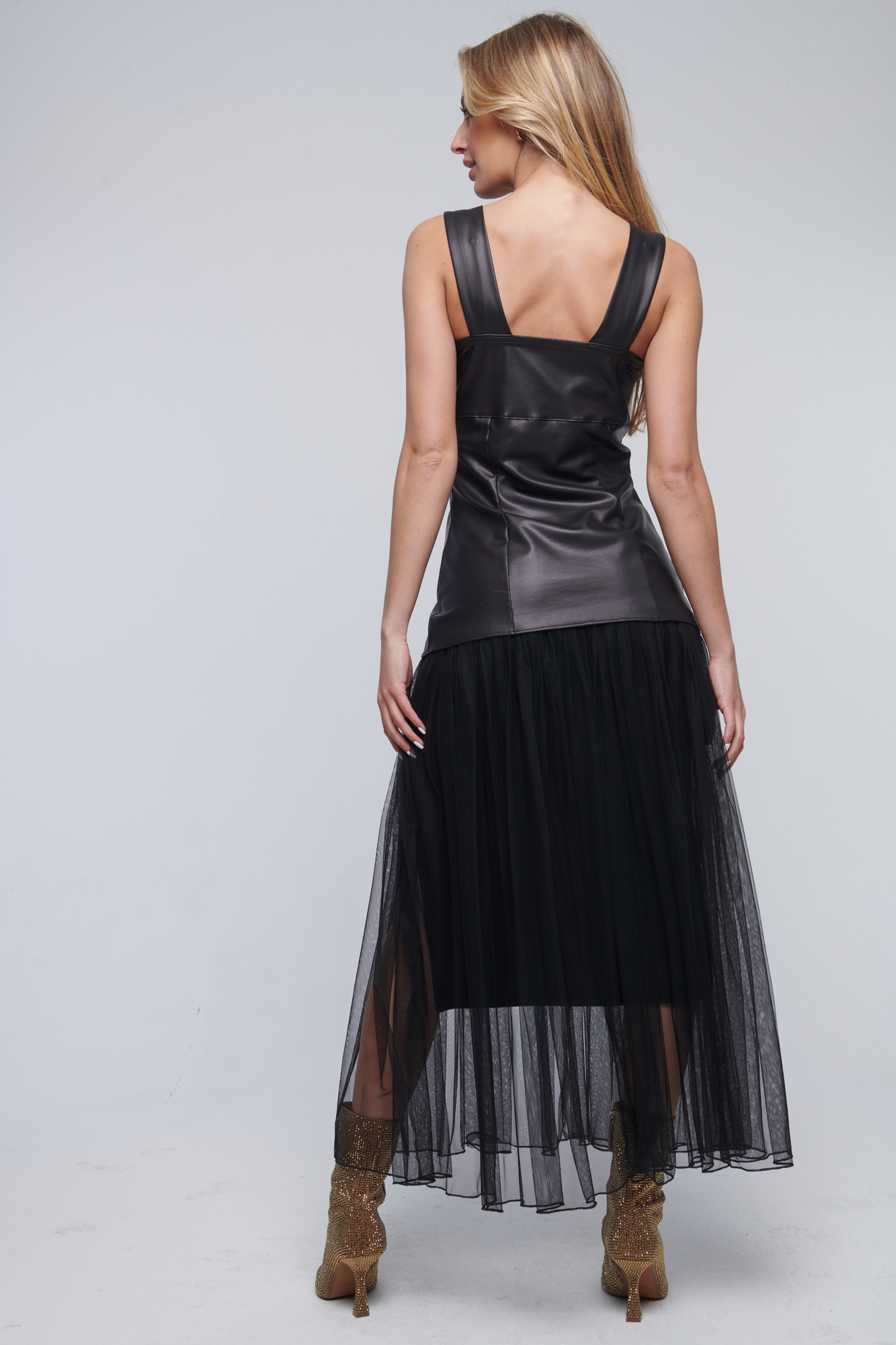 Společenské šaty s rozšířenou sukní. Kombinace tylu, ekokůže a úpletu.