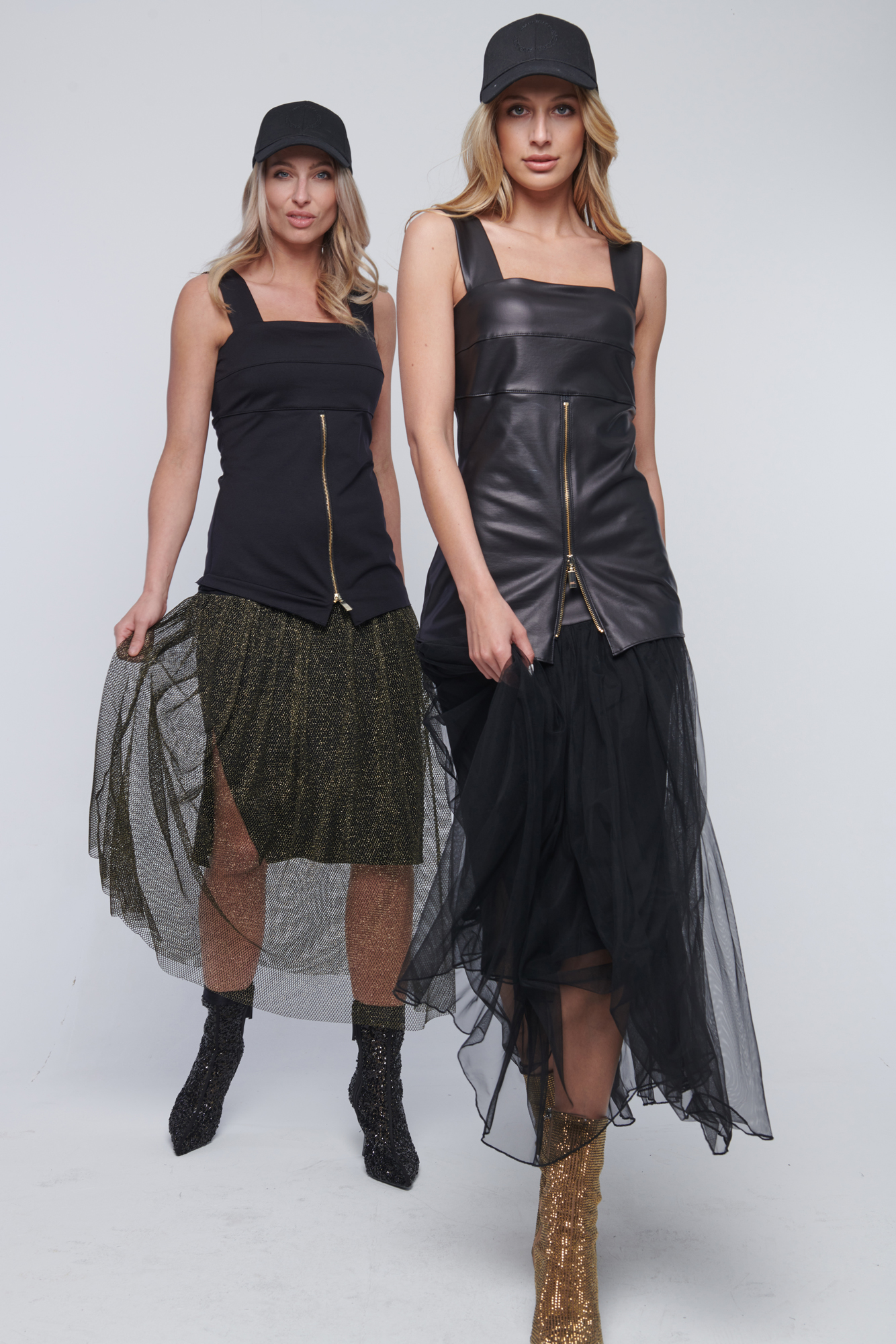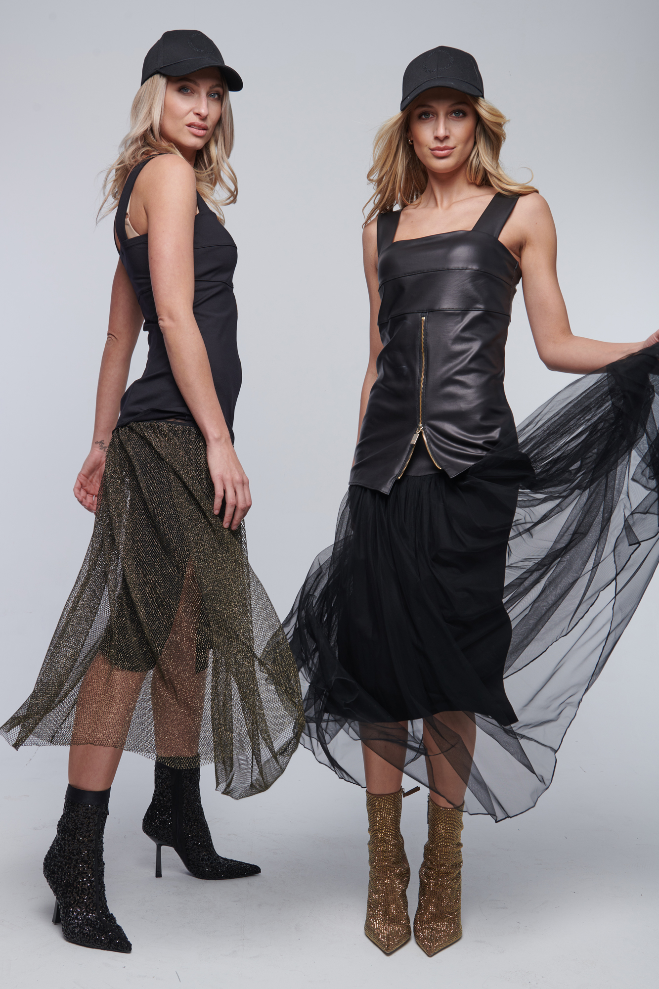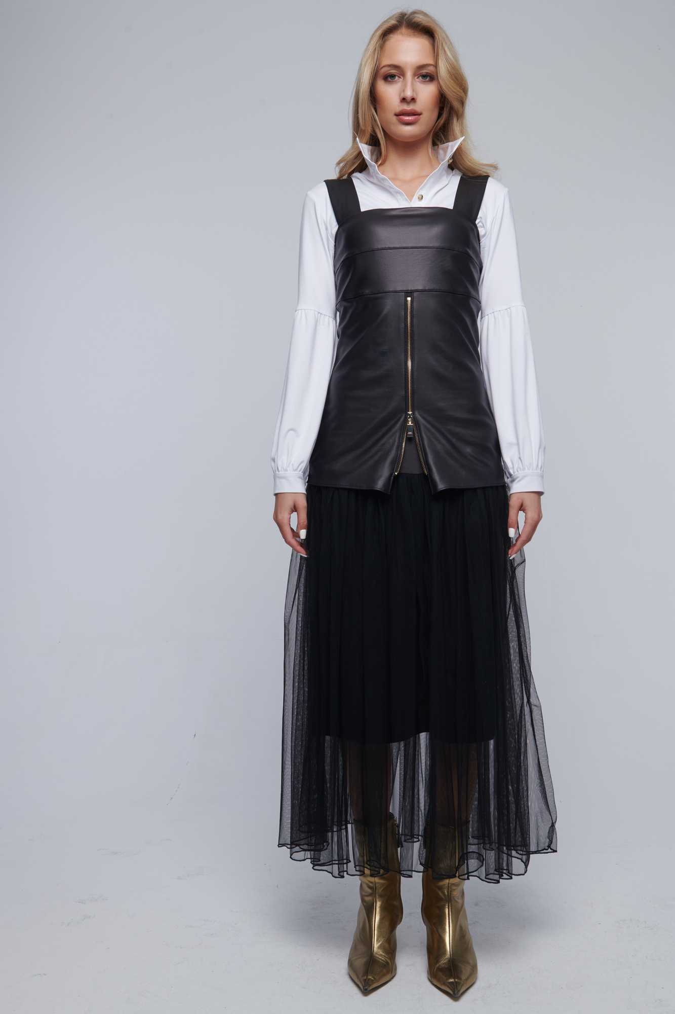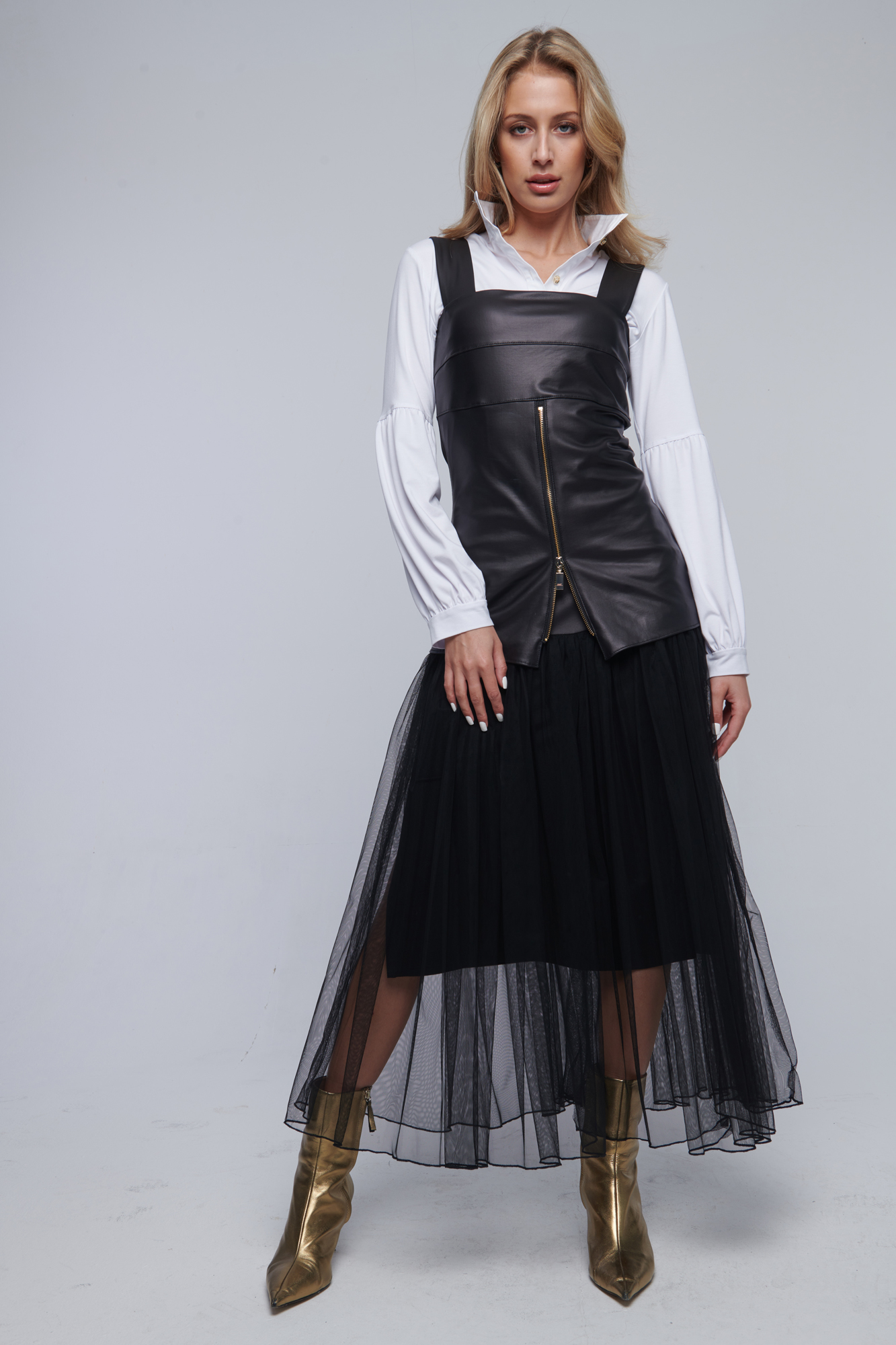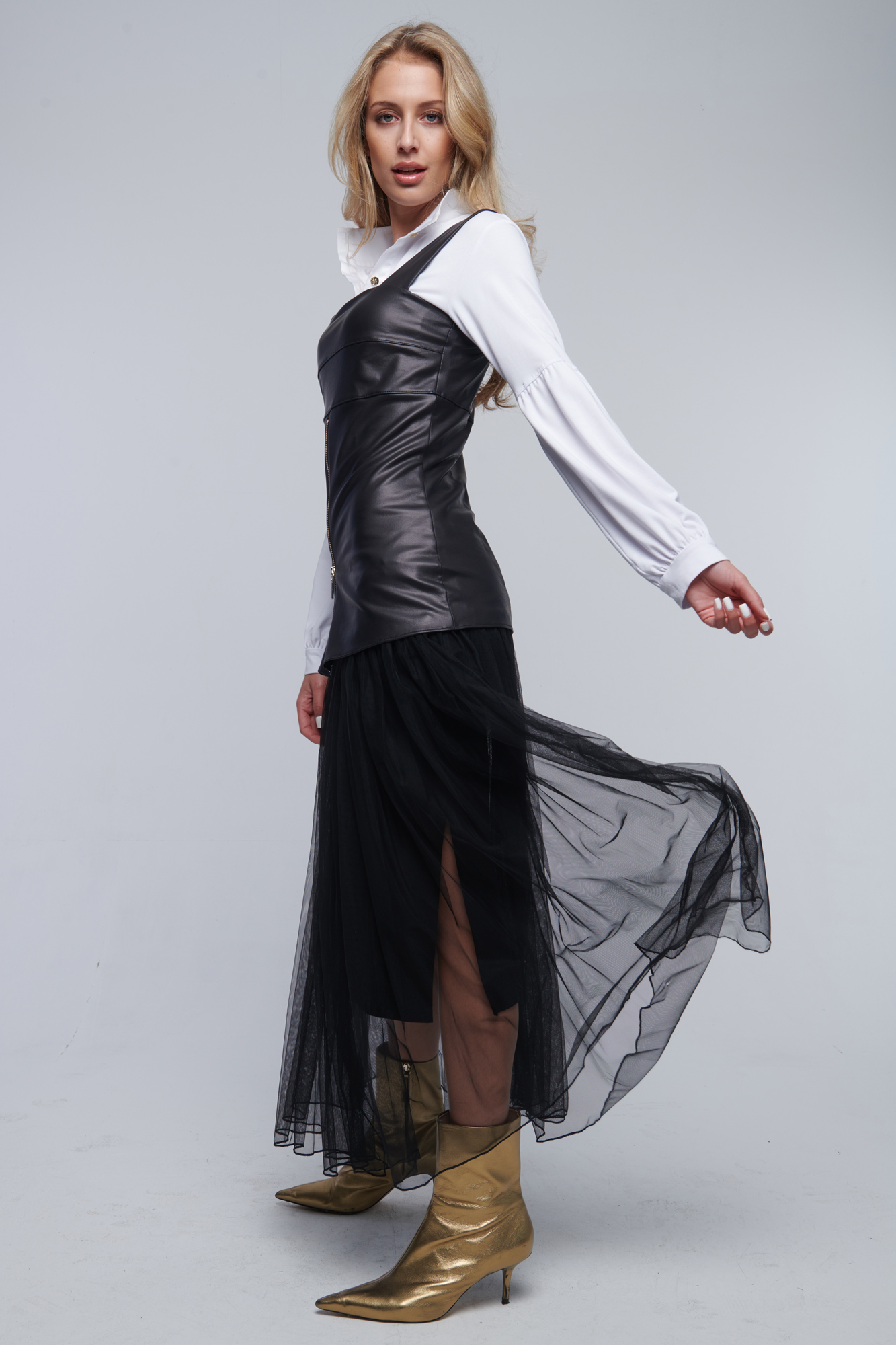 Společenské šaty s rozšířenou sukní. Kombinace tylu, ekokůže a úpletu.