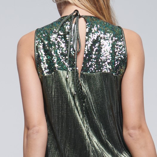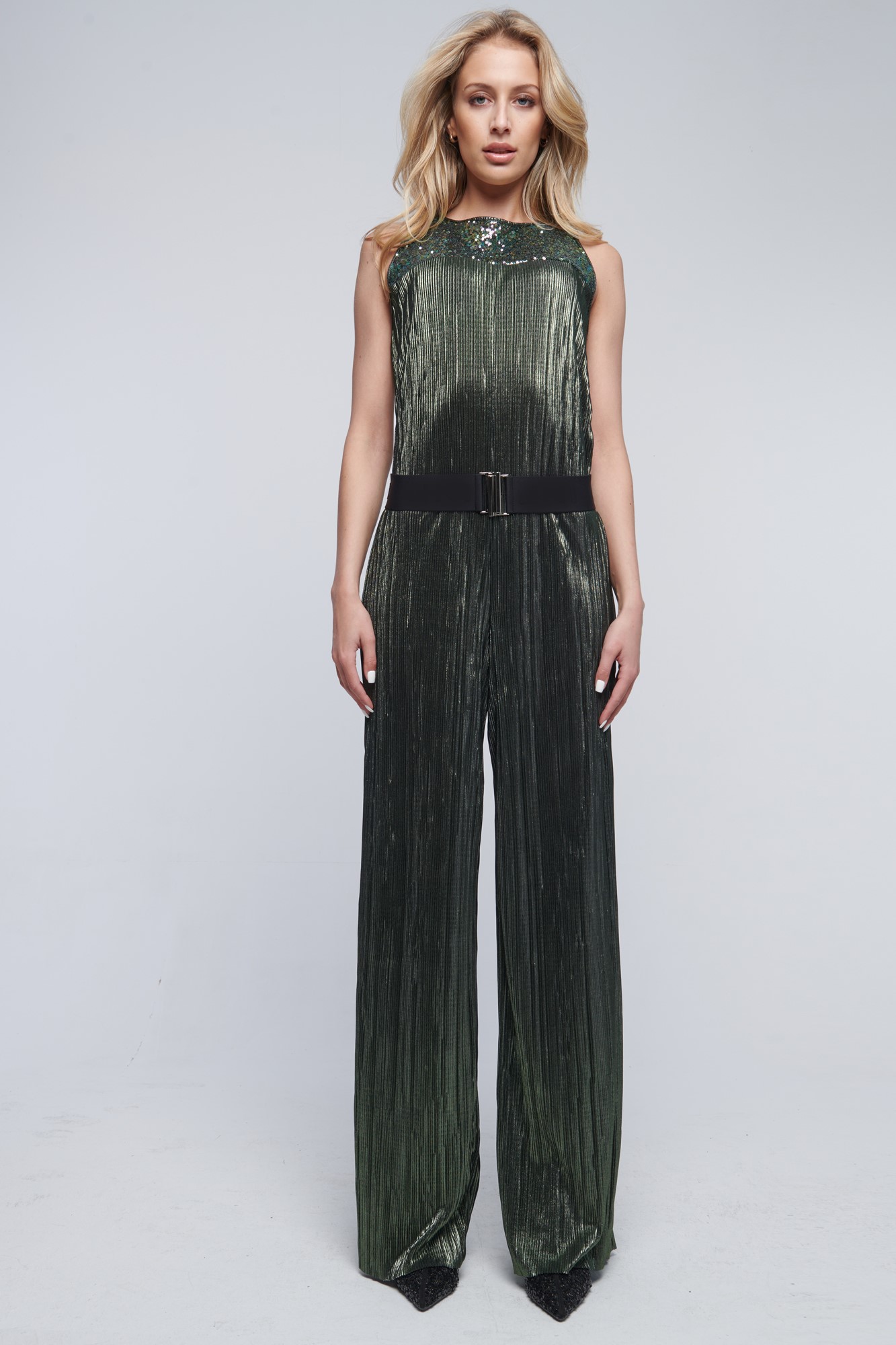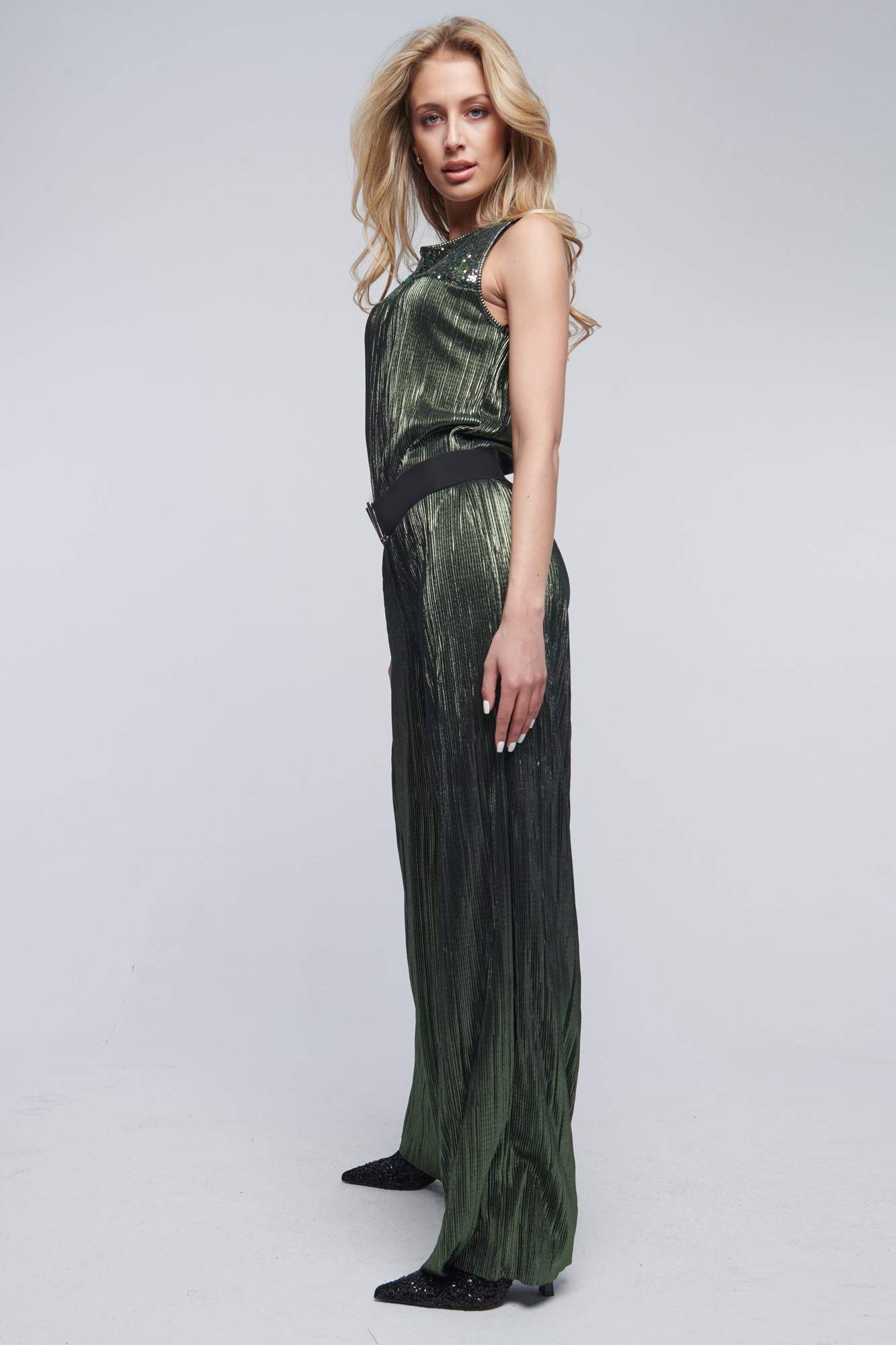 Společenský overal. Plisovaný materiál v kombinaci s flitrovým materiálem.
