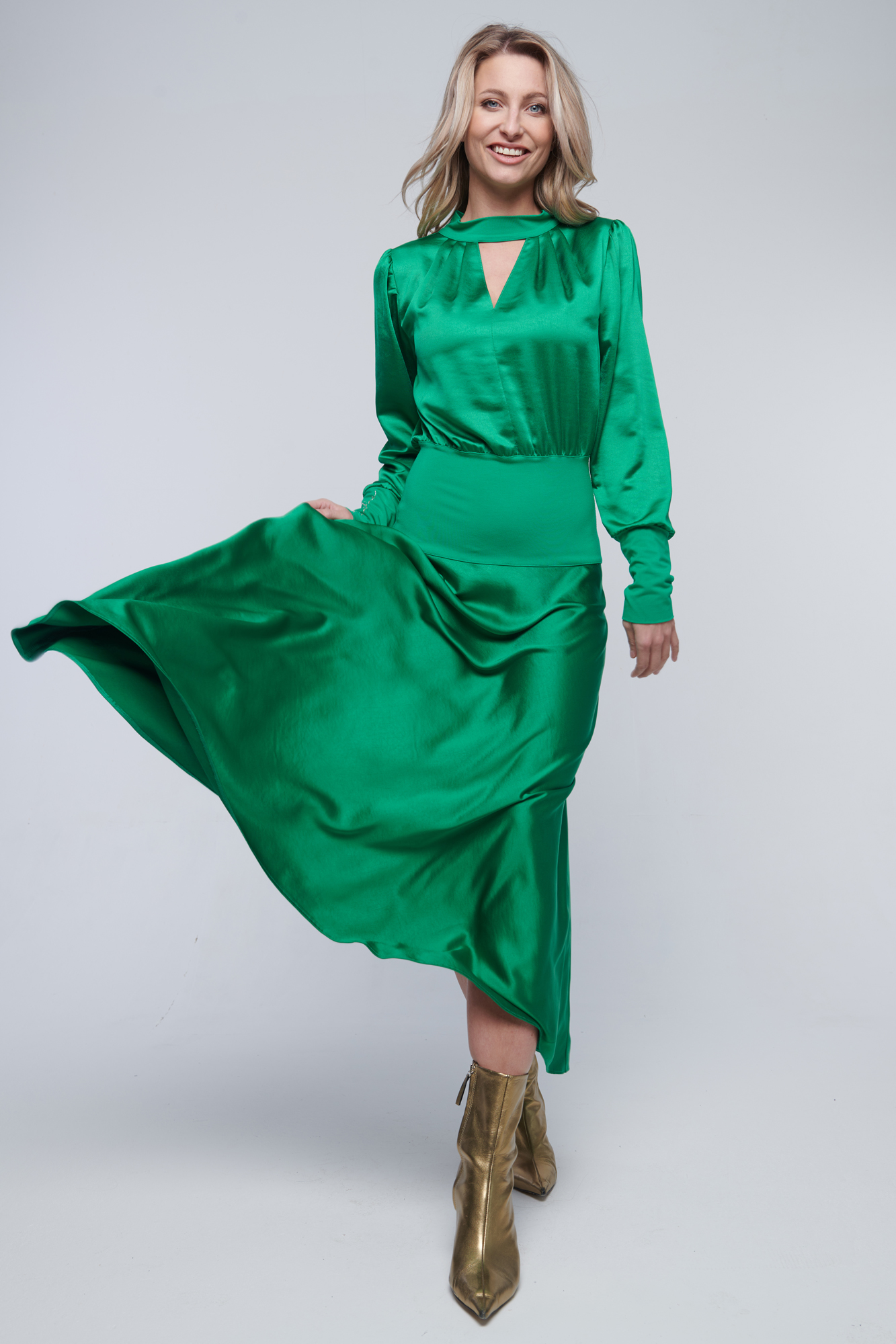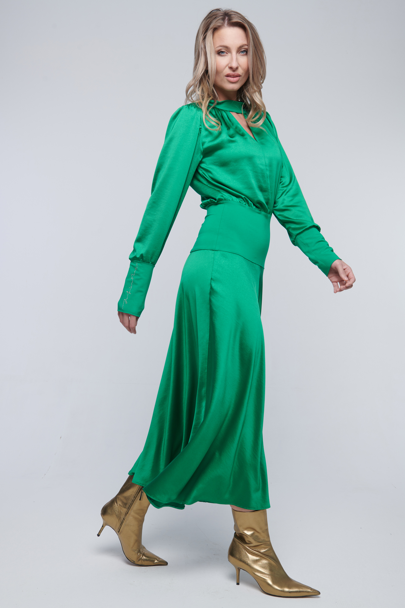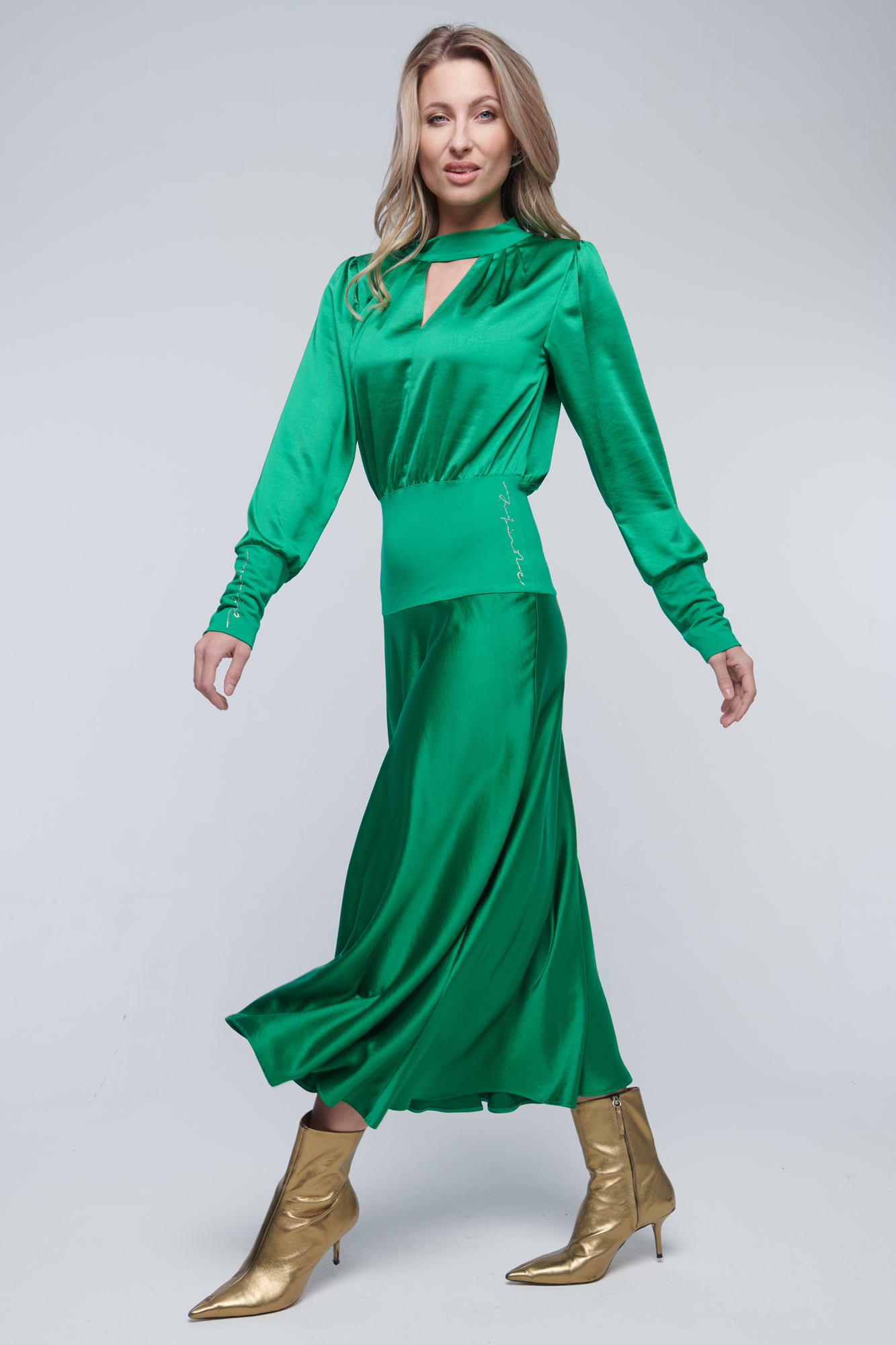 Dlouhé saténové šaty vhodné na party. V pase a na rukávu zlaté crystalové logo Infinite.