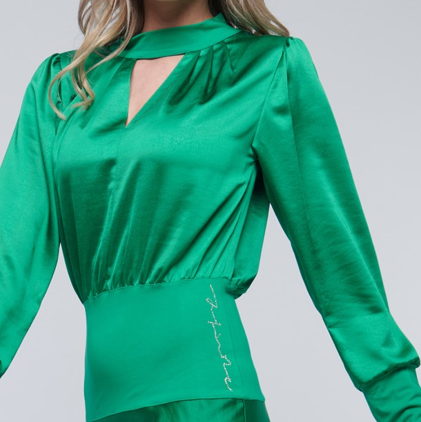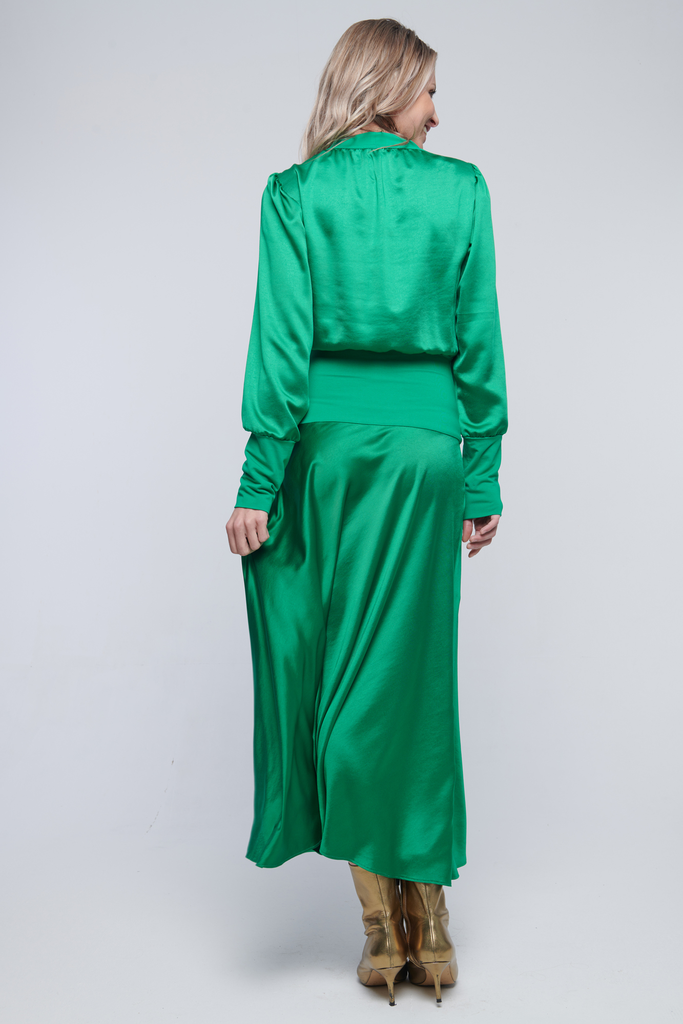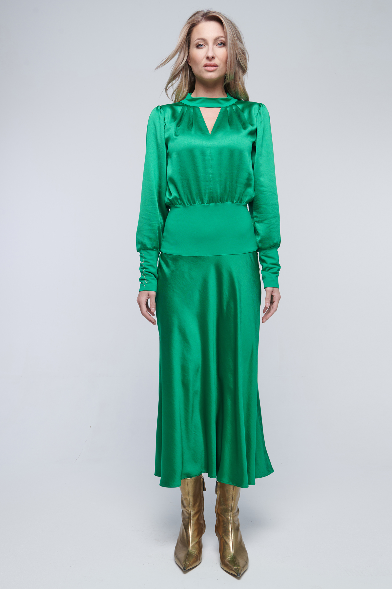 Dlouhé saténové šaty vhodné na party. V pase a na rukávu zlaté crystalové logo Infinite.