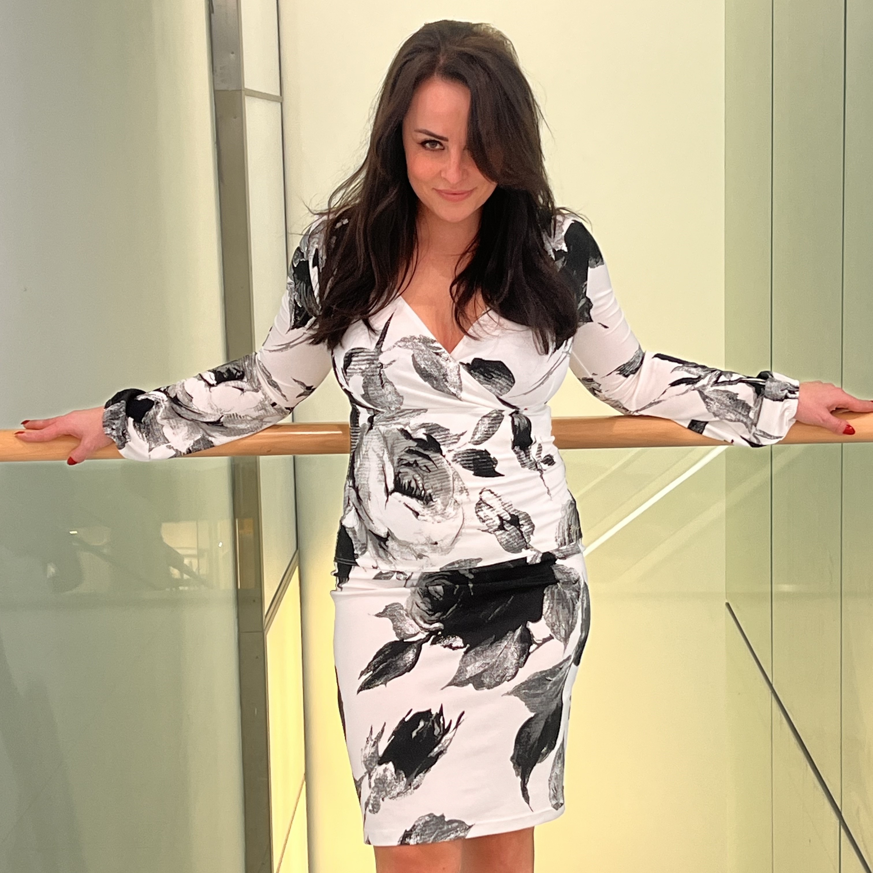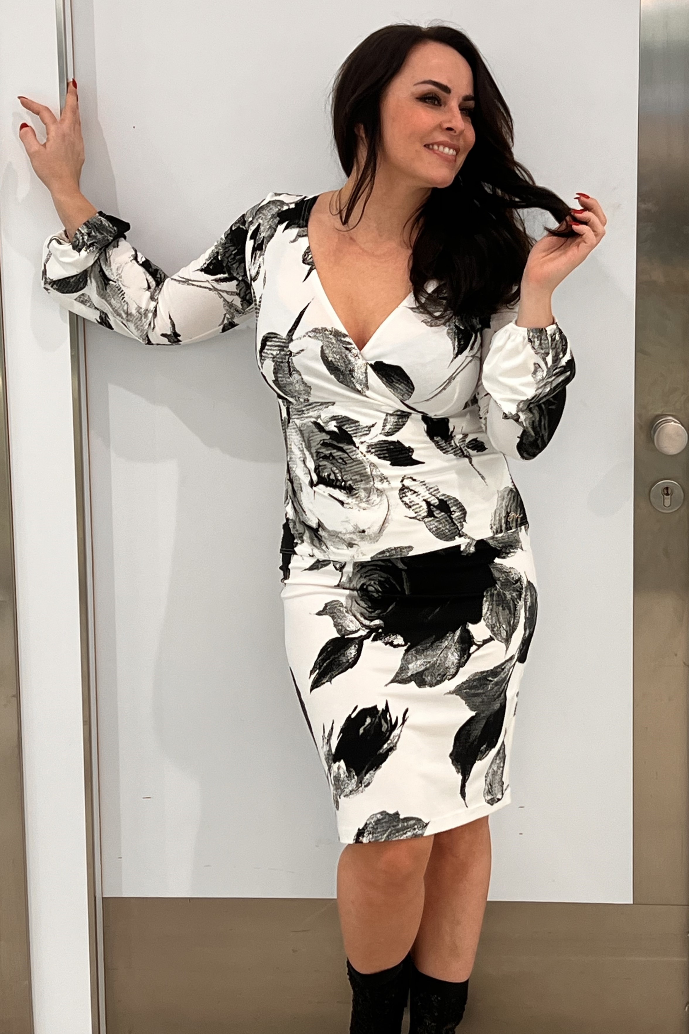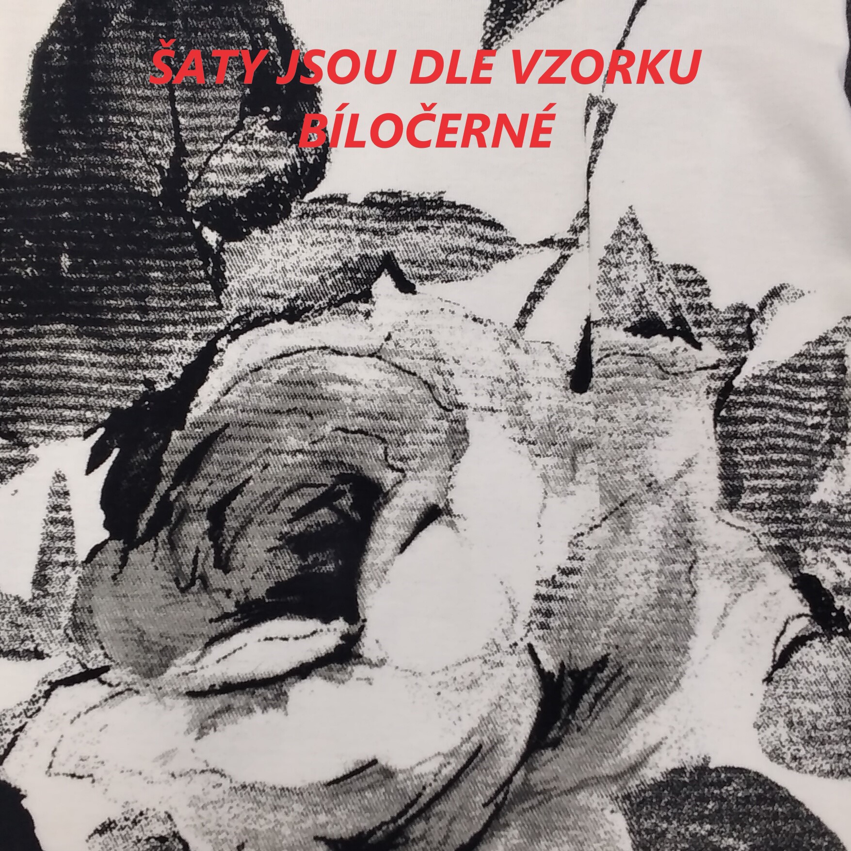 Šaty s výstřihem, v pase zlaté krystalové logo Inf. Nabírané rukávy pod lokty. Látka je ve skutečnosti černé růže na smetanovém podkladu - fotka není identická.