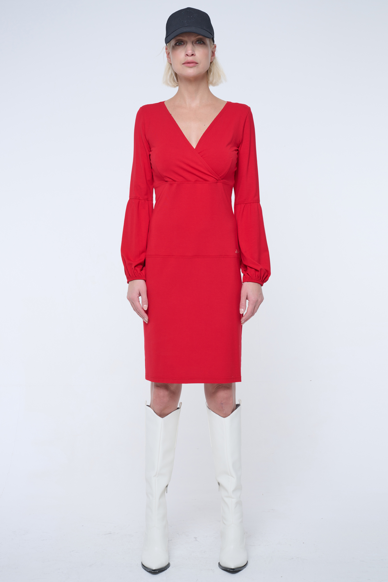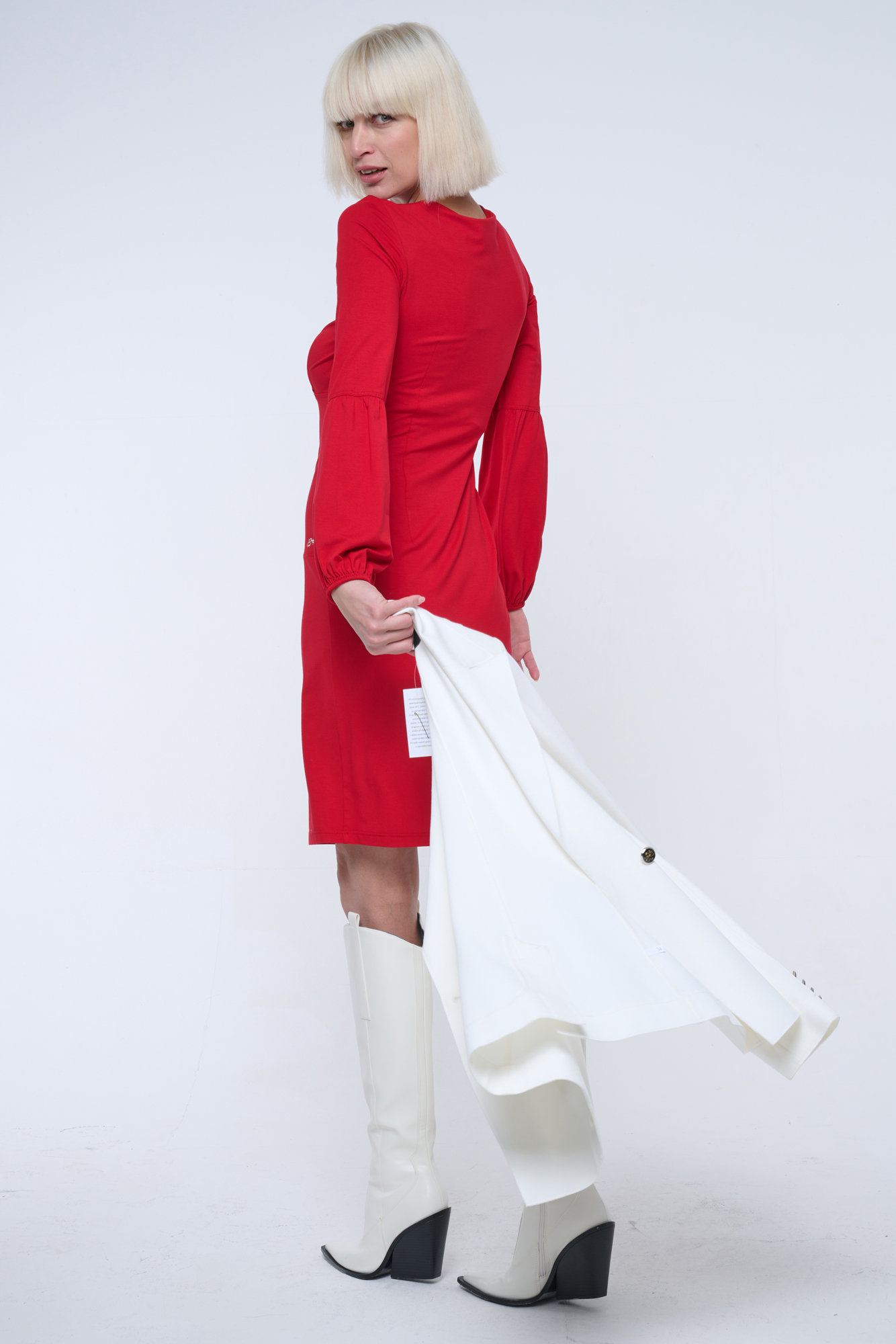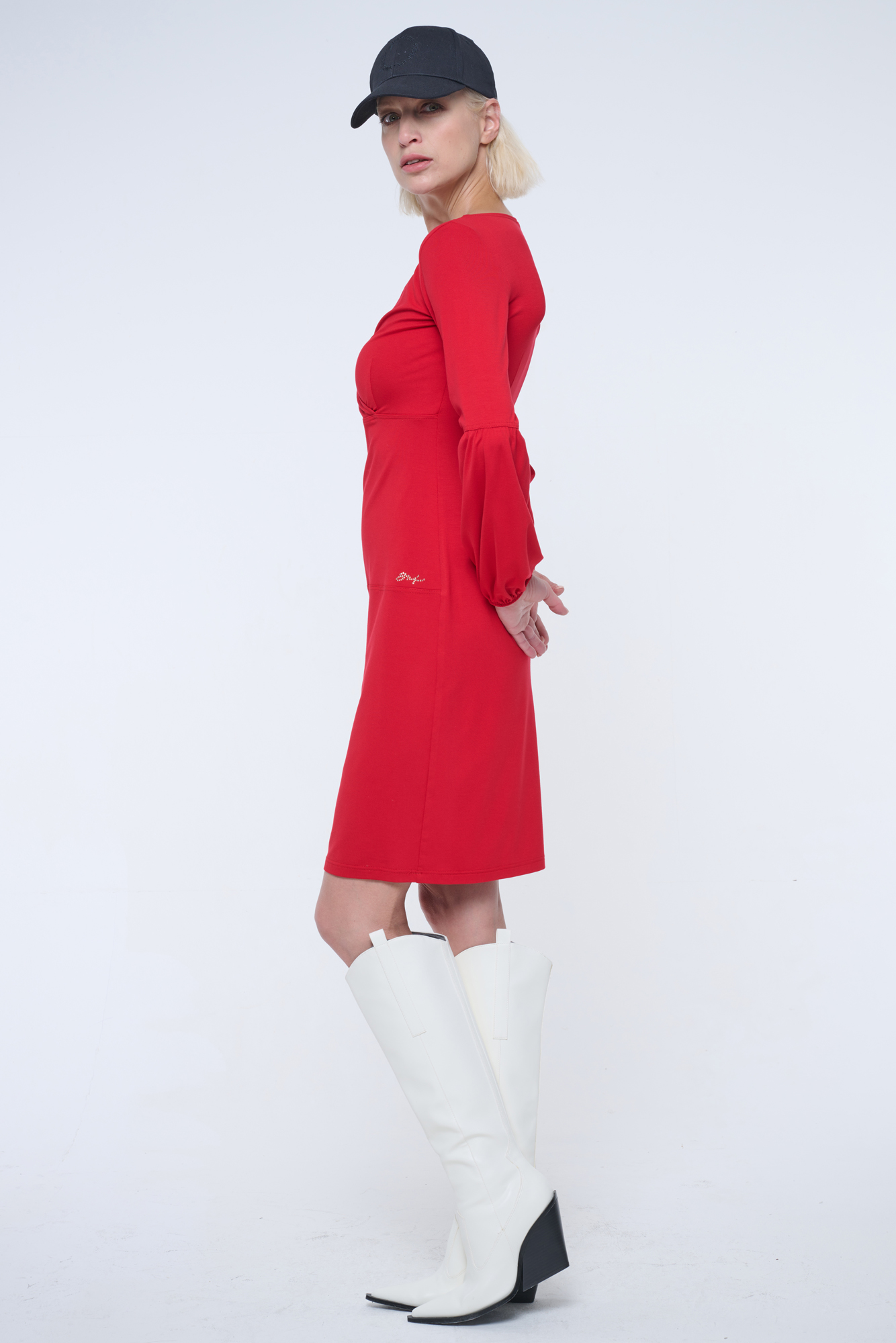 Šaty s výstřihem, v pase zlaté krystalové logo Inf. Nabírané rukávy pod lokty.