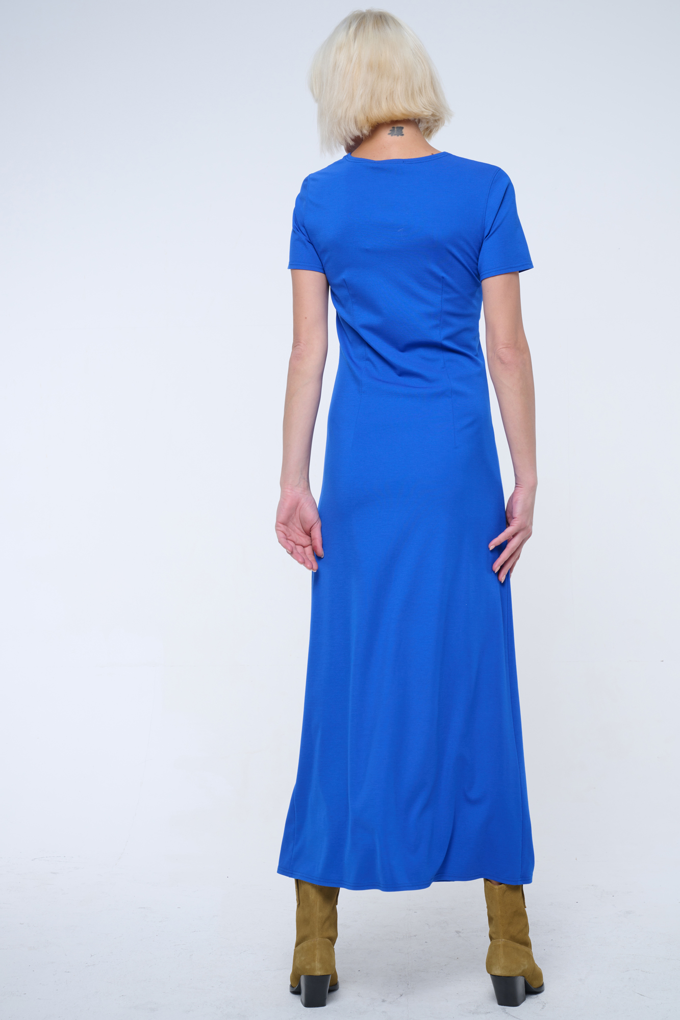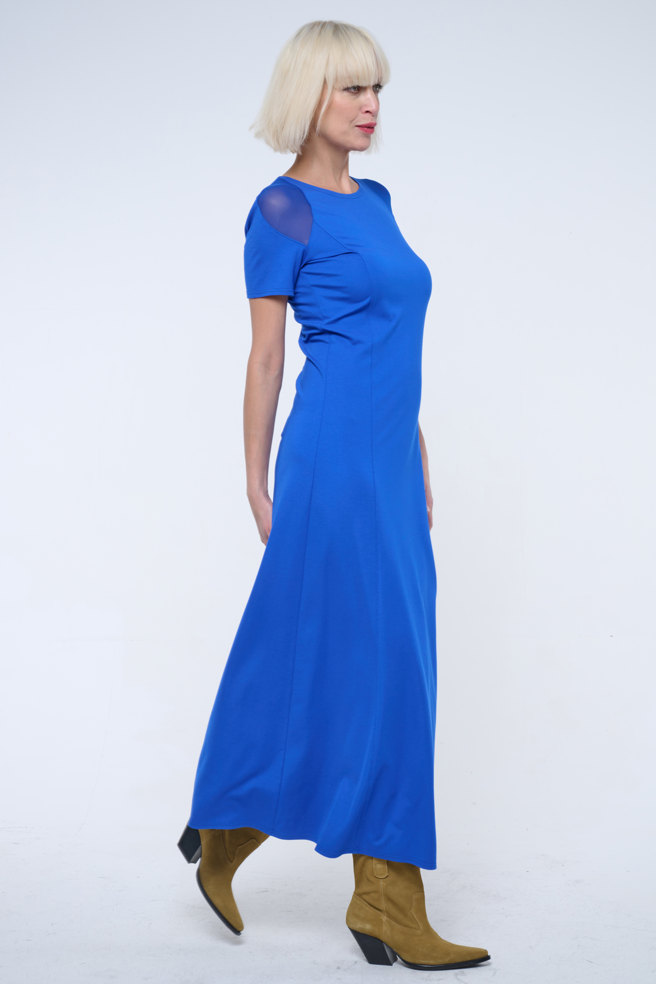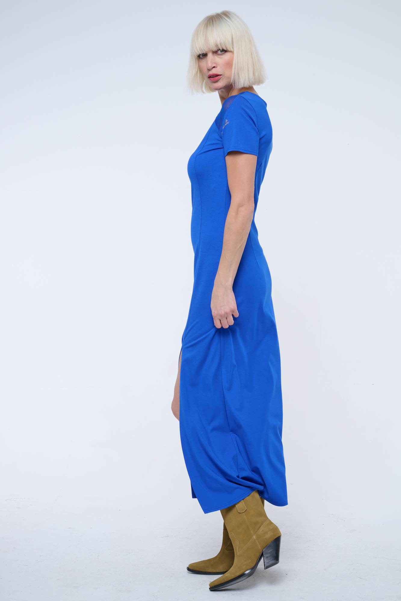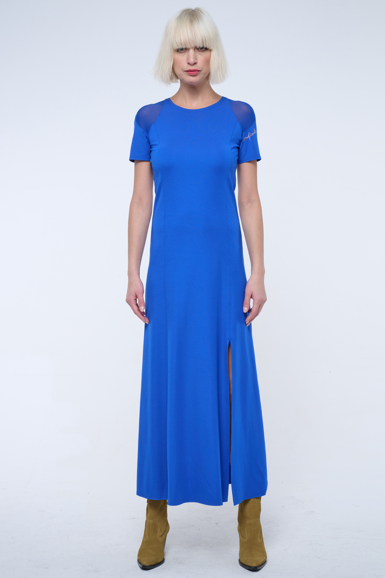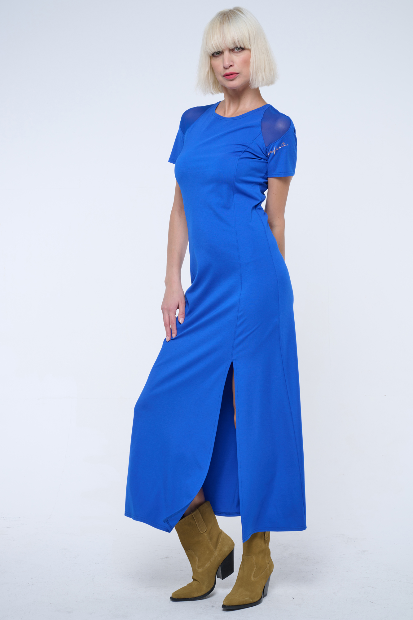 Dlouhé šaty s průstřihy na ramenech. Na rukávu malé zlaté krystalové logo INF.