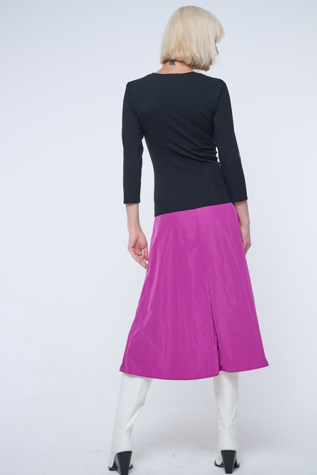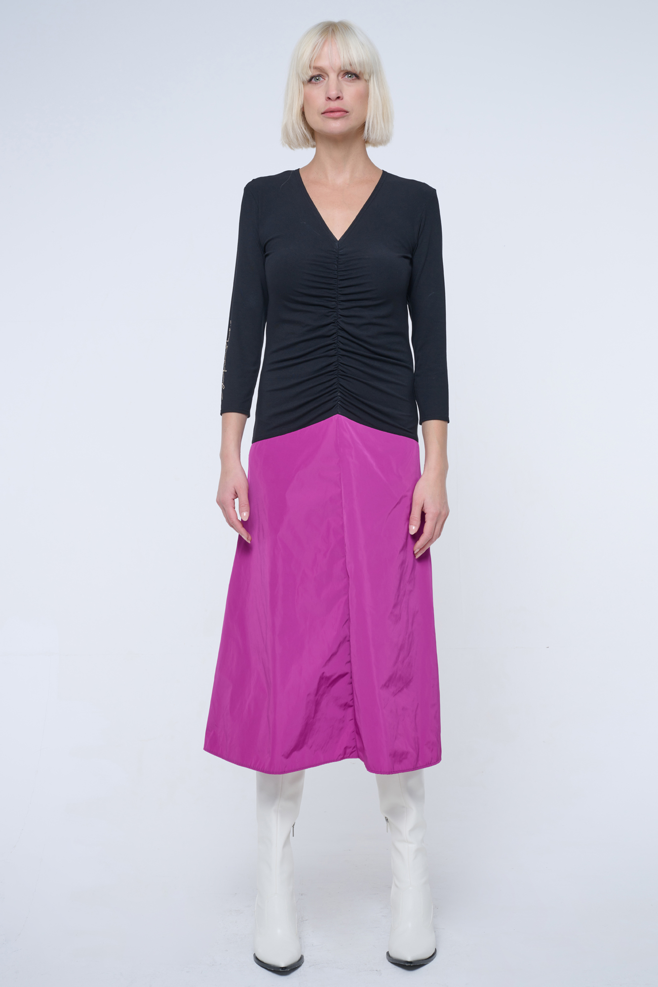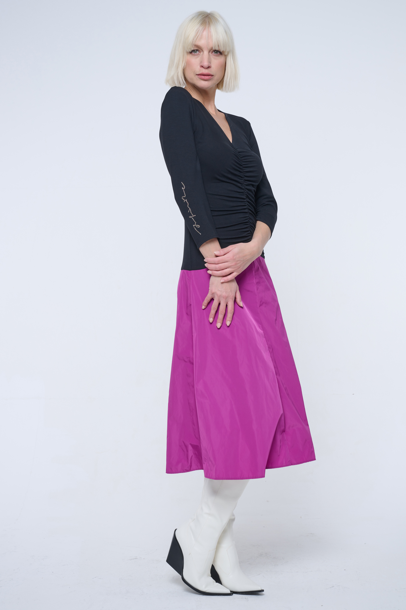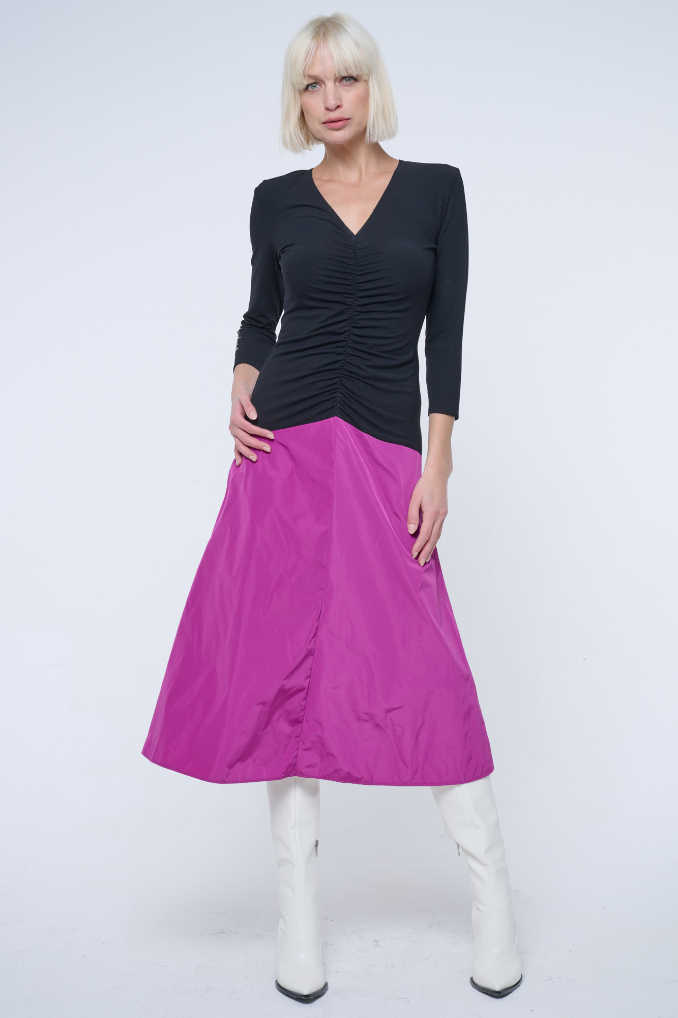 Šaty pro všechny společenské příležitosti. Sukně je mírně do A, z šusťákového materiálu. Na pravém rukávu zlaté crystalové logo Infinite.