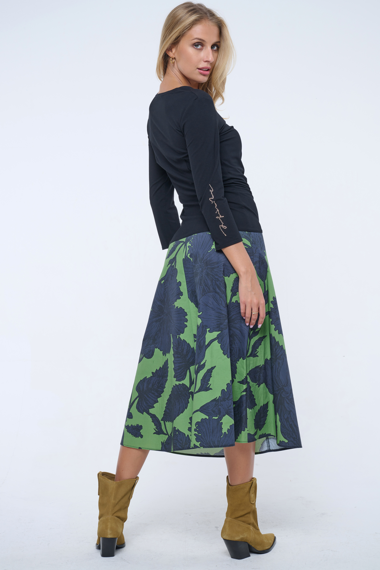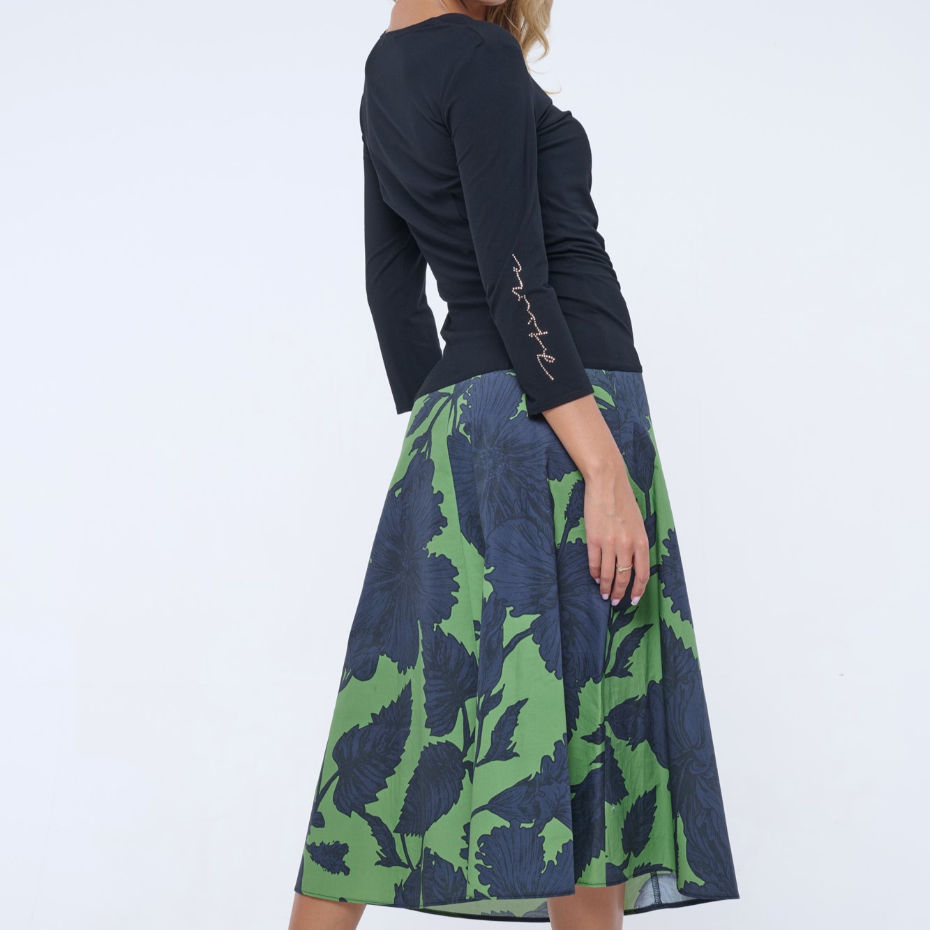 Šaty pro všechny společenské příležitosti. Sukně je mírně do A, ze vzorovaného materiálu. Na pravém rukávu zlaté crystalové logo Infinite.