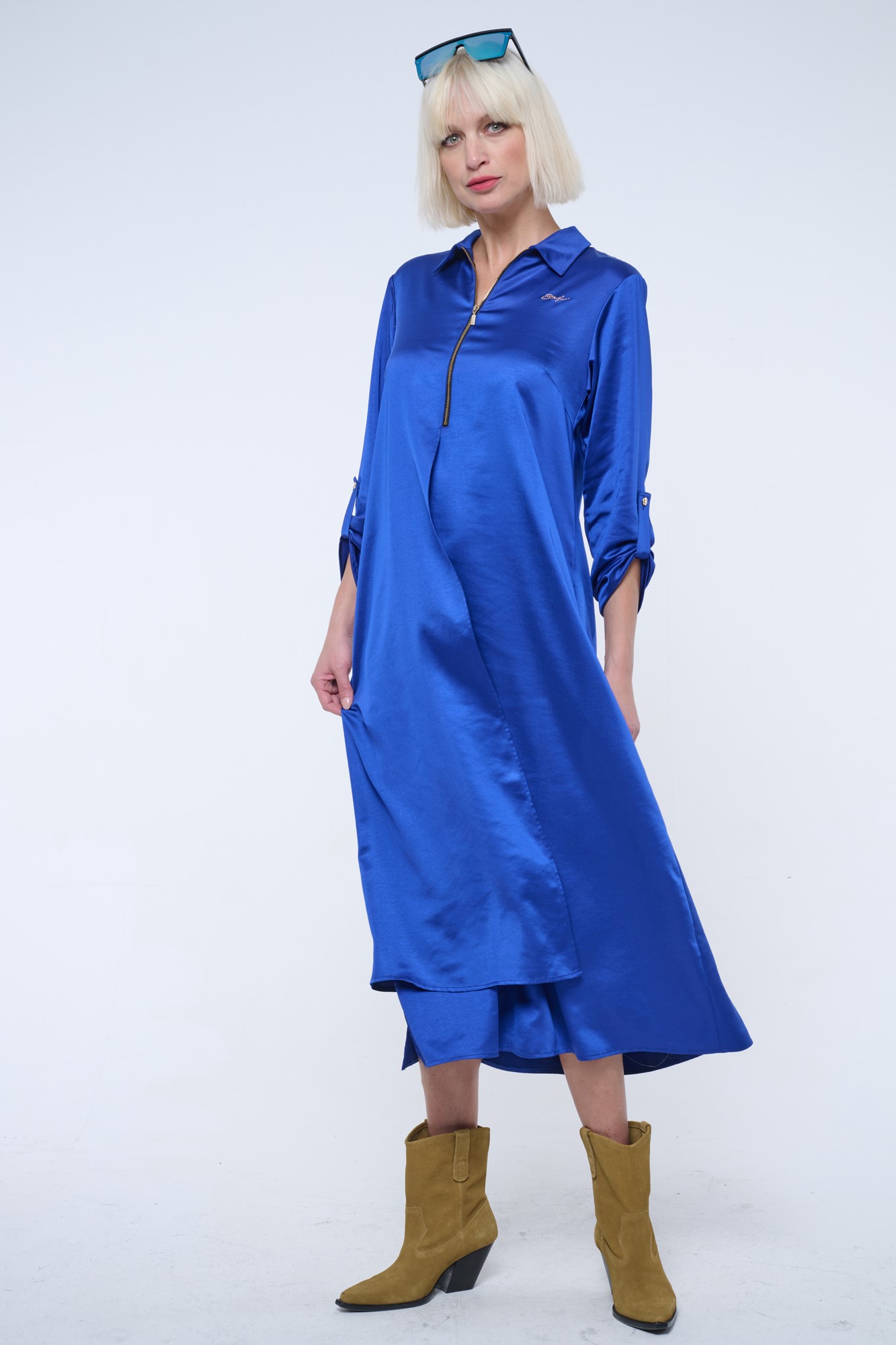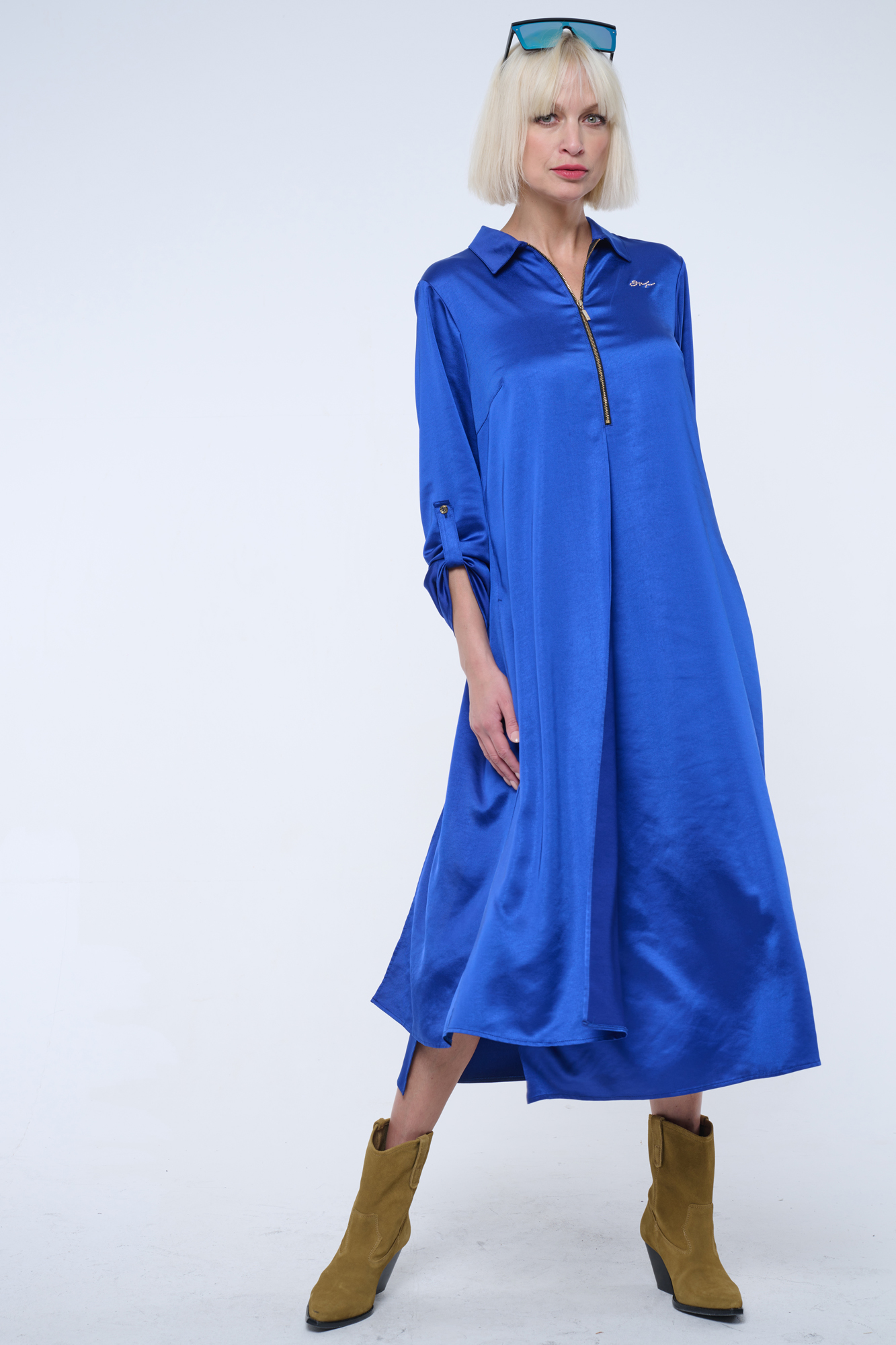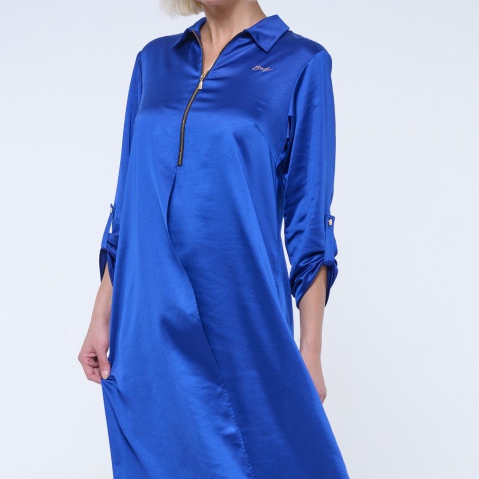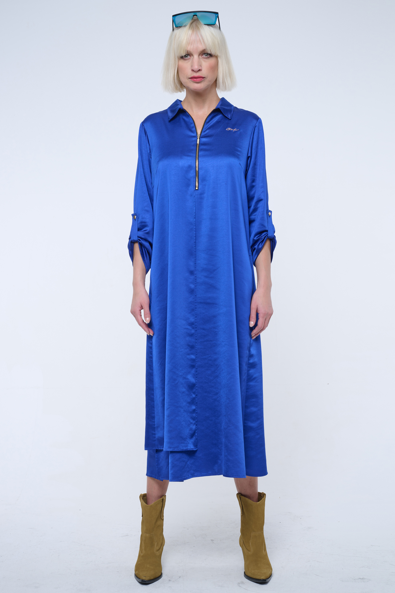 Dlouhé košilové volné šaty. Malé zlaté krystalové logo INF.