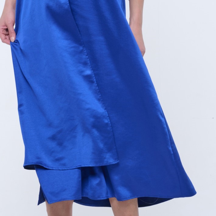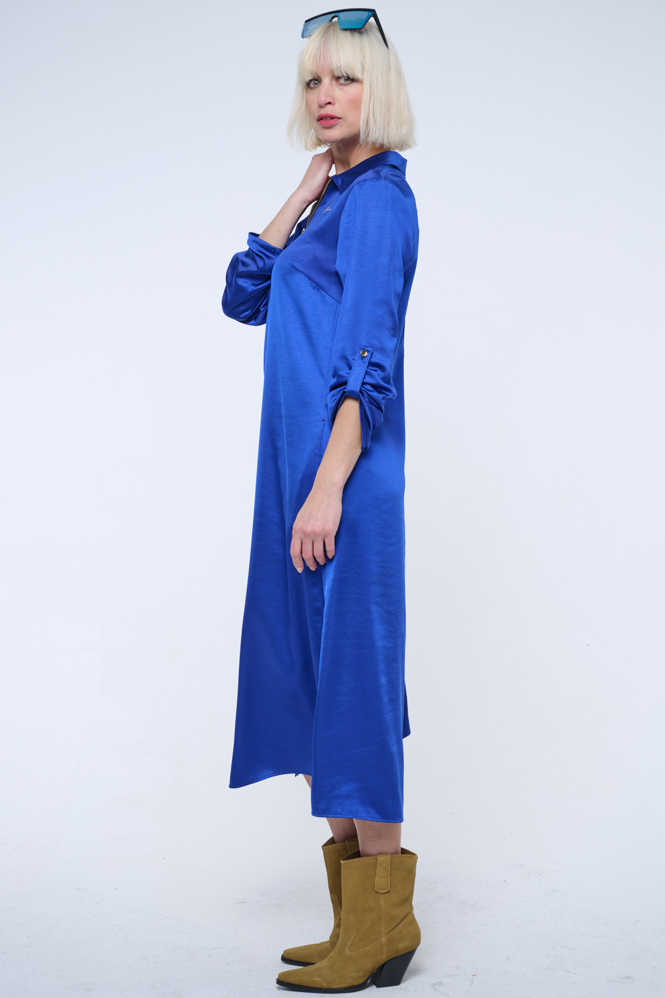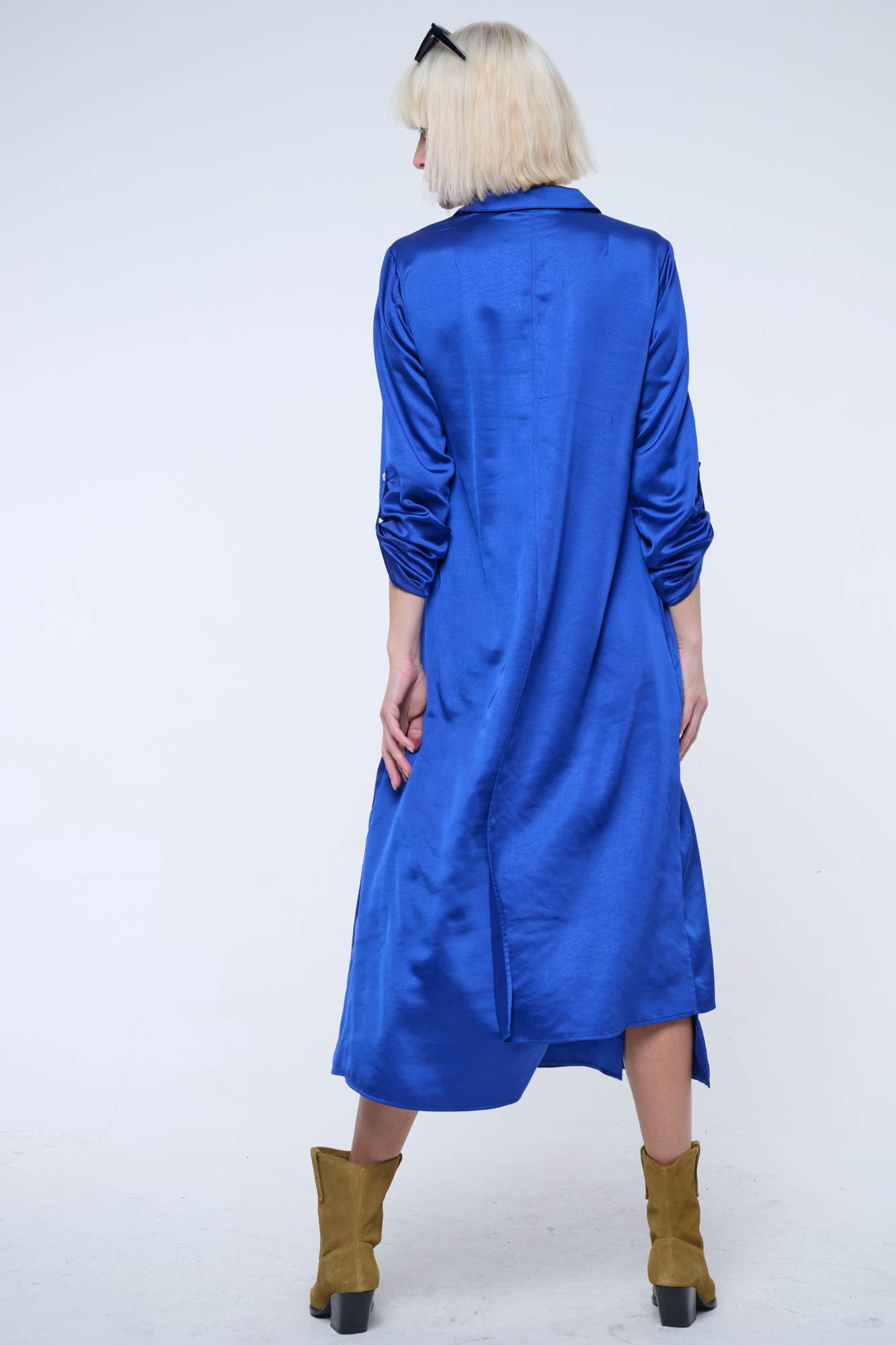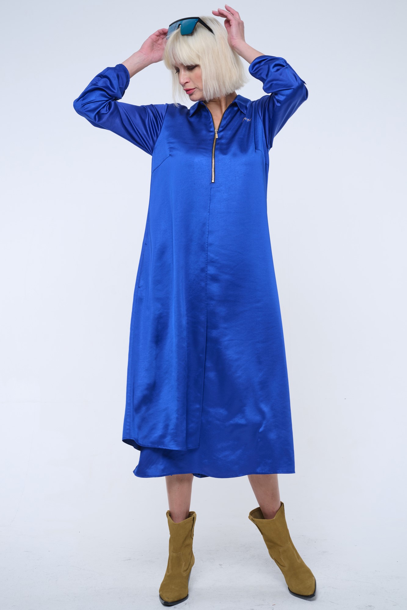 Dlouhé košilové volné šaty. Malé zlaté krystalové logo INF.