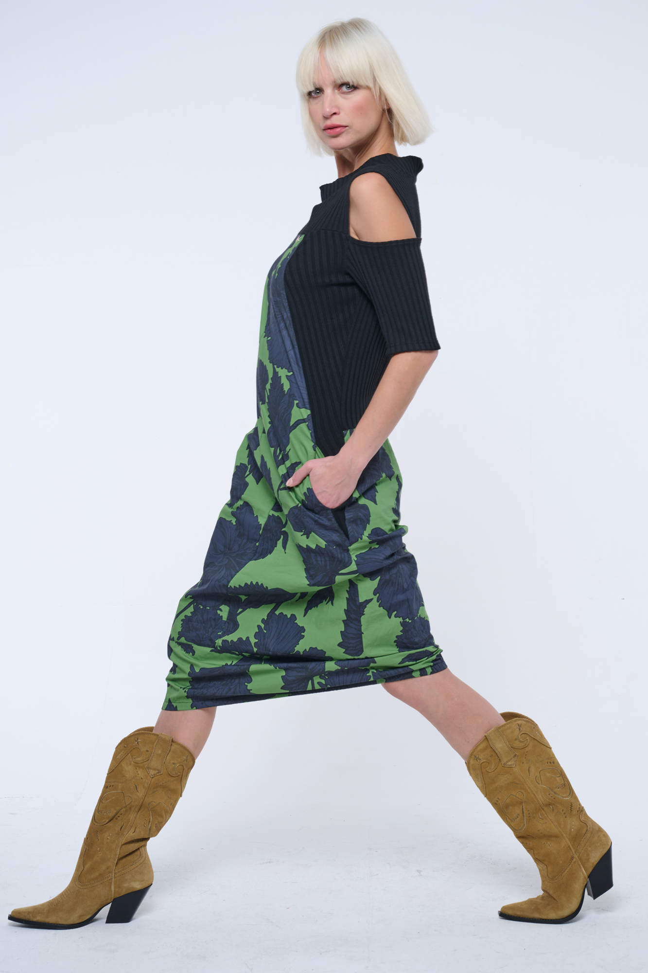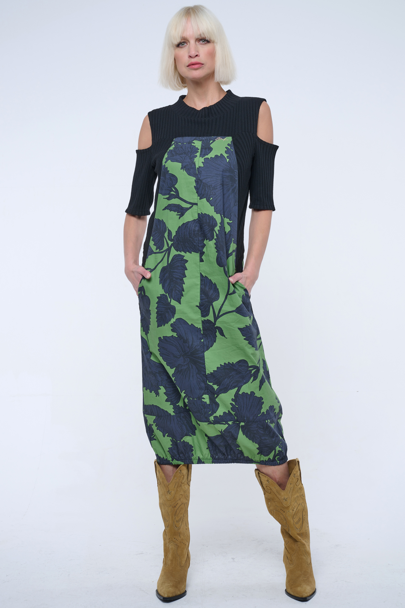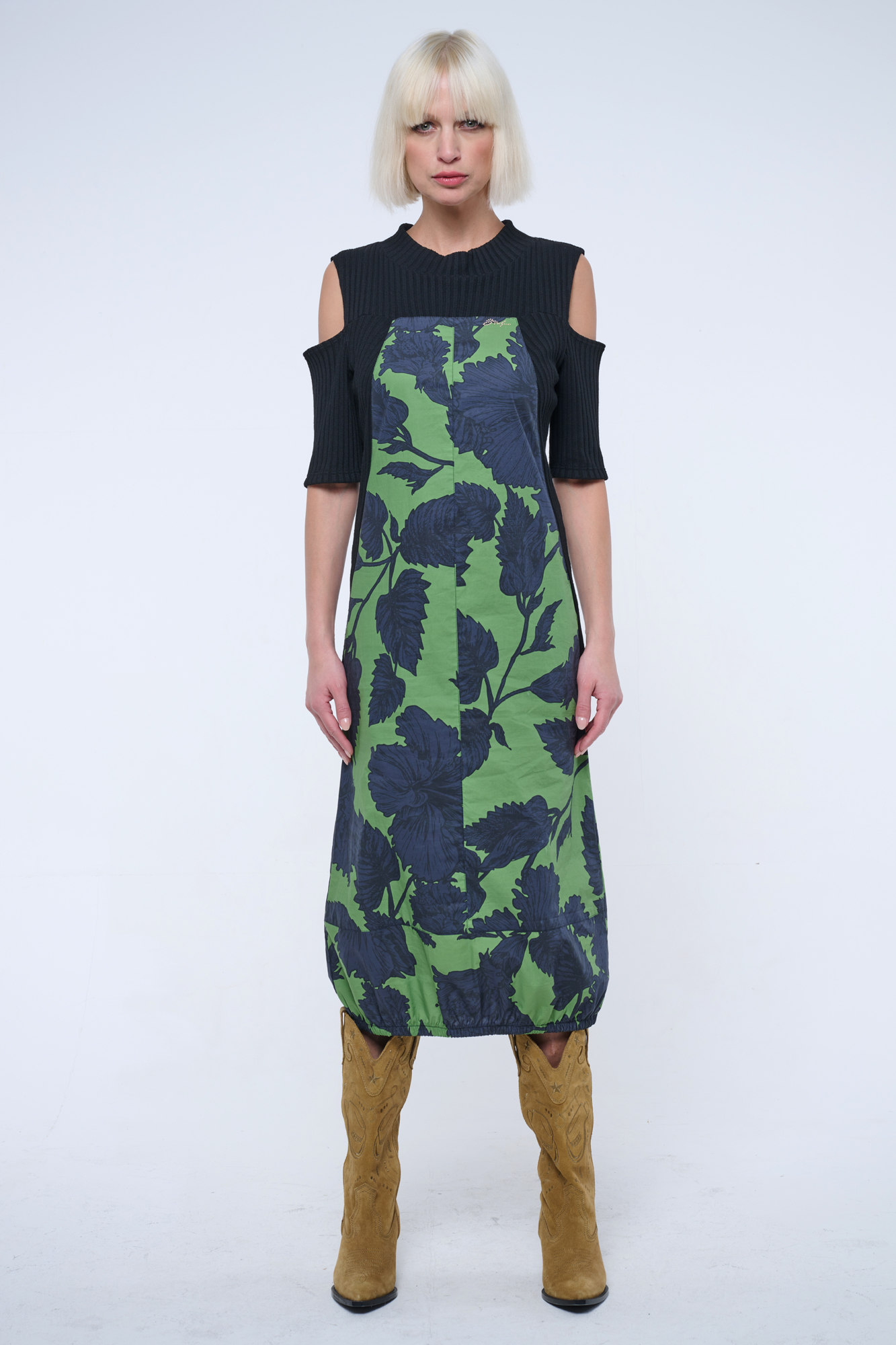 Šaty s šusťákovou balónovou sukní v kombinaci s žebrovaným úpletem. Malé zlaté krystalové logo INF.