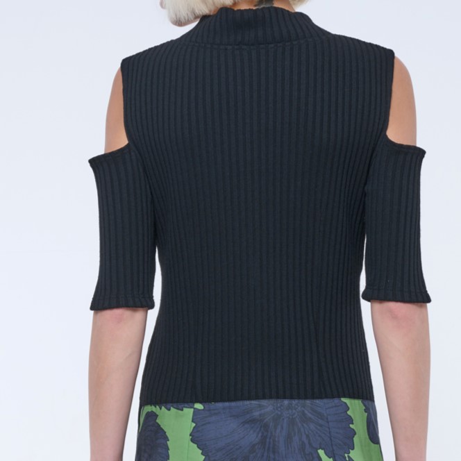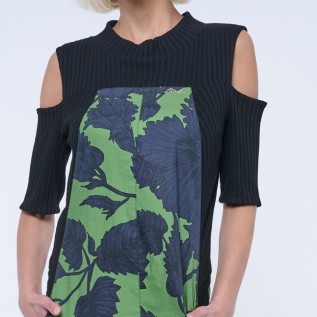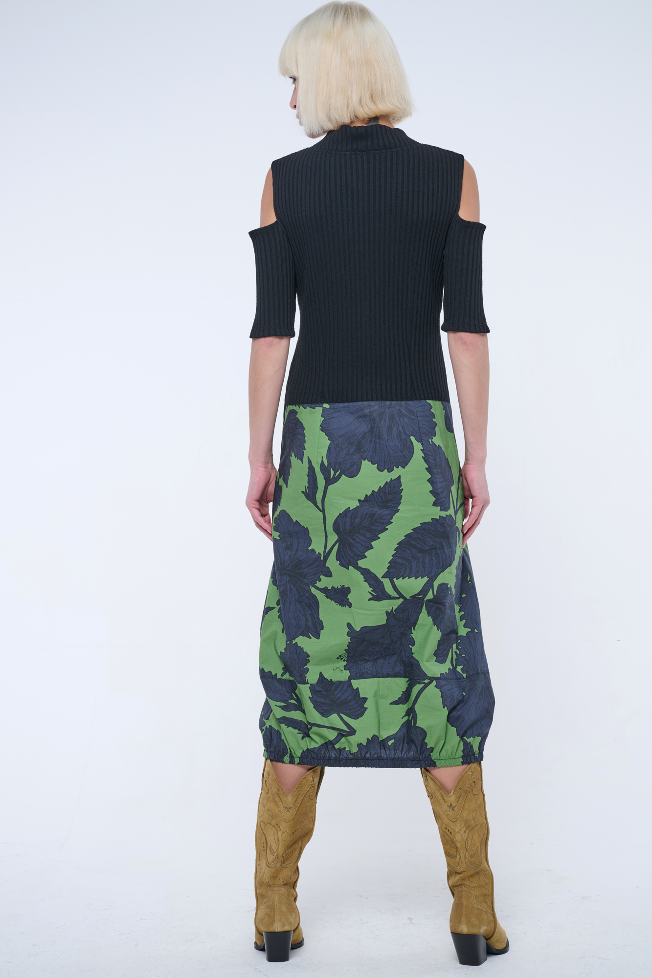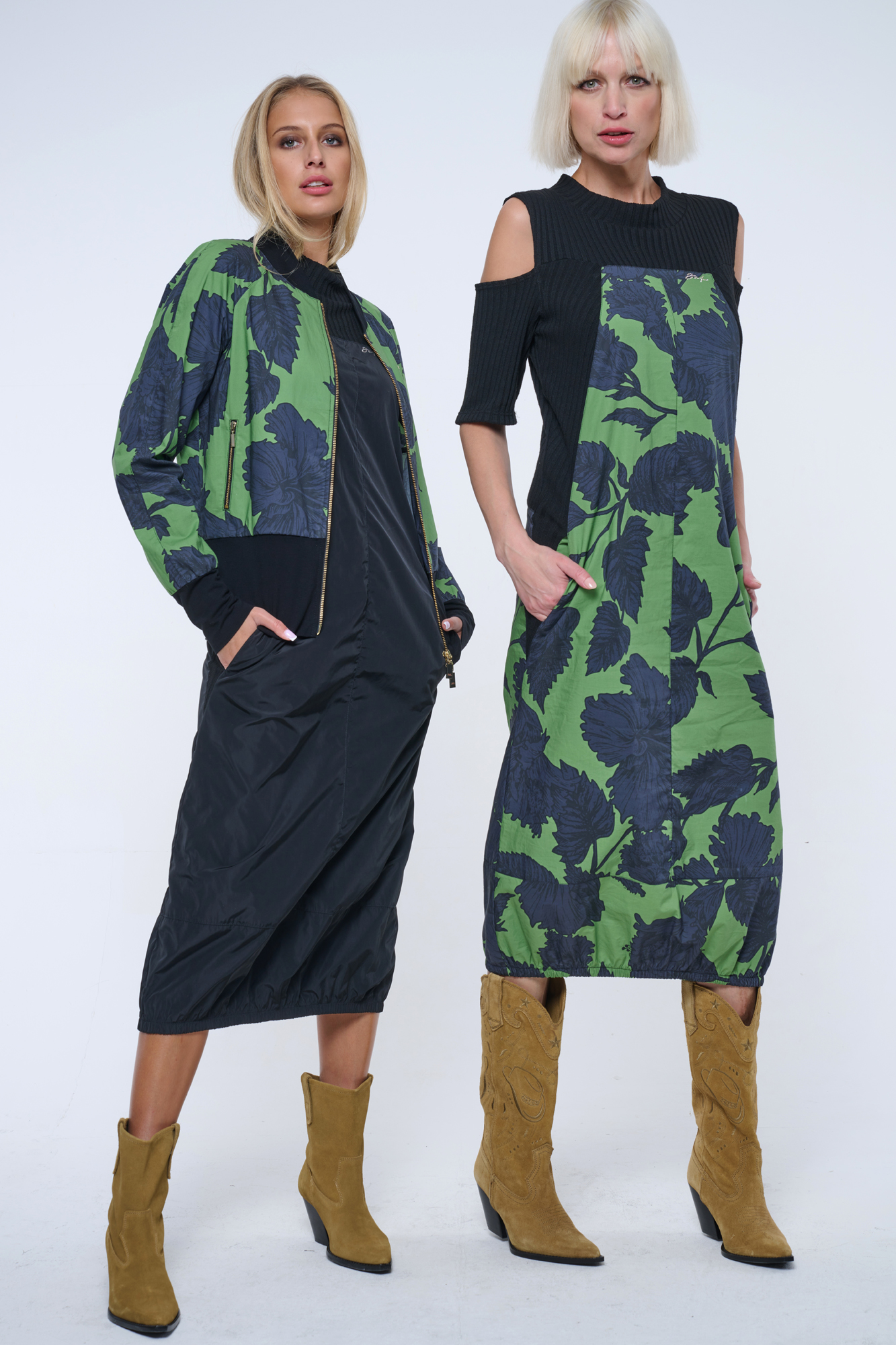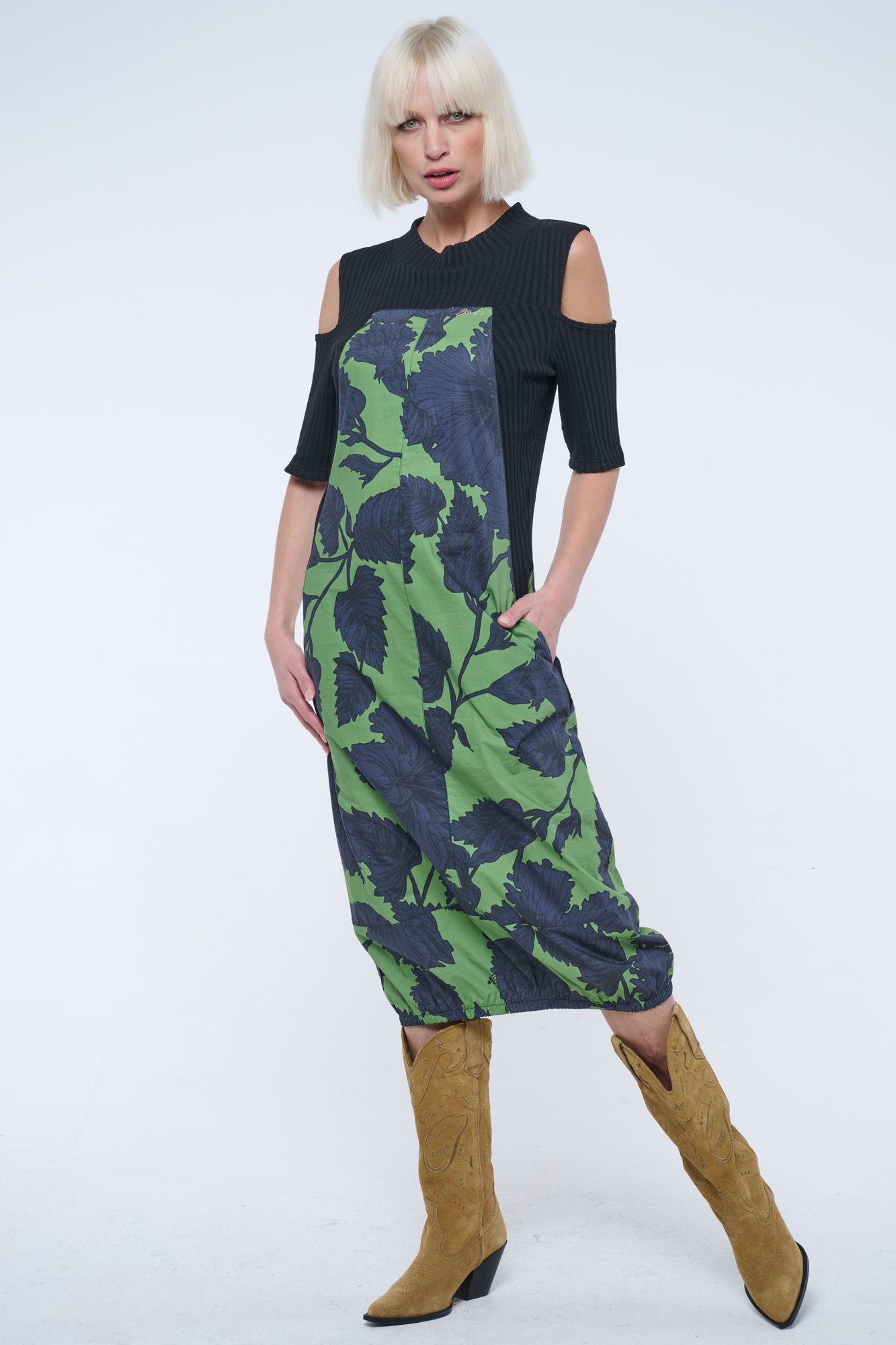 Šaty s šusťákovou balónovou sukní v kombinaci s žebrovaným úpletem. Malé zlaté krystalové logo INF.