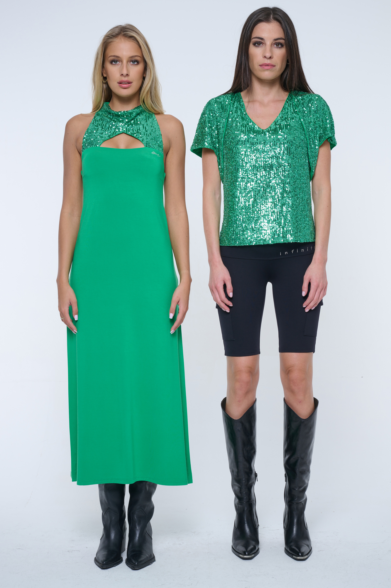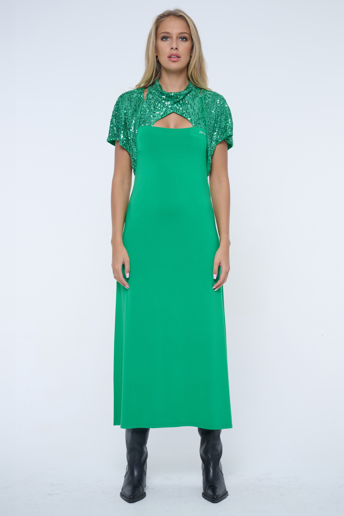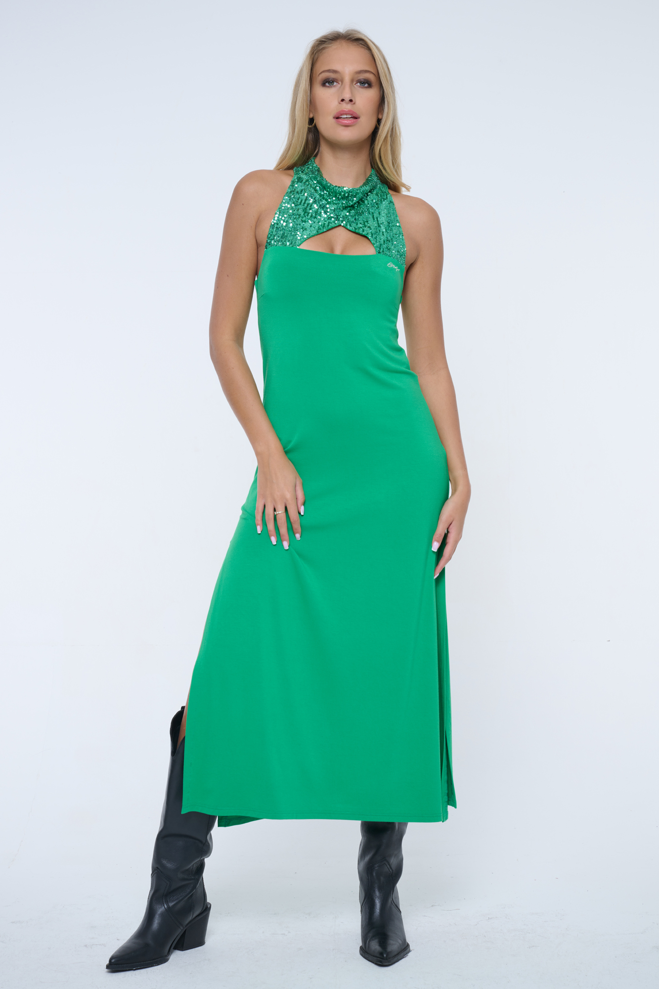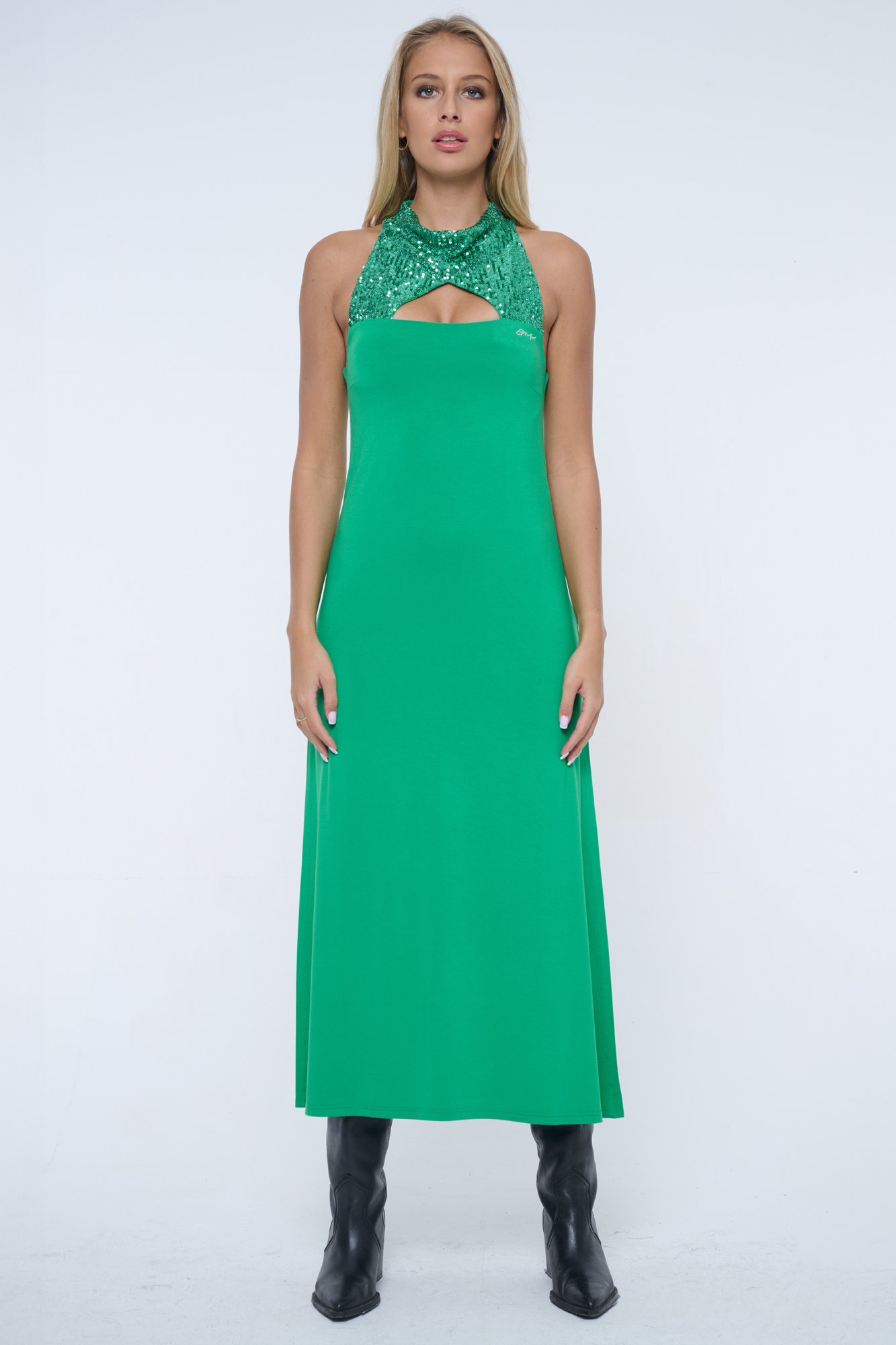 Volnější šaty z flitrového materiálu na vrchním díle. Střih s módním stojákem a americkým průramkem.