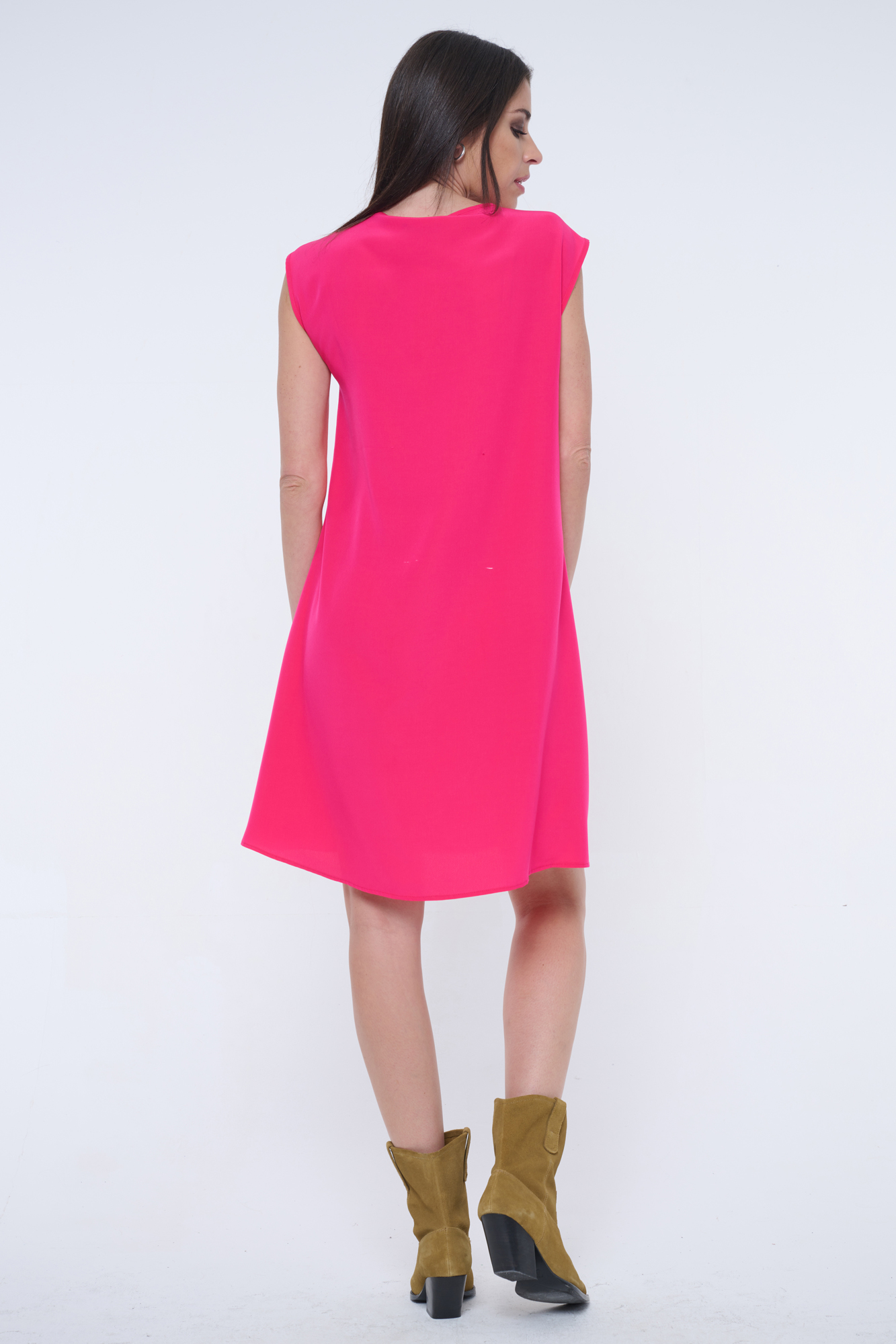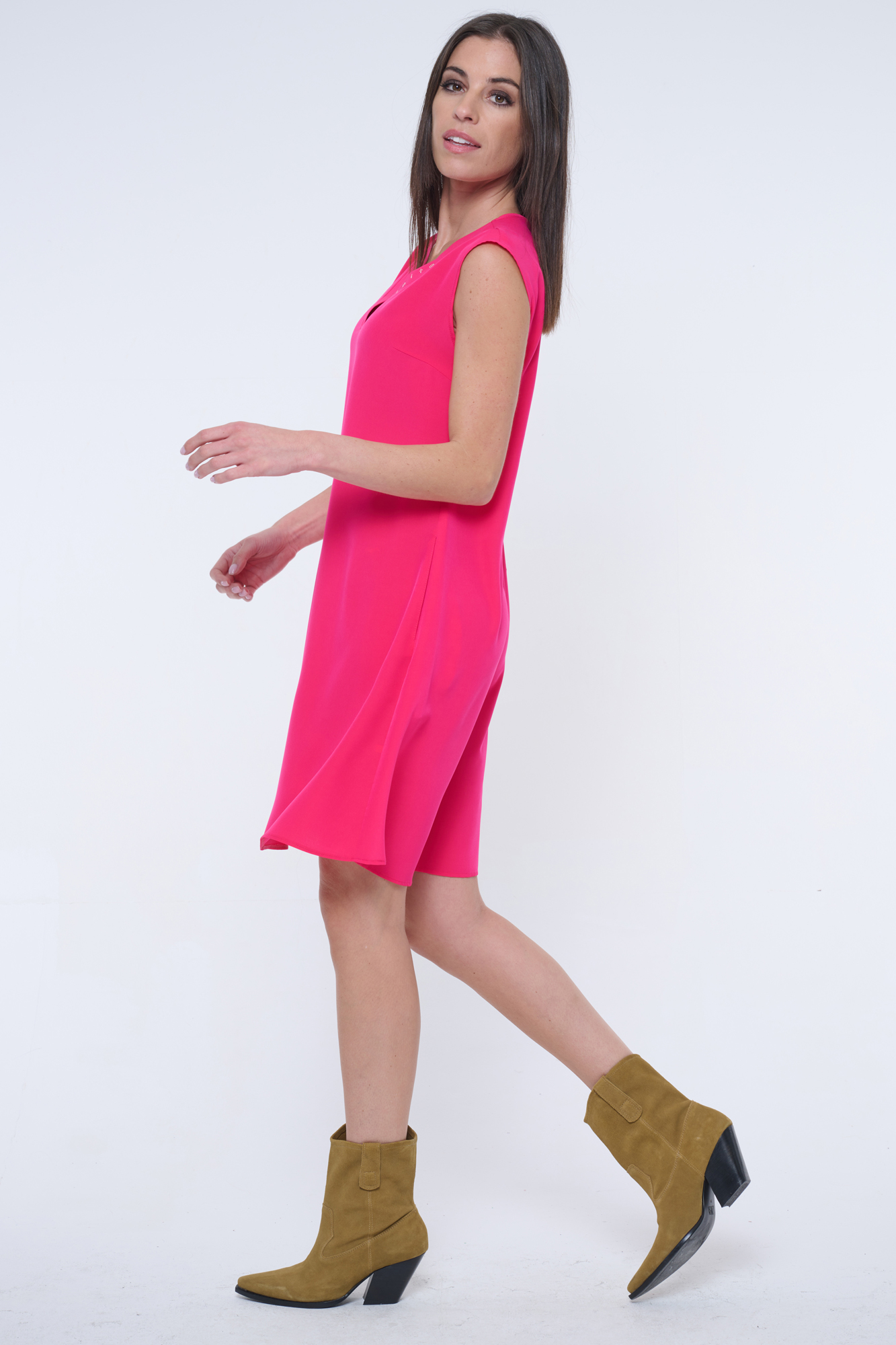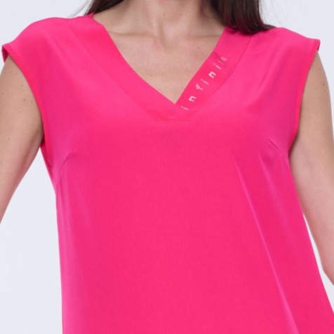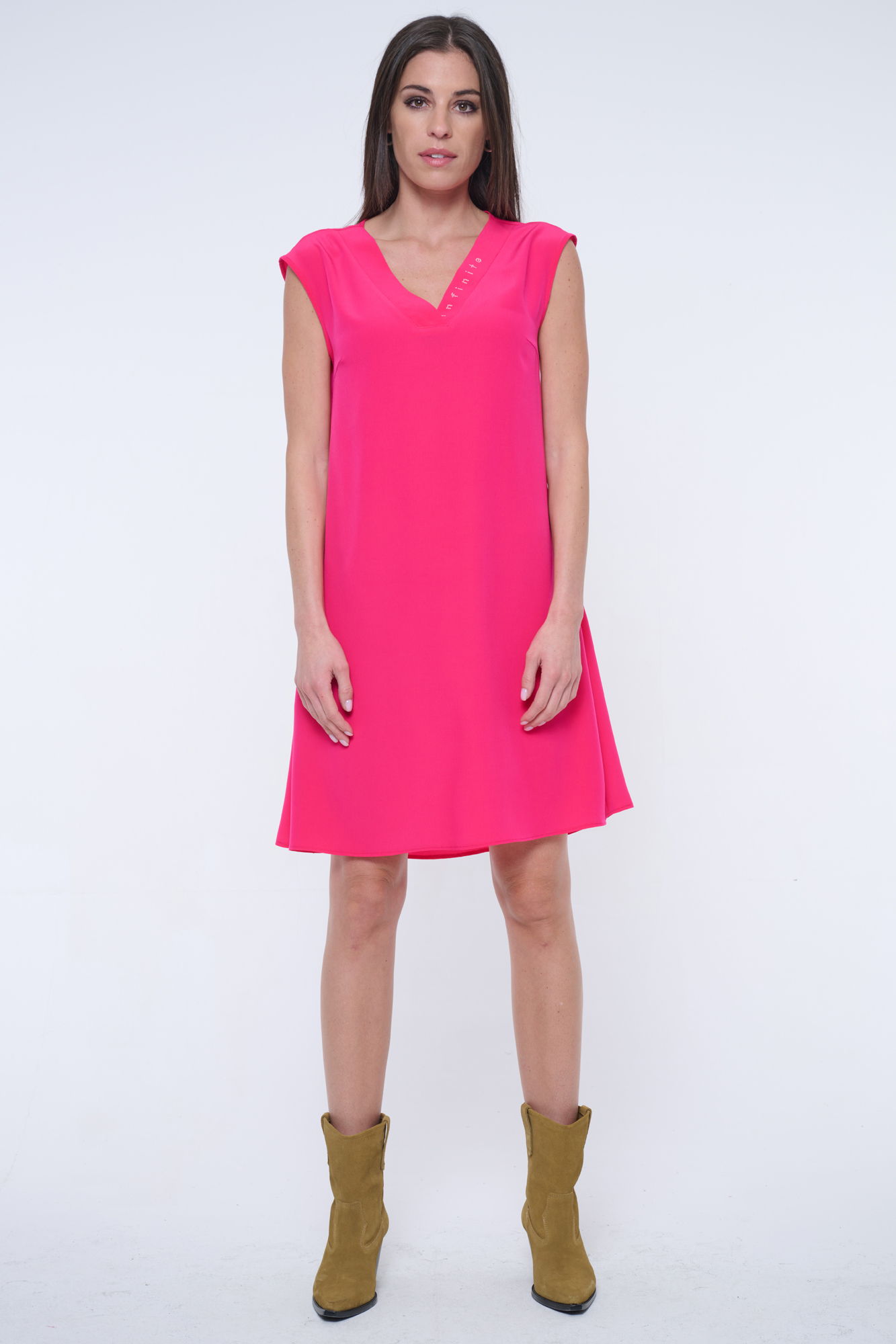 Krátké šaty s výstřihem do véčka. Ve výstřihu krystaly Infinite.