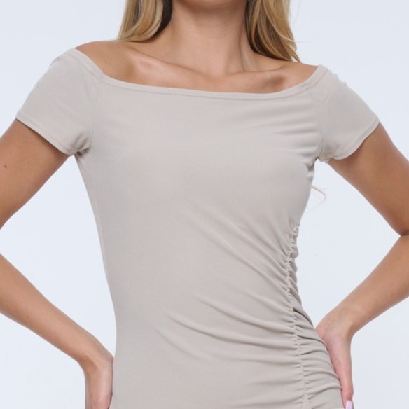 Šaty s výstřihem lehce z ramen. Na rukávu efektní krystalové logo INF. Řasení na bříšku lichotivé postavě a sukně do kanýru.