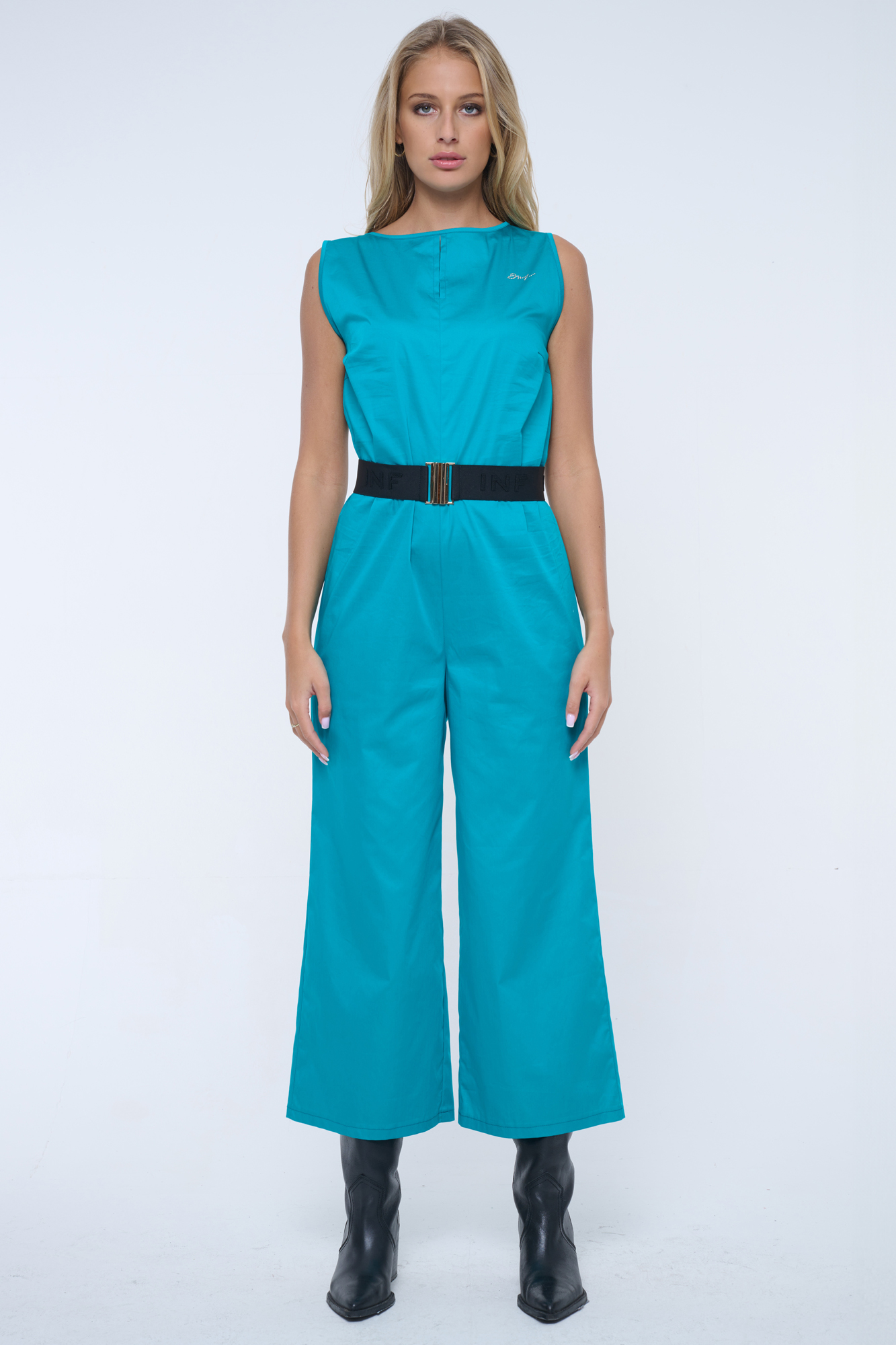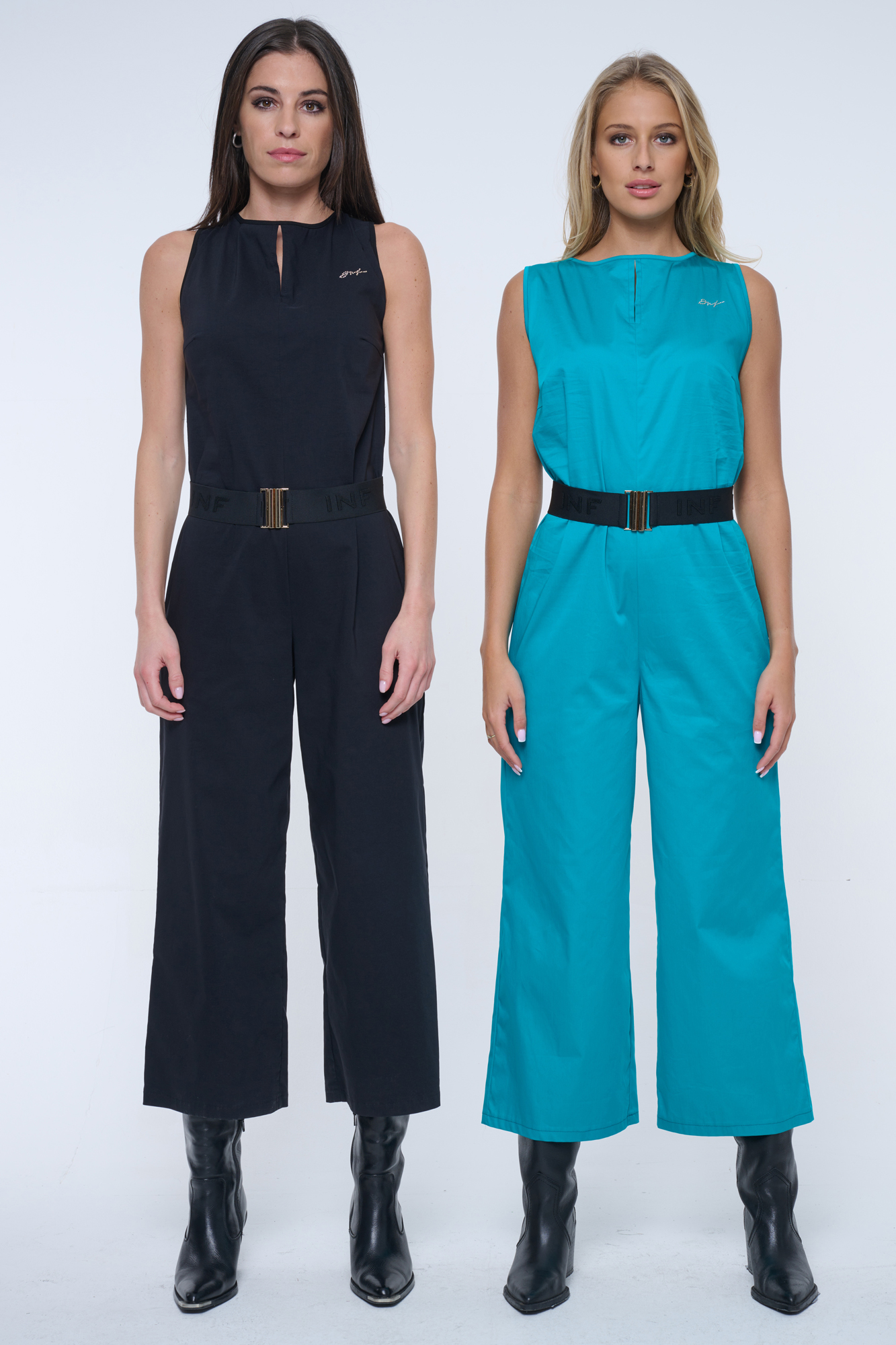 Overal ze strečového materiálu s vázačkou na zadním díle. V pase je strečový pásek z efektní gumy INF se zlatou sponou. Na předním díle zlaté krystalové logo INF.