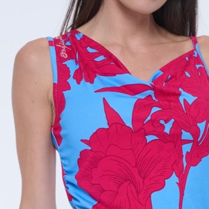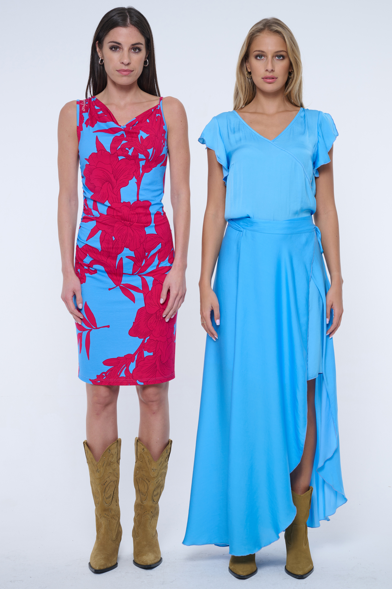 Asymetrické kratší šaty s řasením na straně na denní nošení. Na ramínku krystalové logo Infinite.