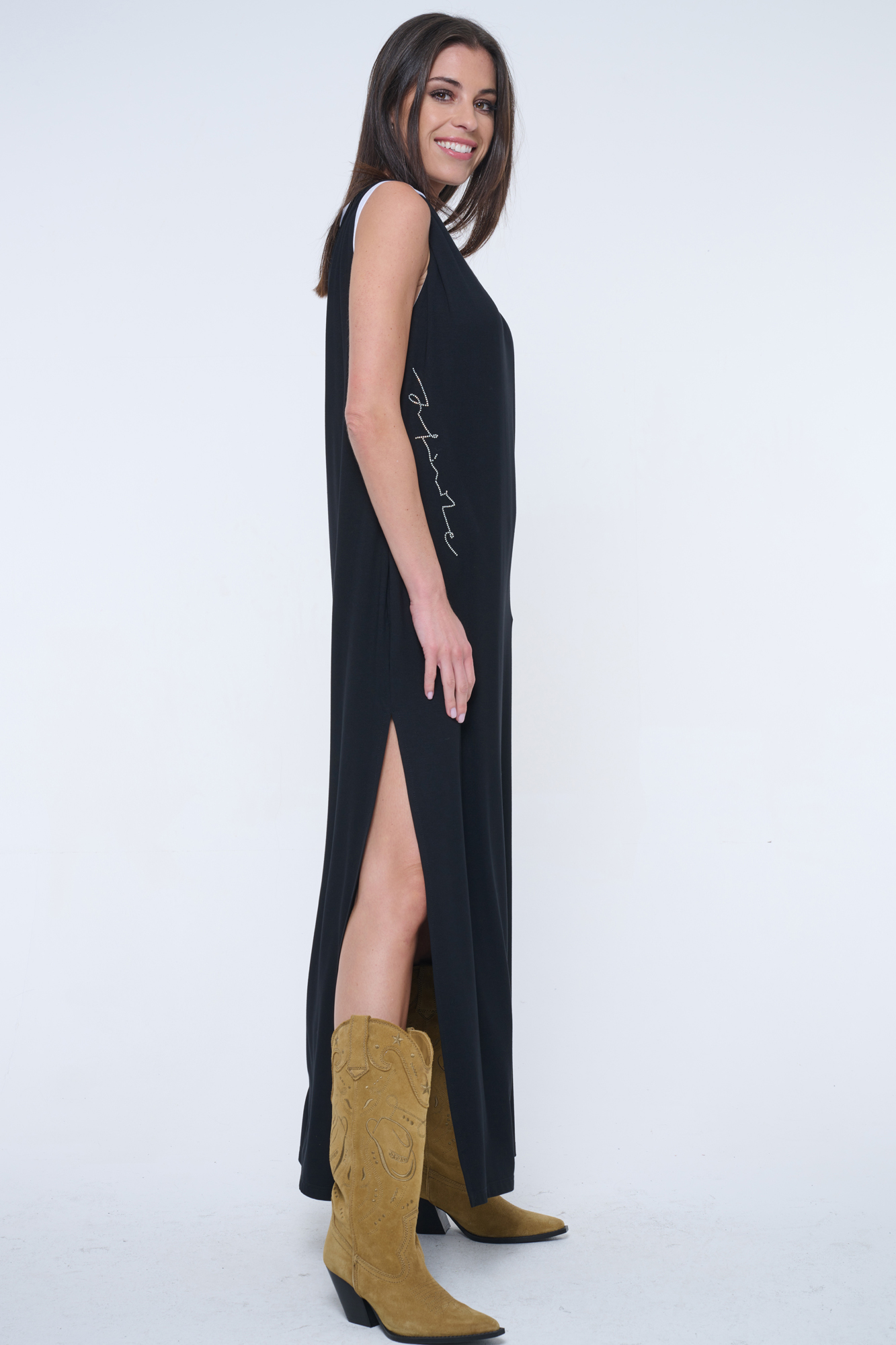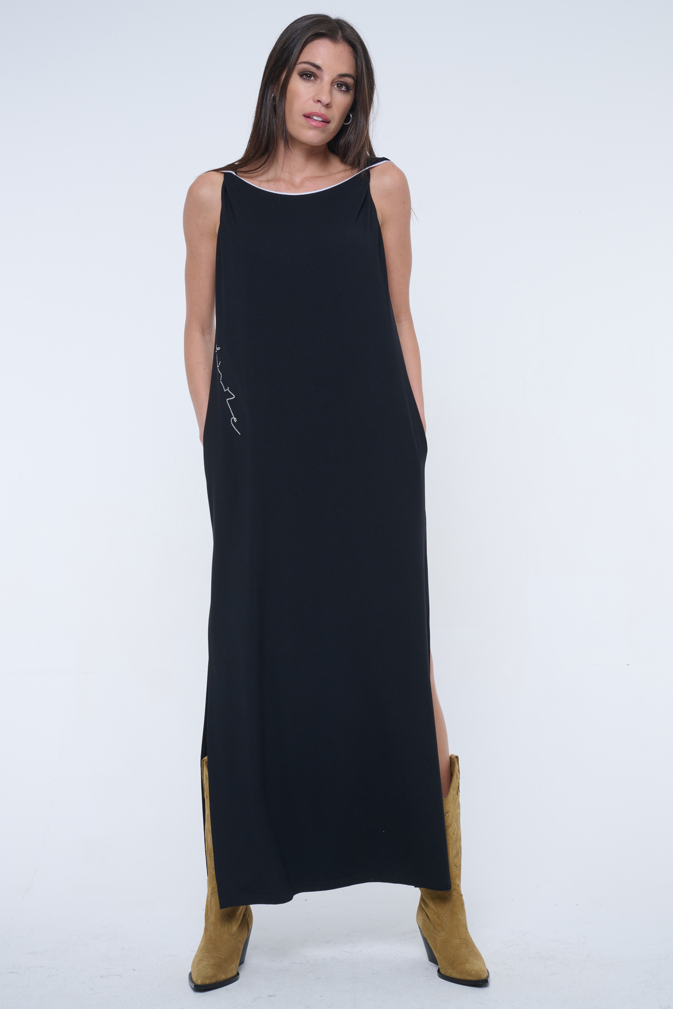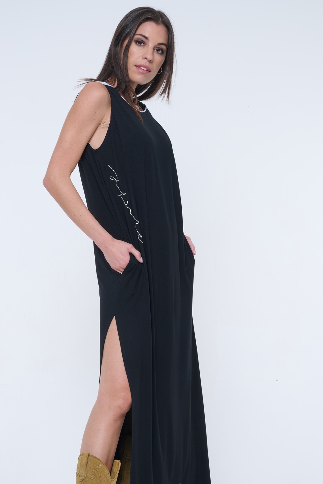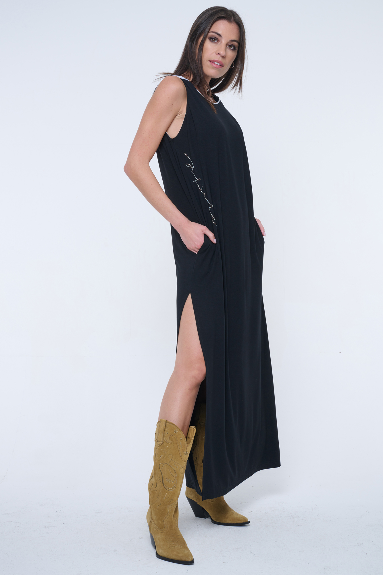Dlouhé šaty volnějšího střihu s kapsami. Na boku bílé krystaly Infinite. Efektní lesklý materiál ve výstřihu.
