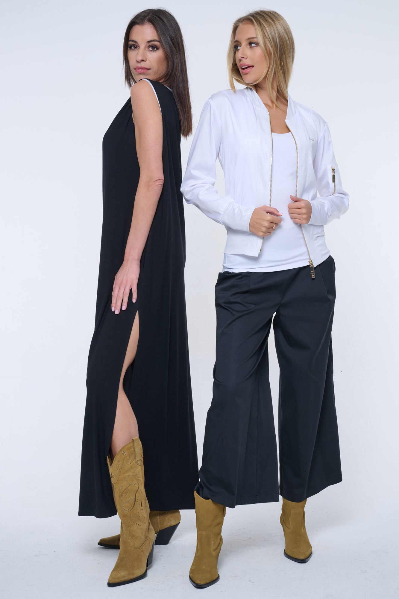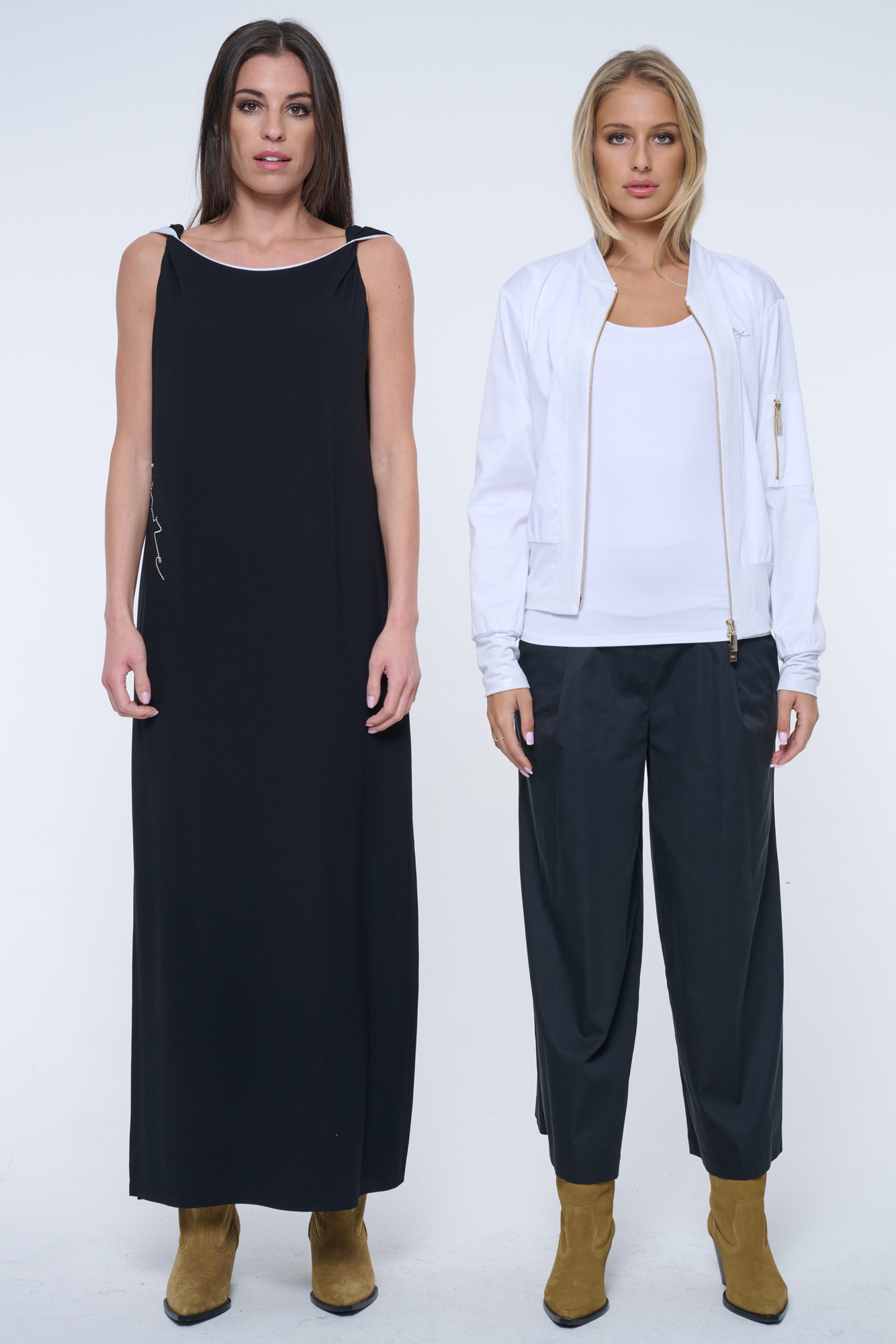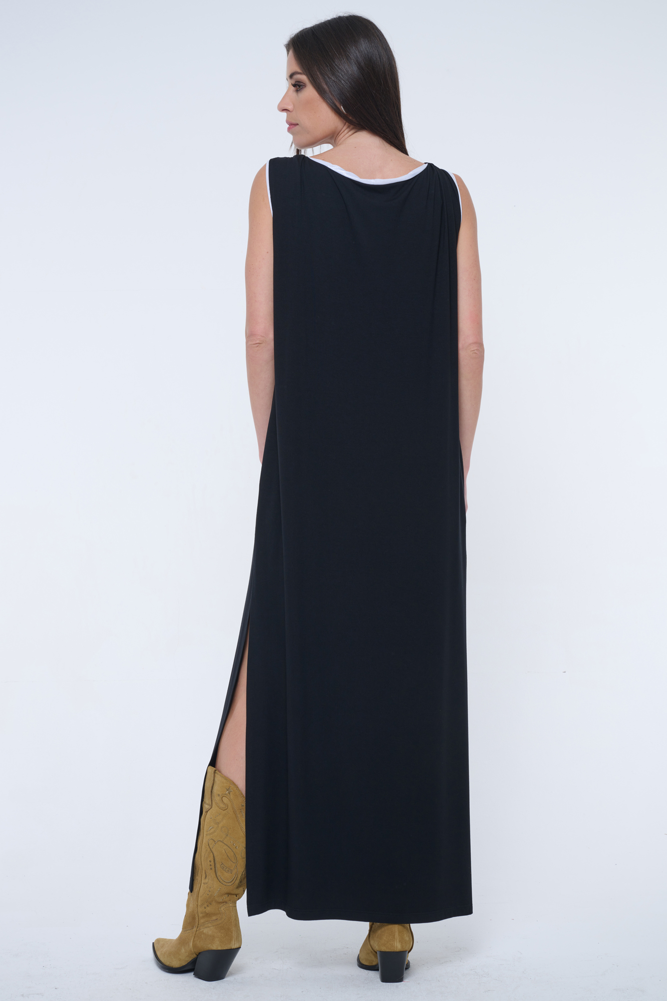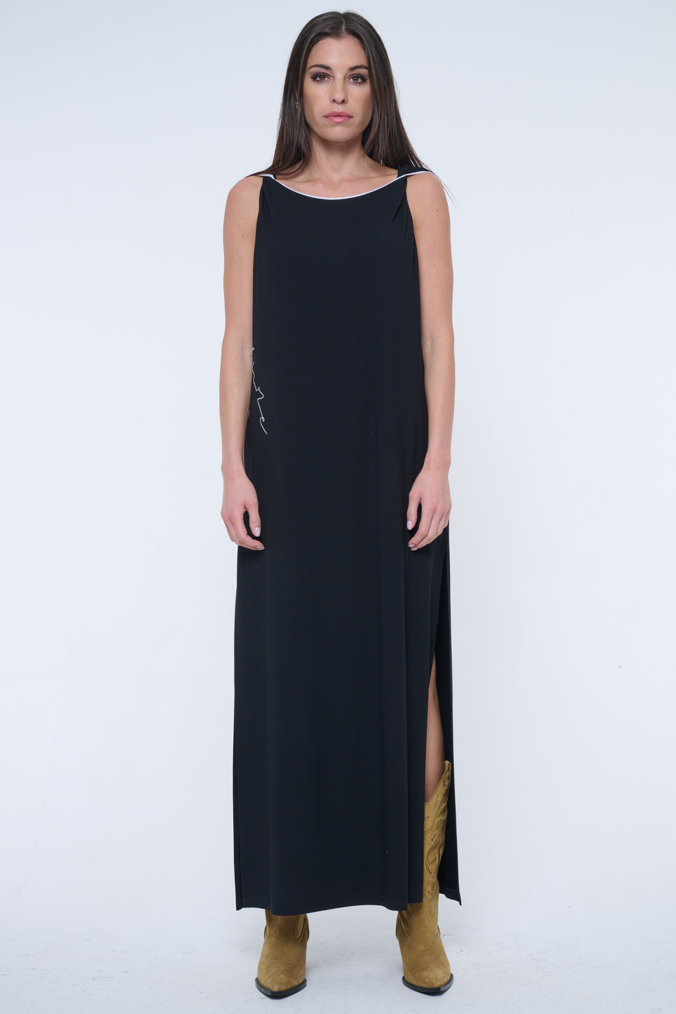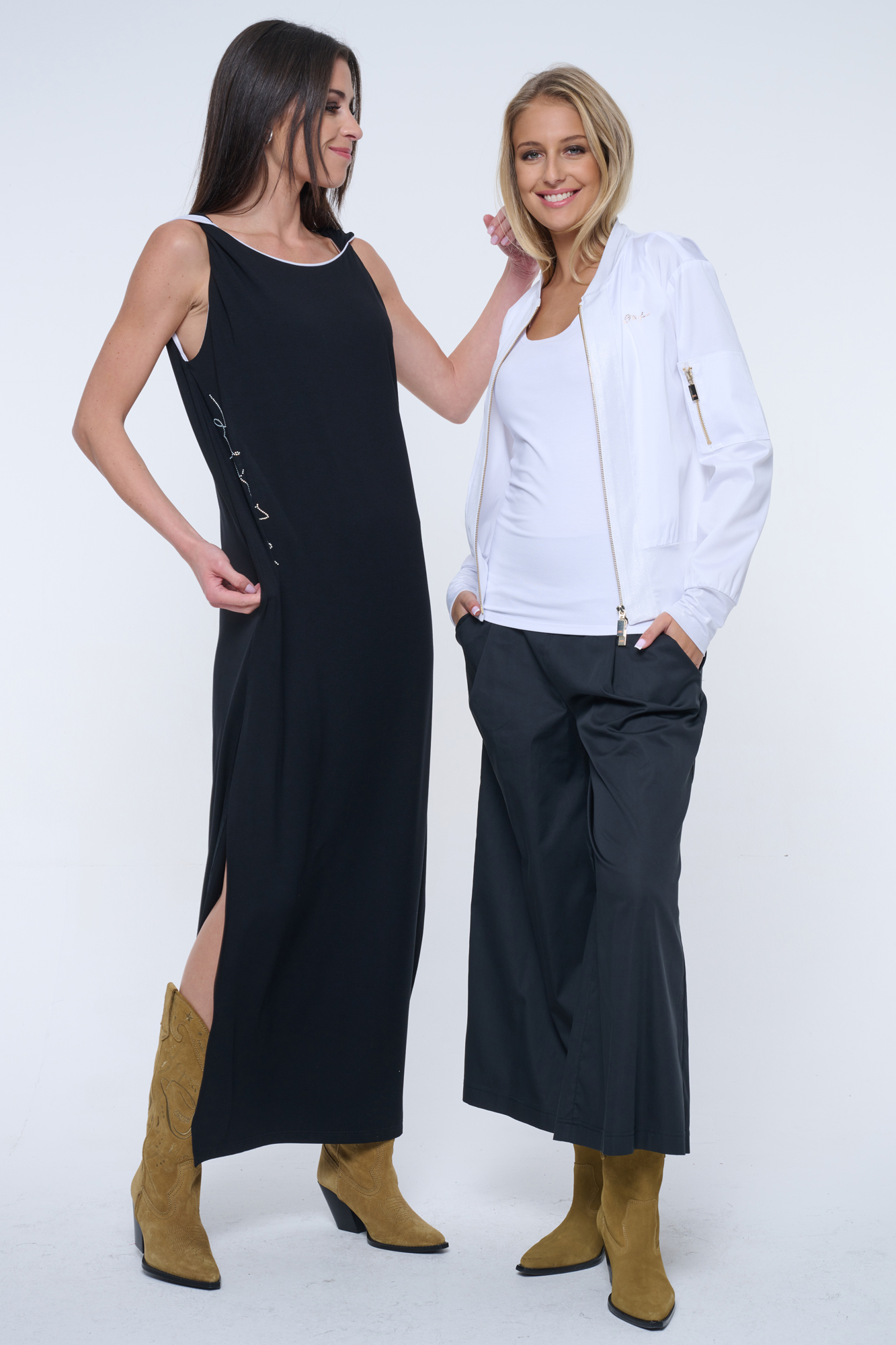 Dlouhé šaty volnějšího střihu s kapsami. Na boku bílé krystaly Infinite. Efektní lesklý materiál ve výstřihu.