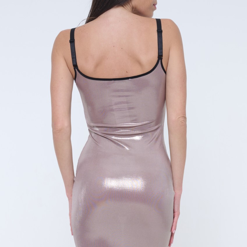 Dlouhé strečové šaty na úzká ramínka. Na předním díle černý tisk.