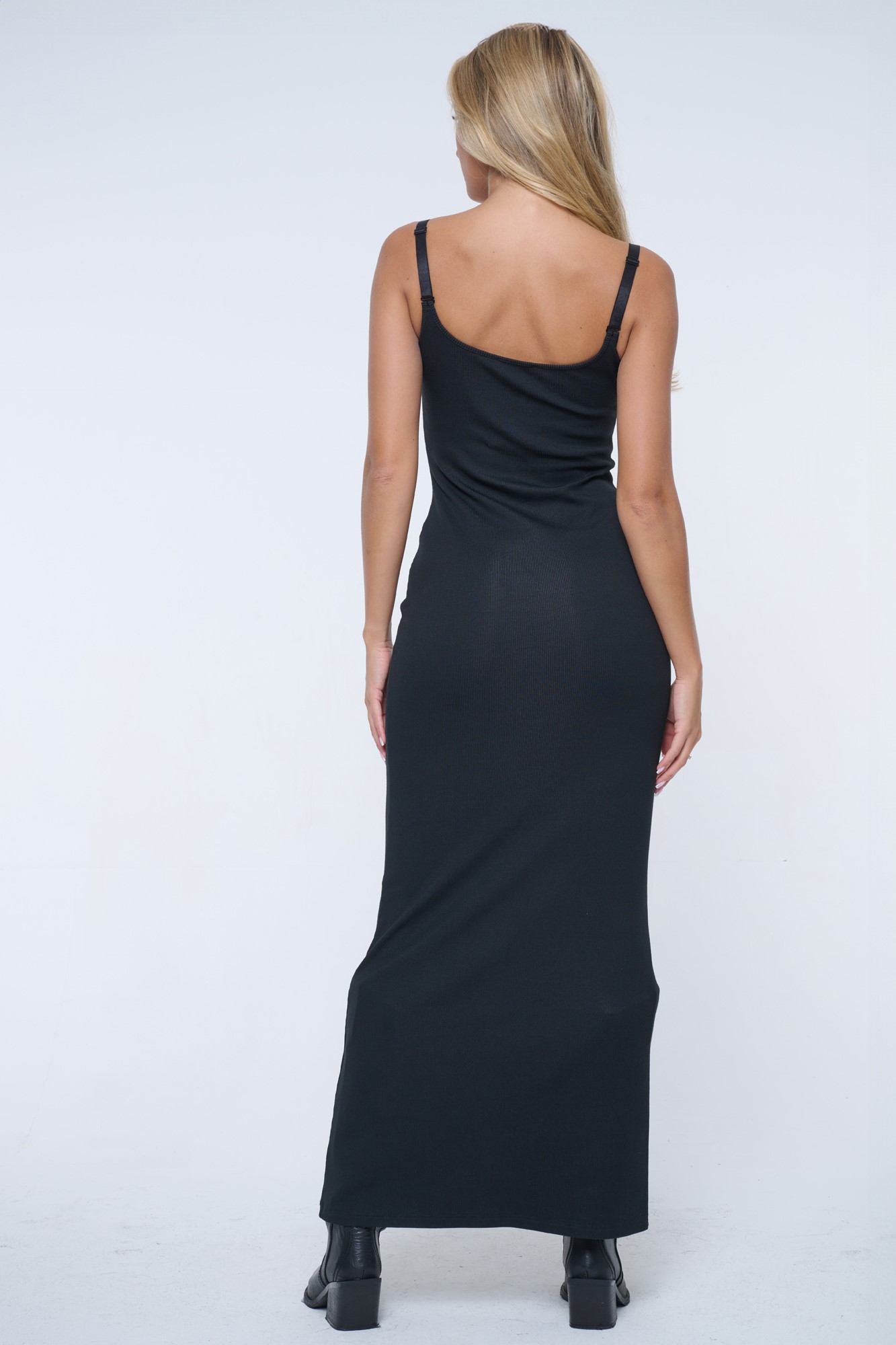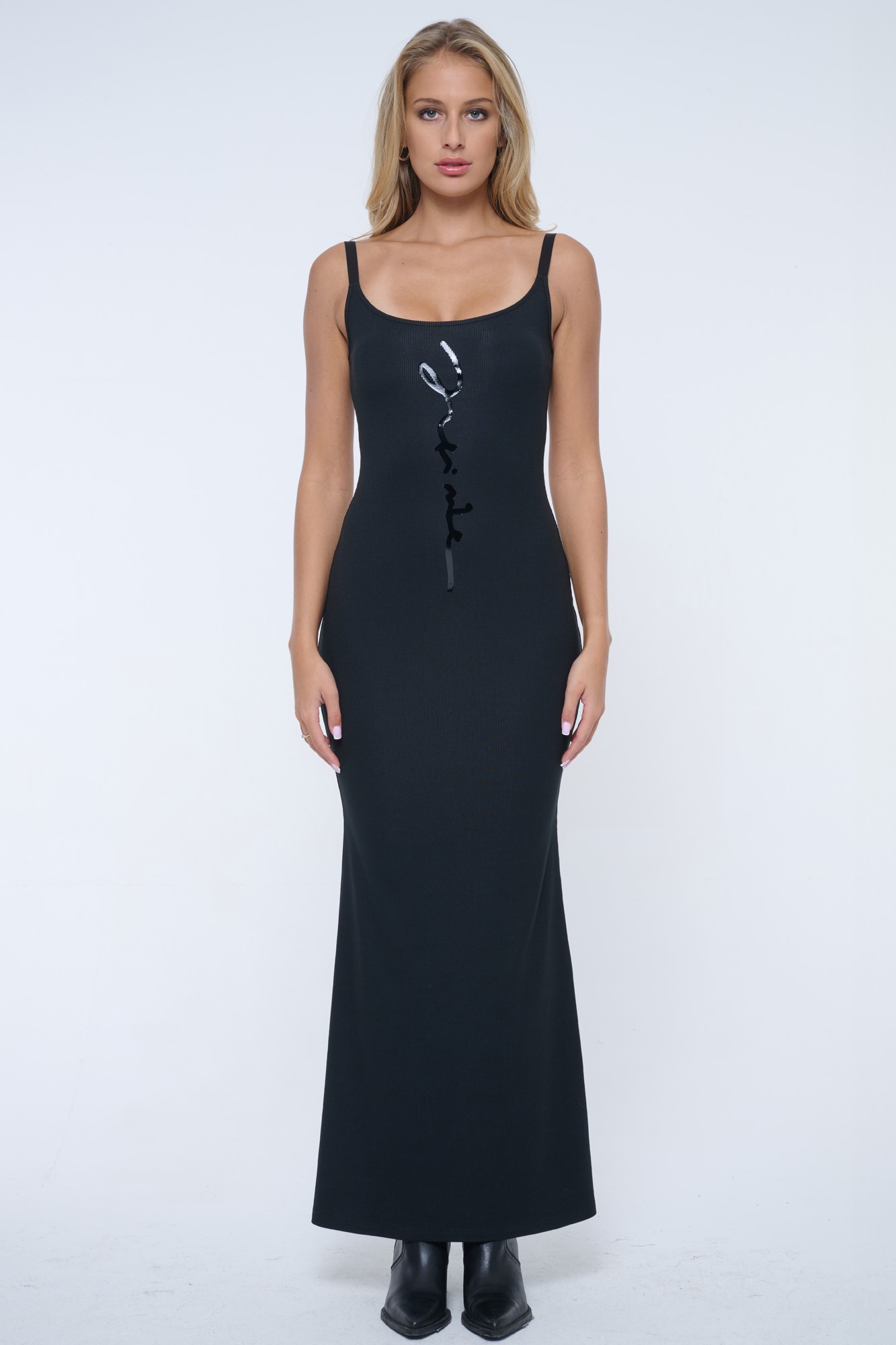 Dlouhé strečové šaty ze žebra na úzká ramínka. Na předním díle černý tisk.