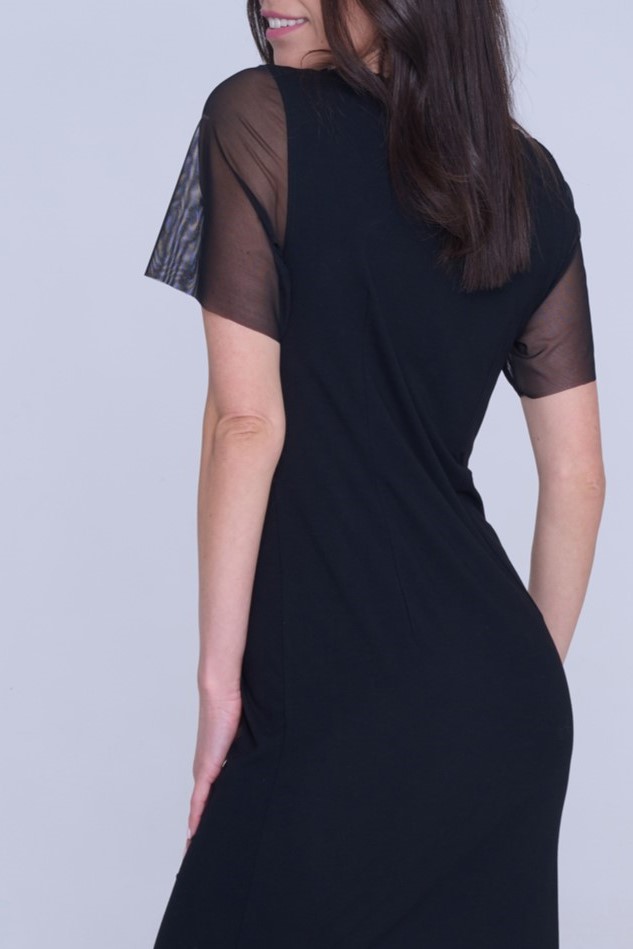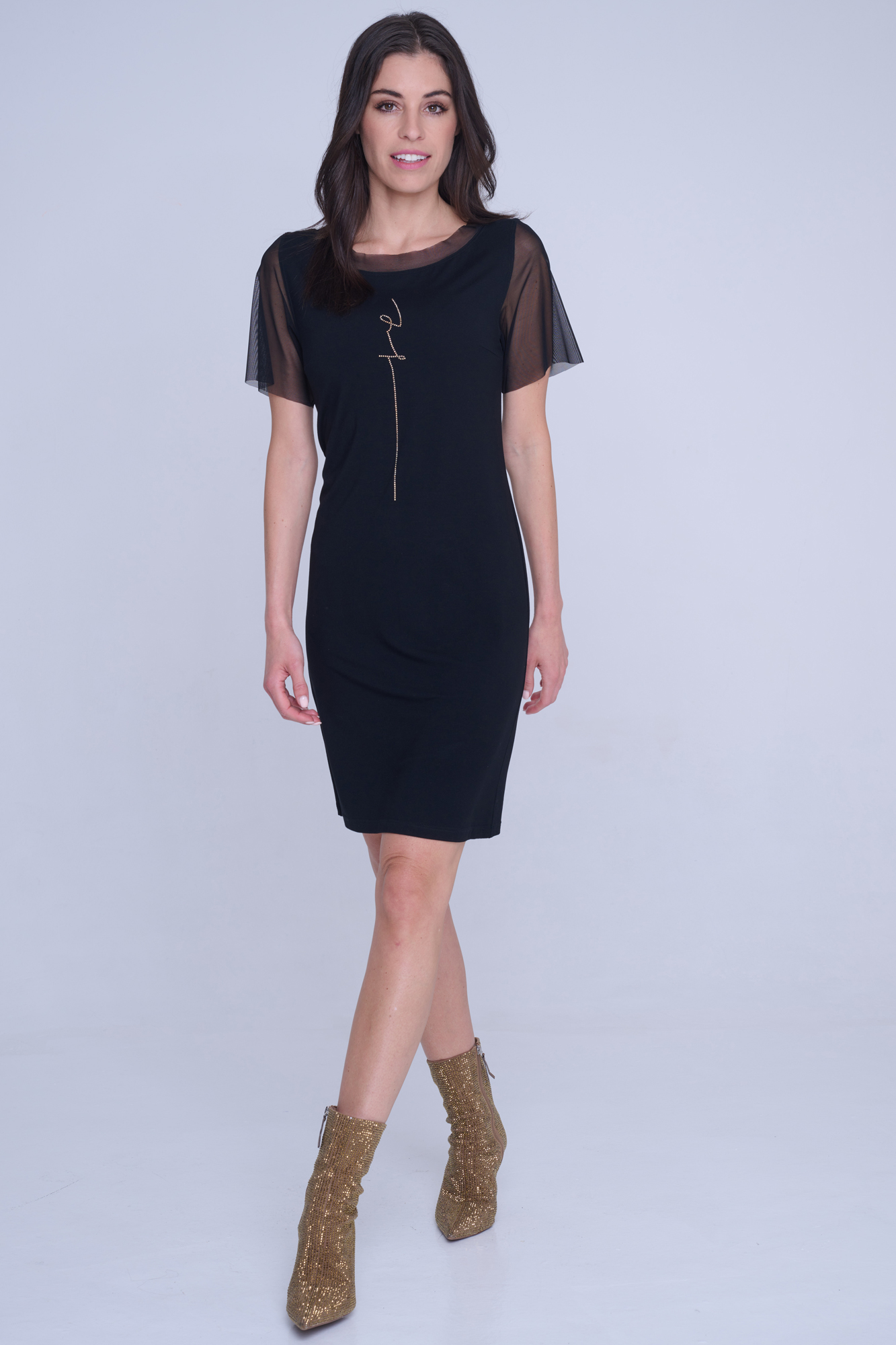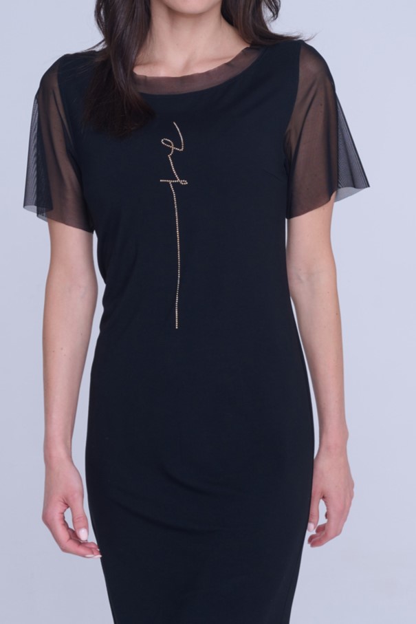 Úpletové šaty nad kolena s dlouhým zlatým krystalovým motivem INF. V kombinaci s tylem.
