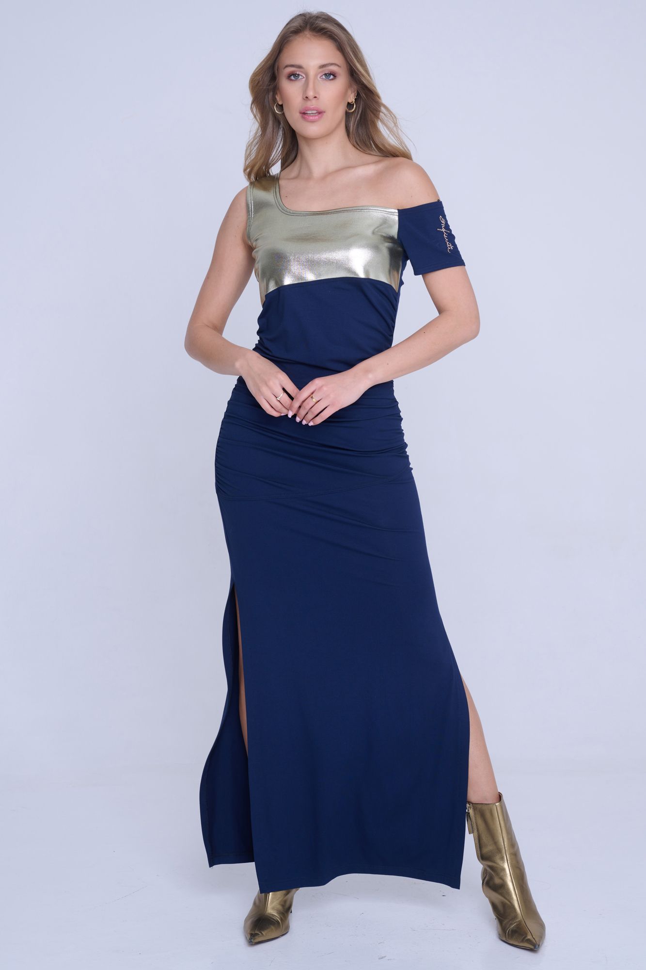Úpletové šaty Infinite asymetrického střihu. Na rameni krystalový motiv INF. Vhodné i na letní party.