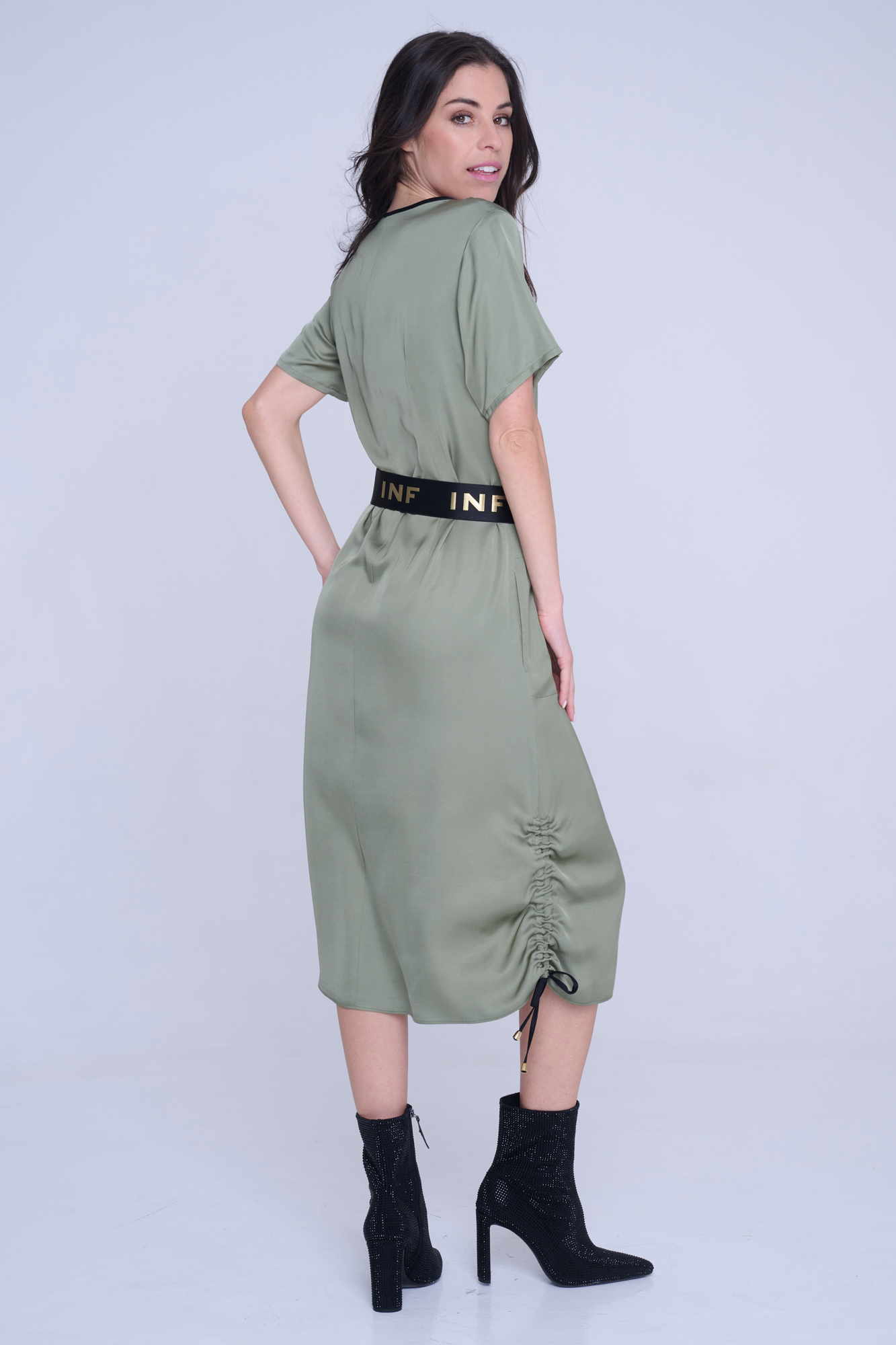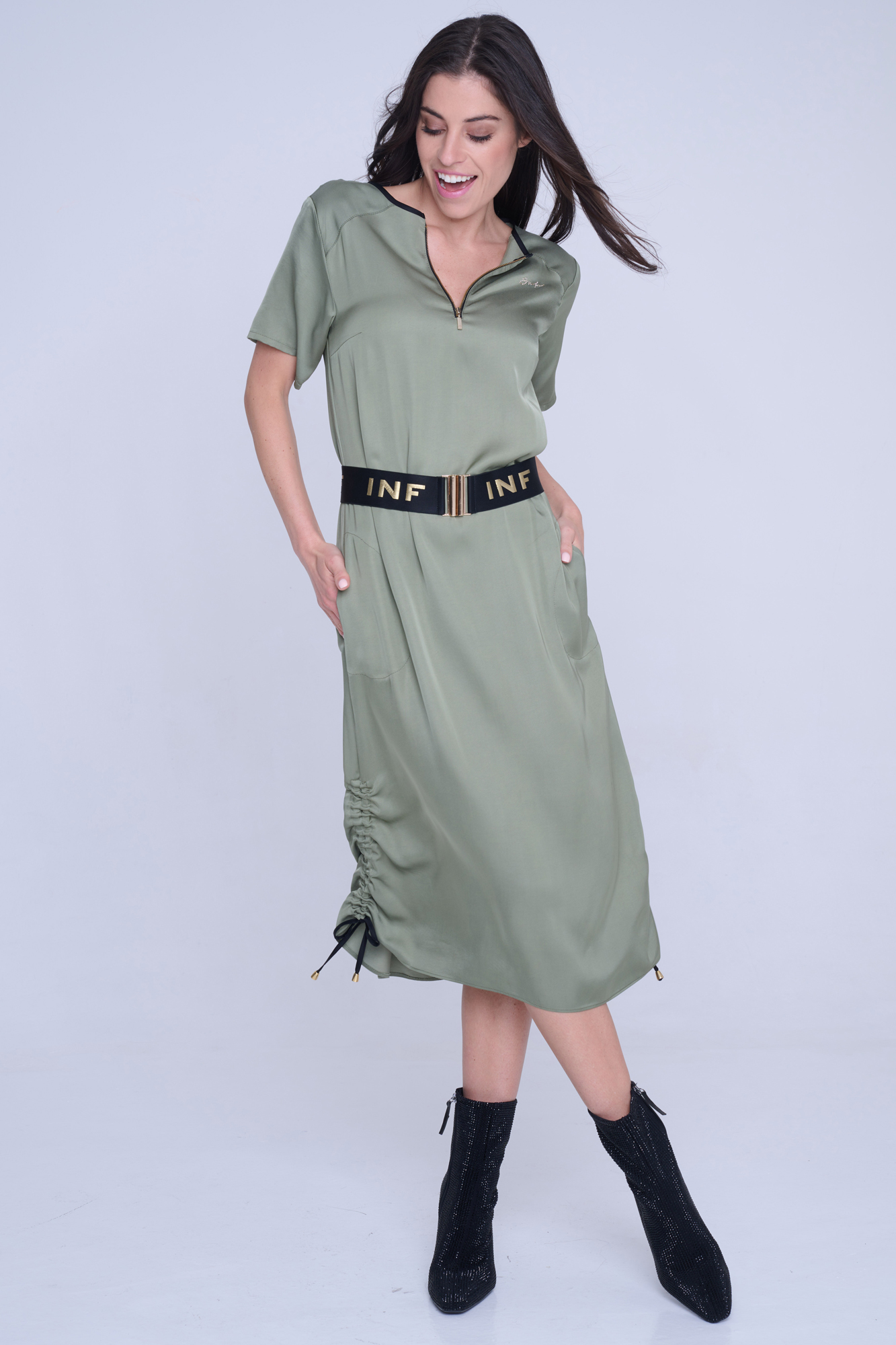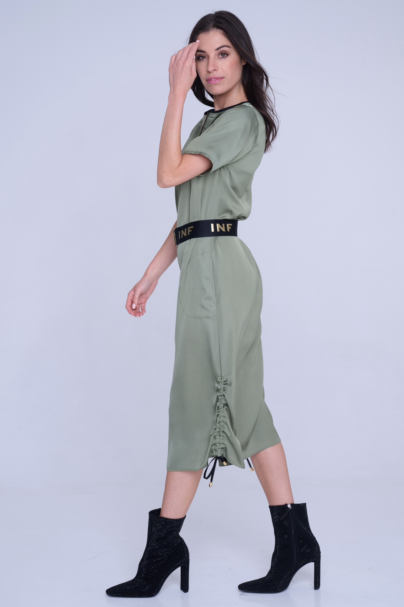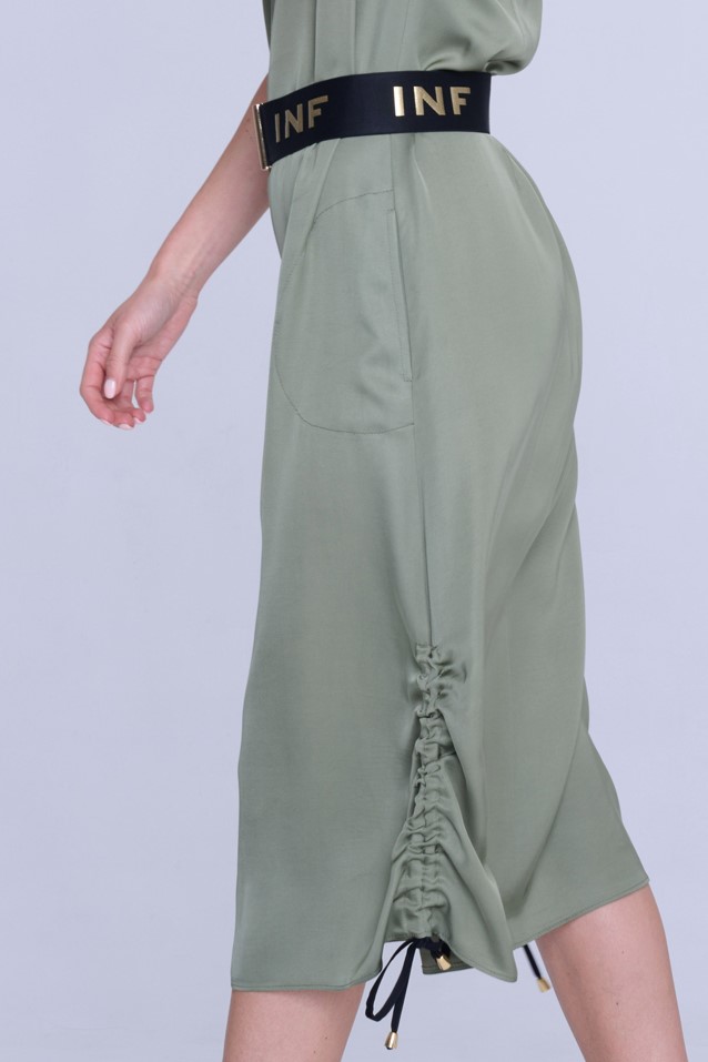 Šaty Infinite volnějšího střihu z velmi příjemného strečového přírodního materiálu. Zlatý zip ve výstřihu. Detaily nabírání na stranách s nastavitelnými vázačkami. Na předním díle zlatý krystalový motiv INF.