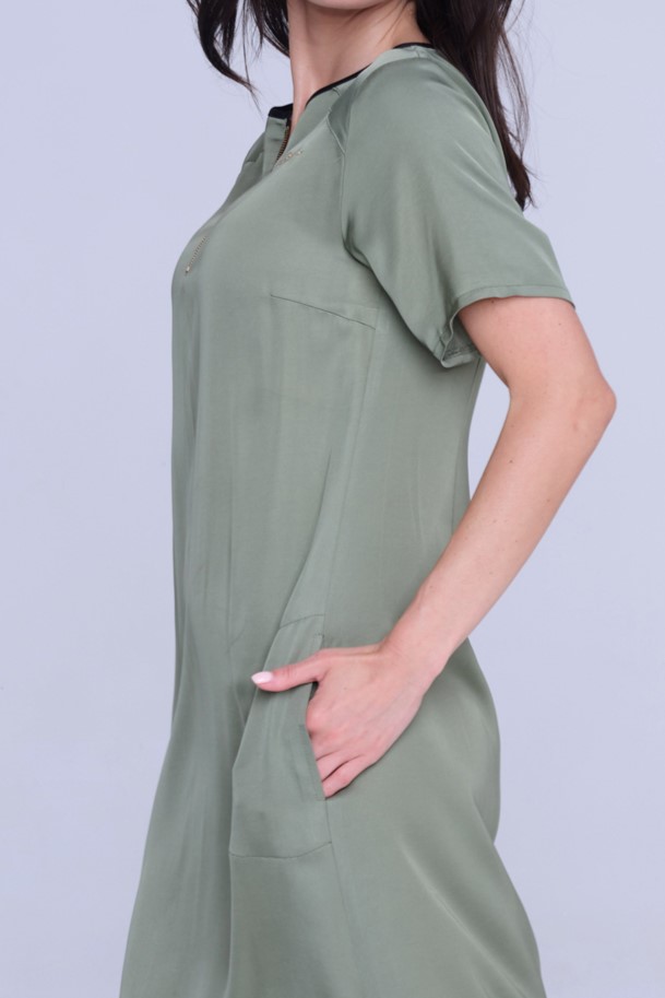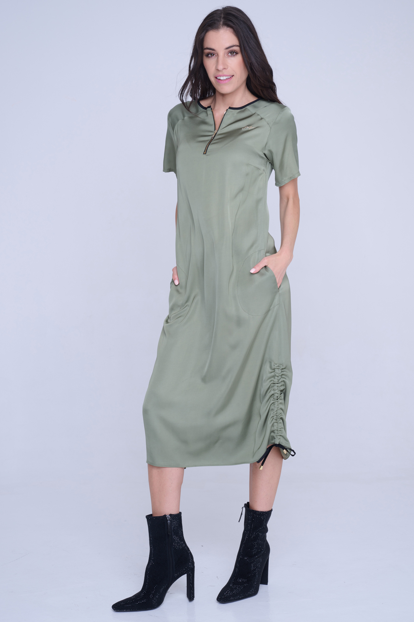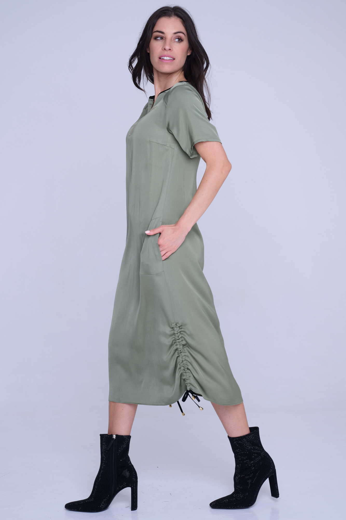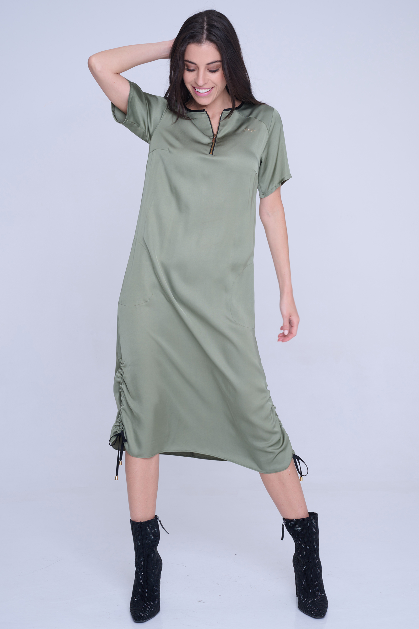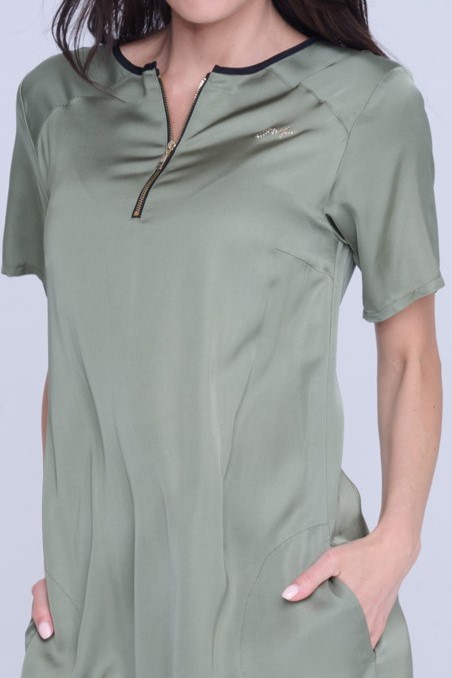 Šaty Infinite volnějšího střihu z velmi příjemného strečového přírodního materiálu. Zlatý zip ve výstřihu. Detaily nabírání na stranách s nastavitelnými vázačkami. Na předním díle zlatý krystalový motiv INF.