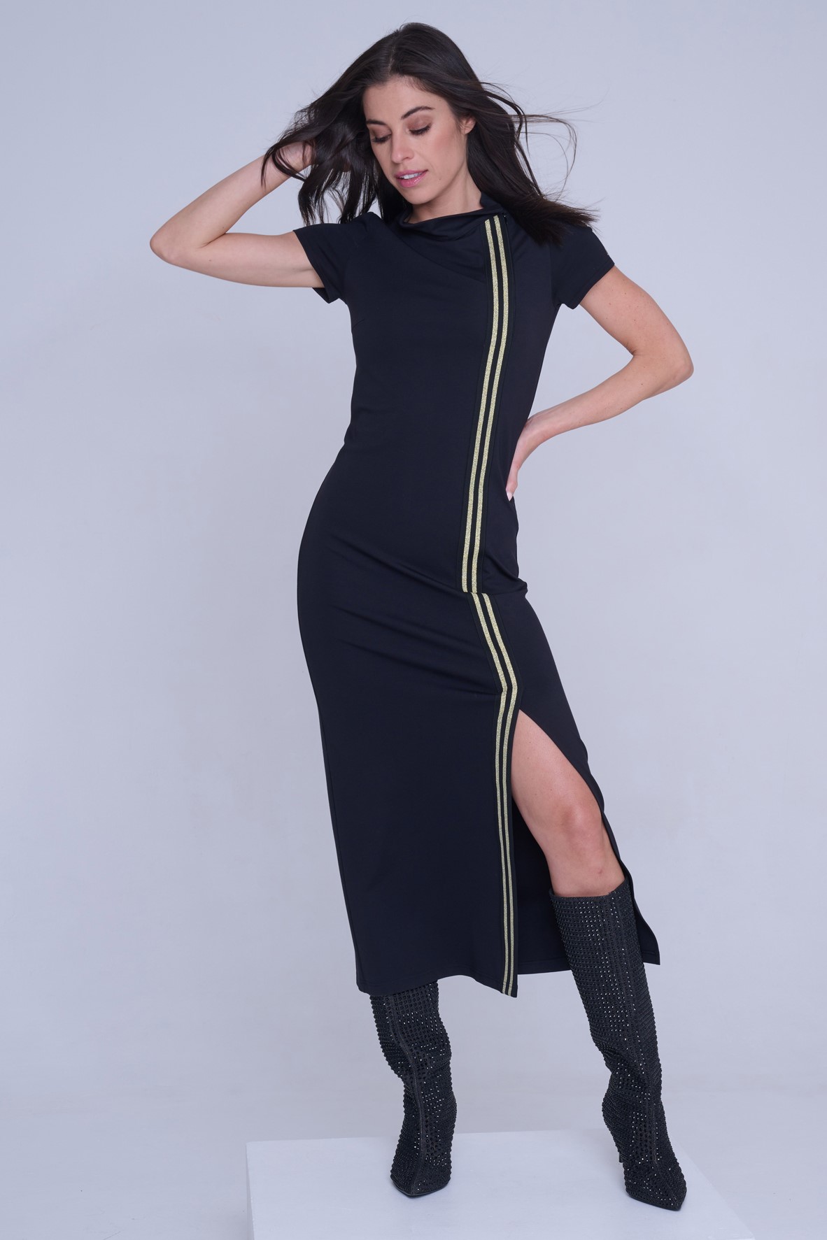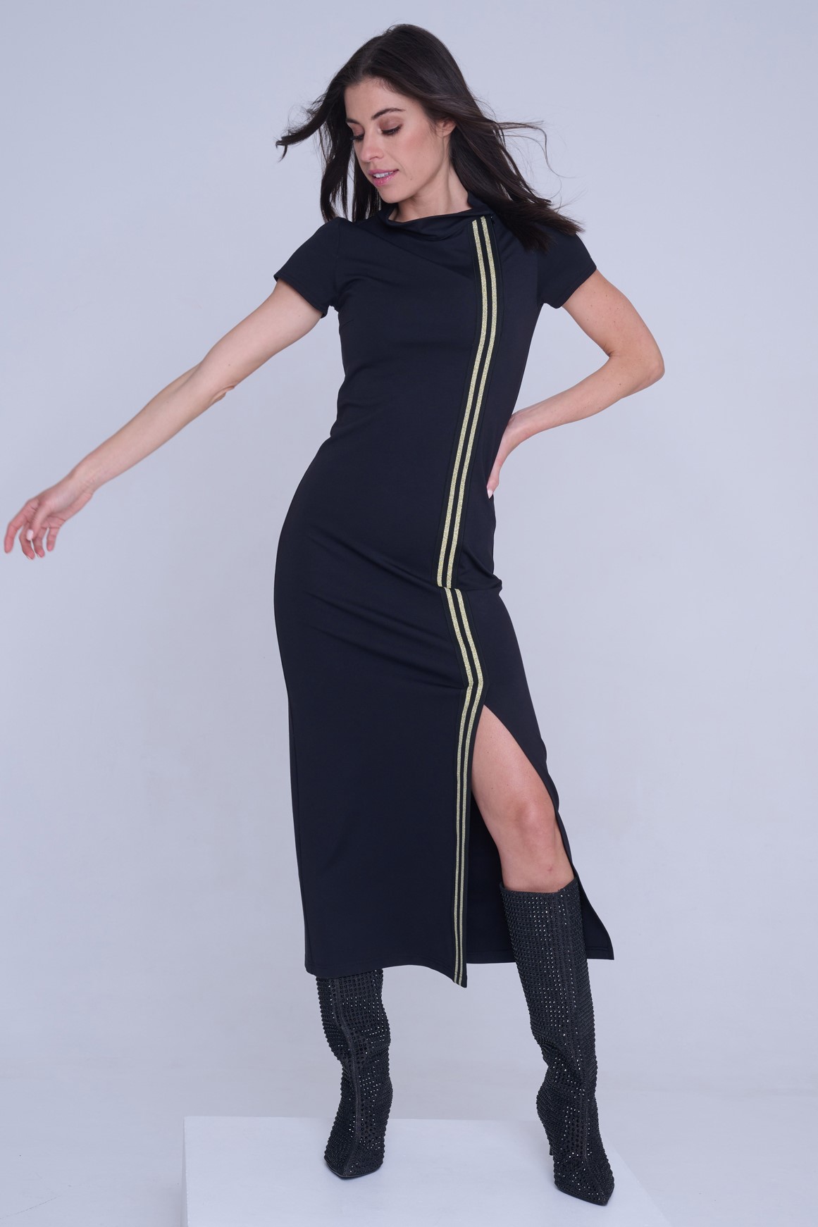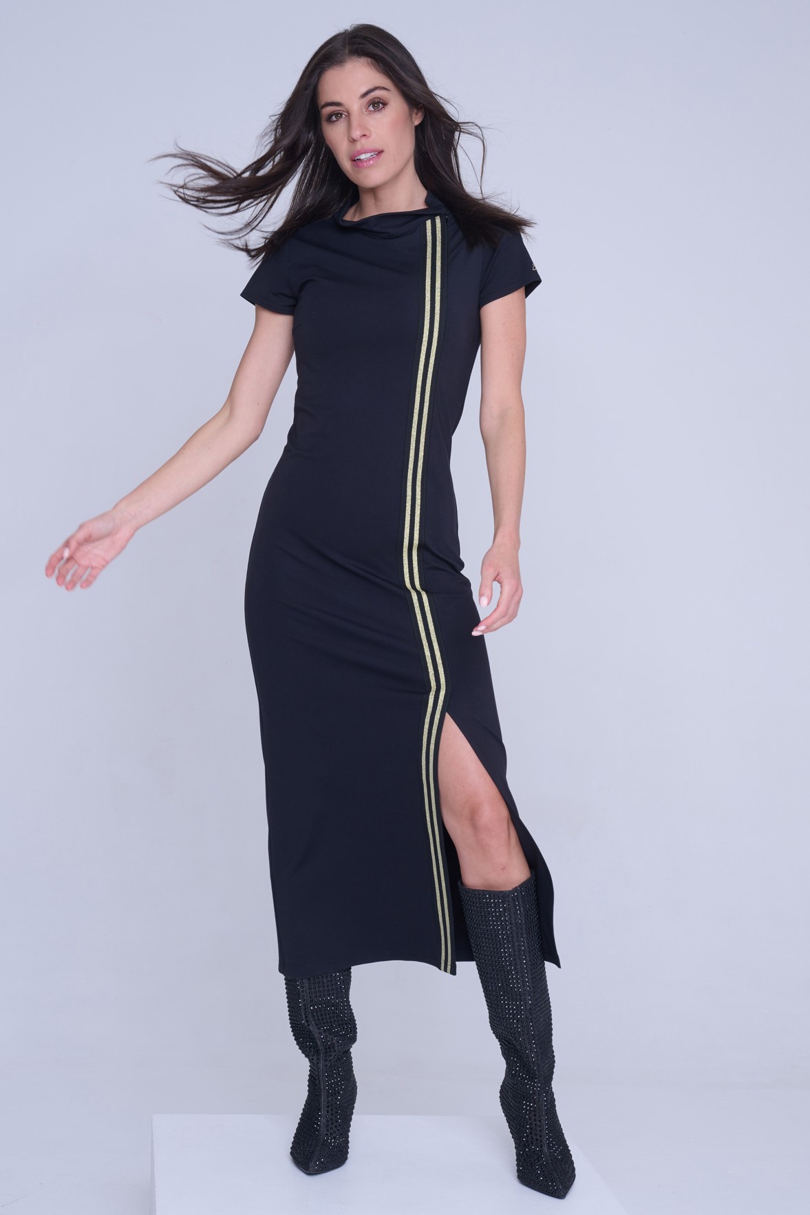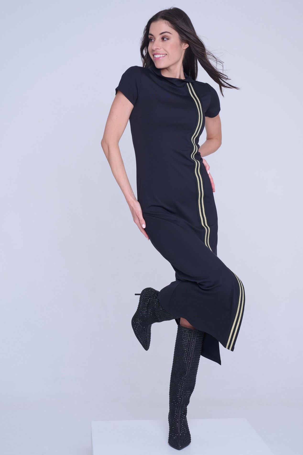 Šaty Infinite v lady délce s efektní černozlatou stuhou. Na rameni zlaté krystalové logo INF.