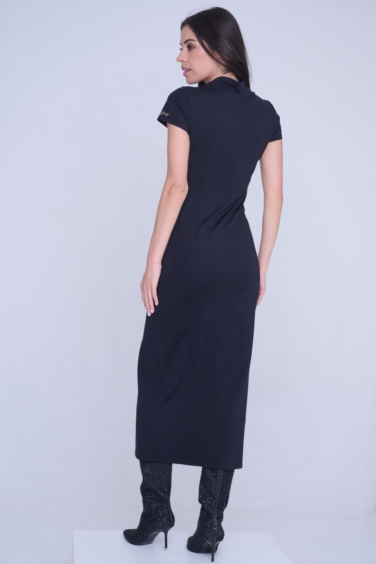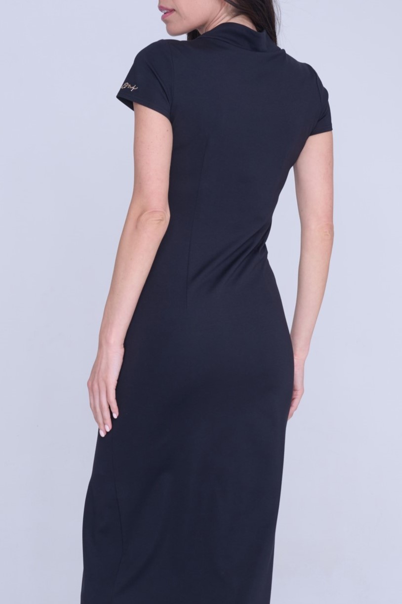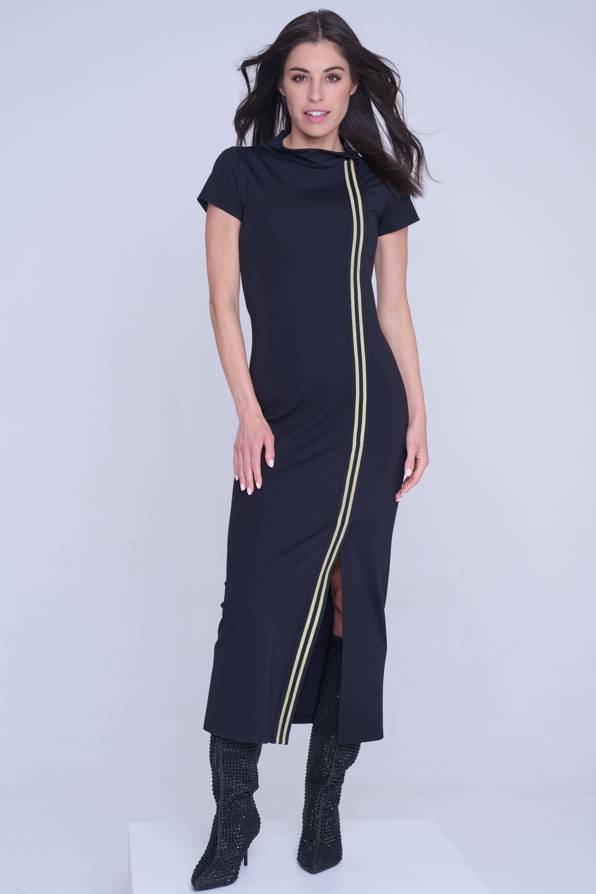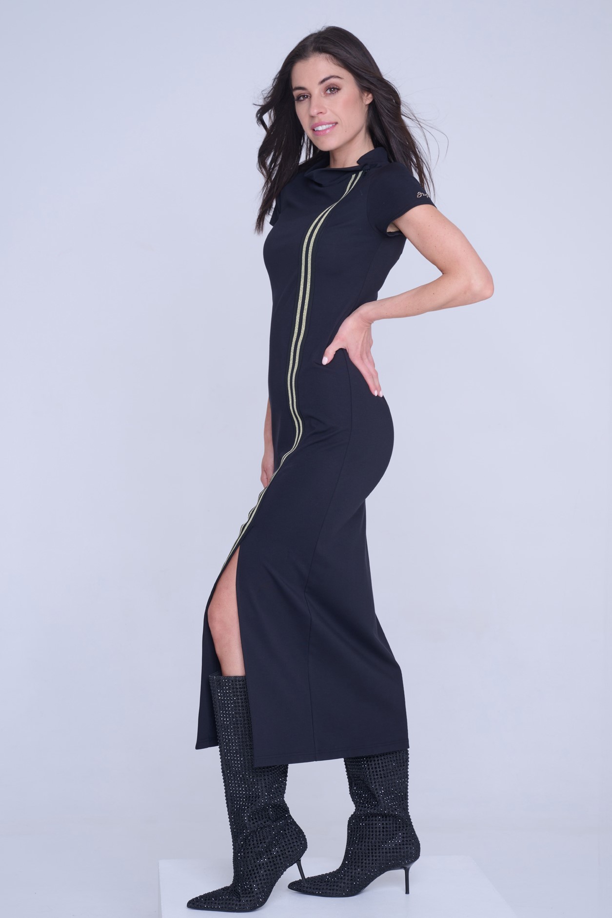 Šaty Infinite v lady délce s efektní černozlatou stuhou. Na rameni zlaté krystalové logo INF.
