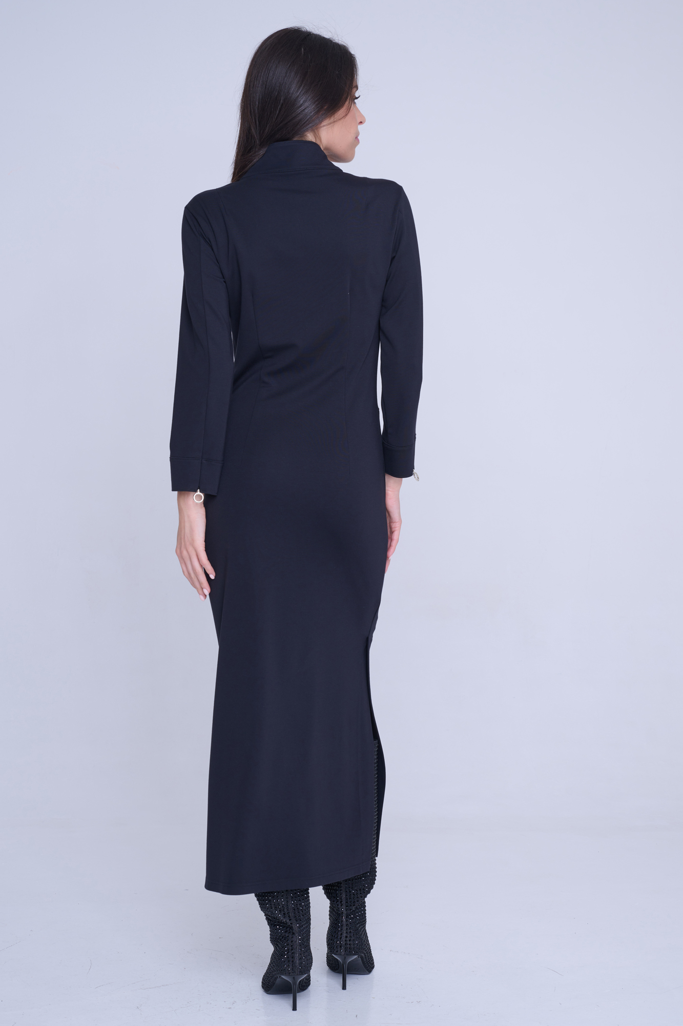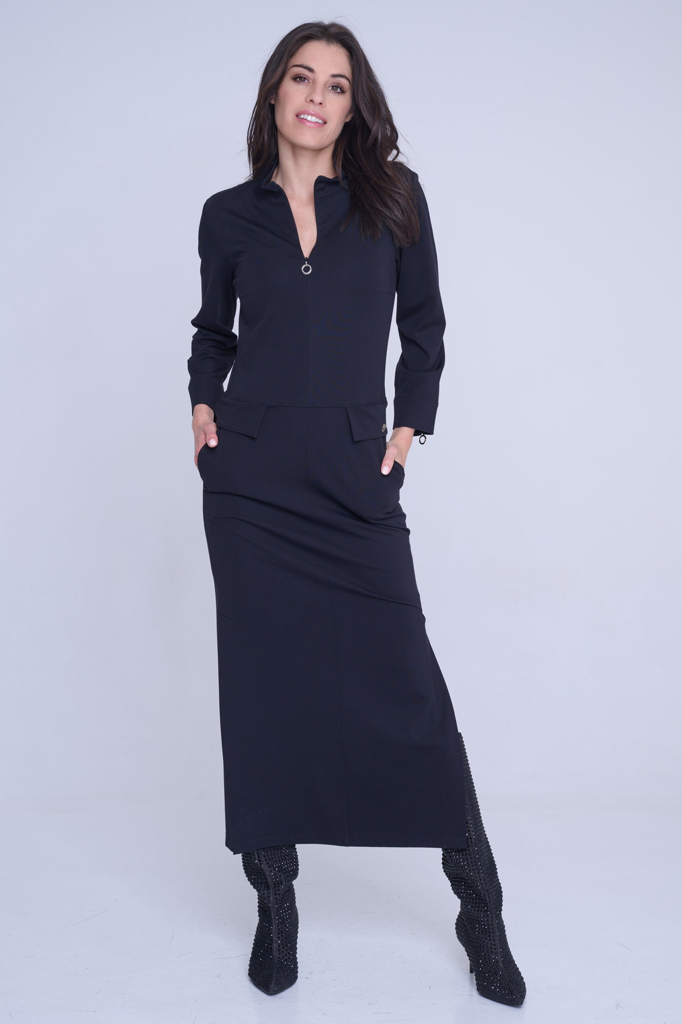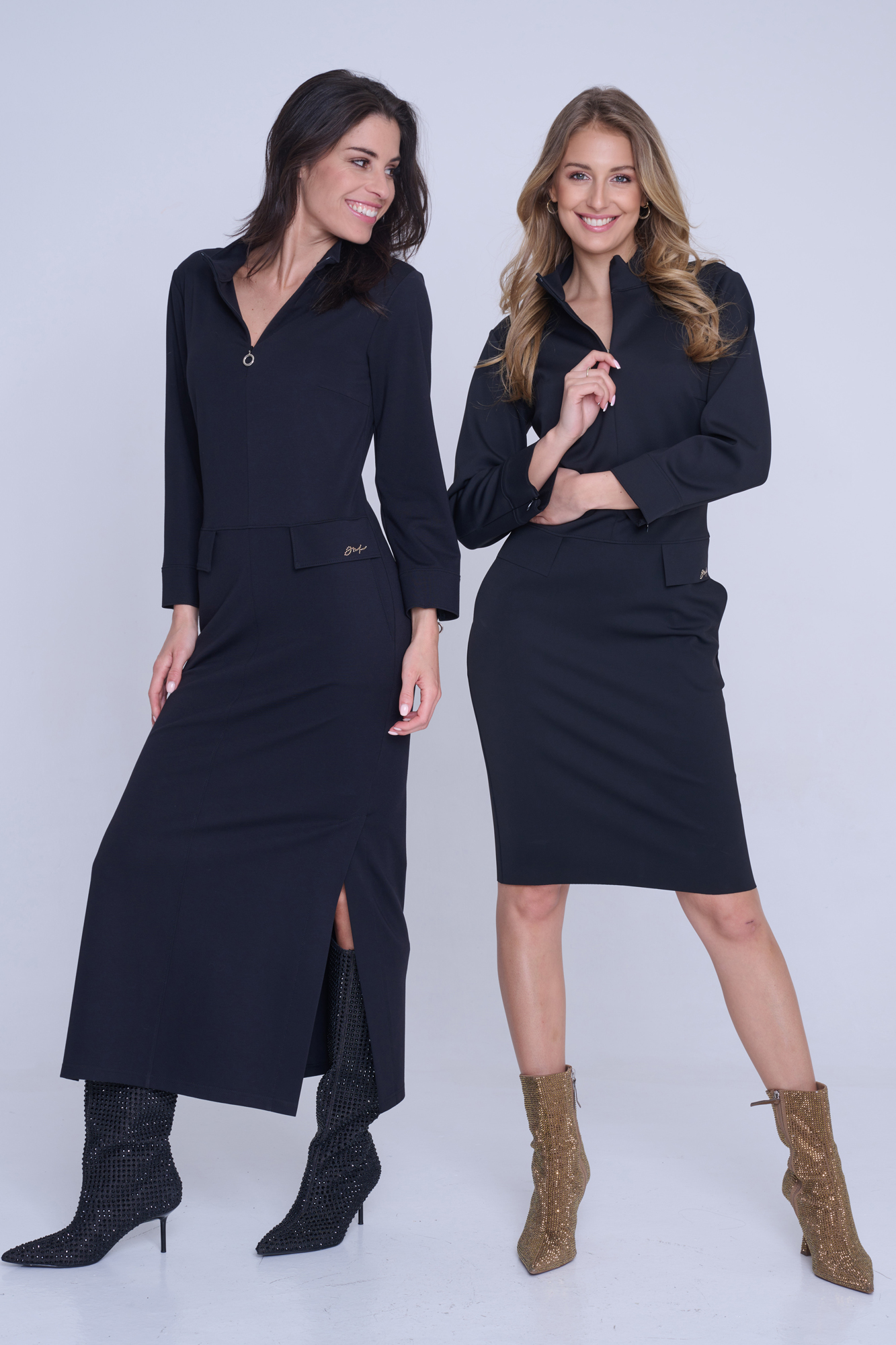 Bussiness šaty v dlouhé délce z příjemného strečového materiálu. Zlaté doplňky, zlatý krystalový motiv INF na předním díle.
