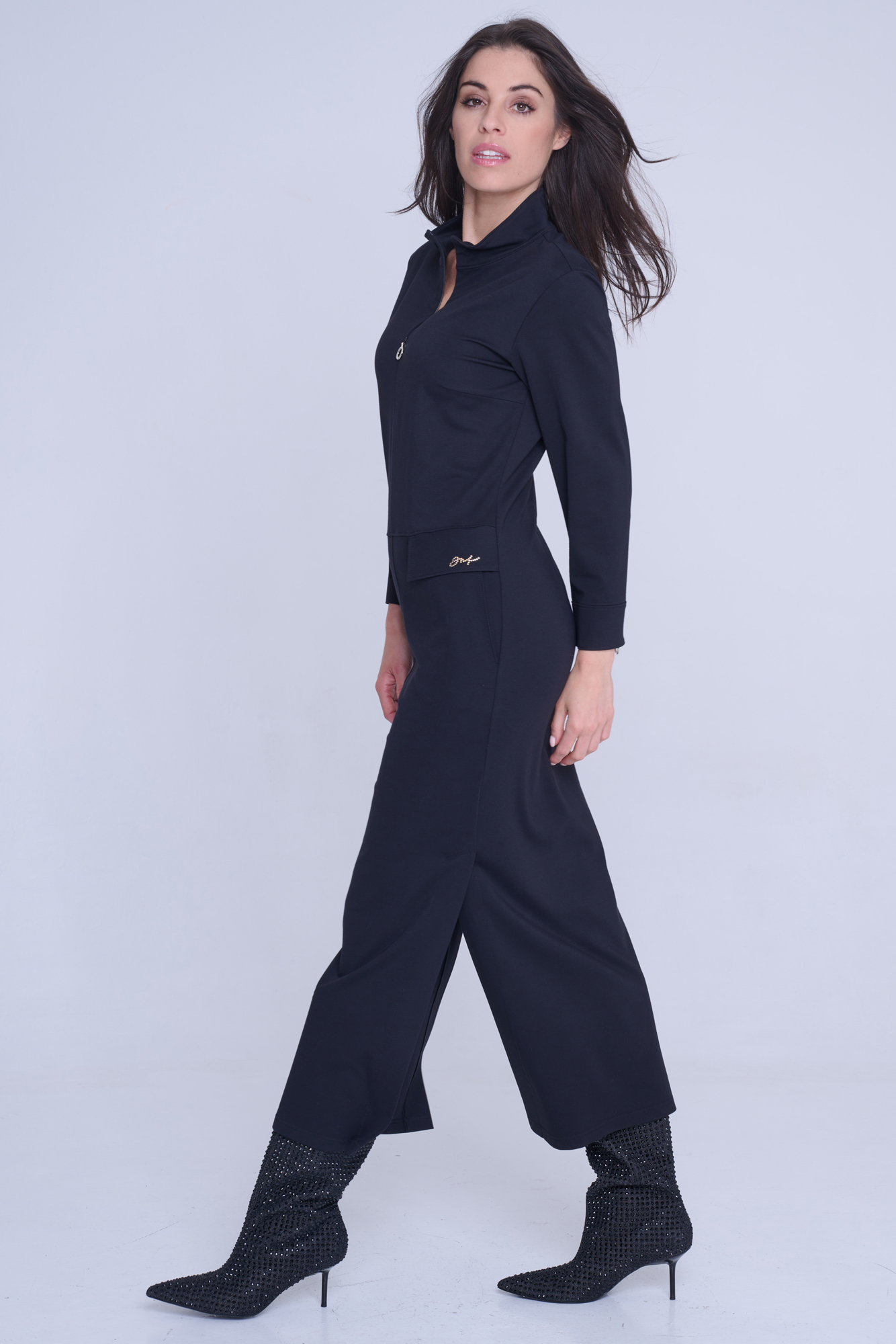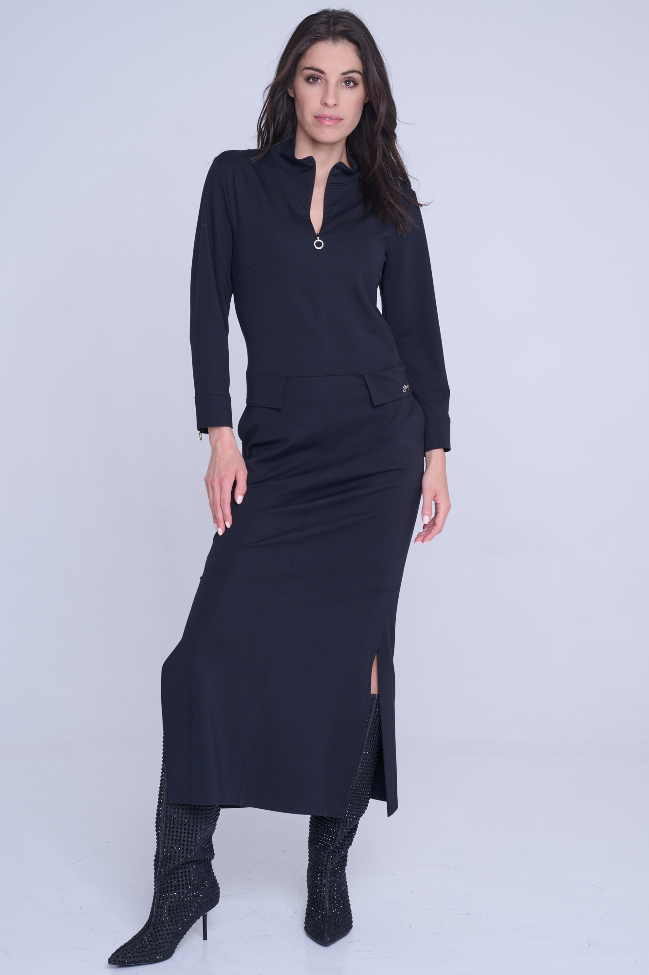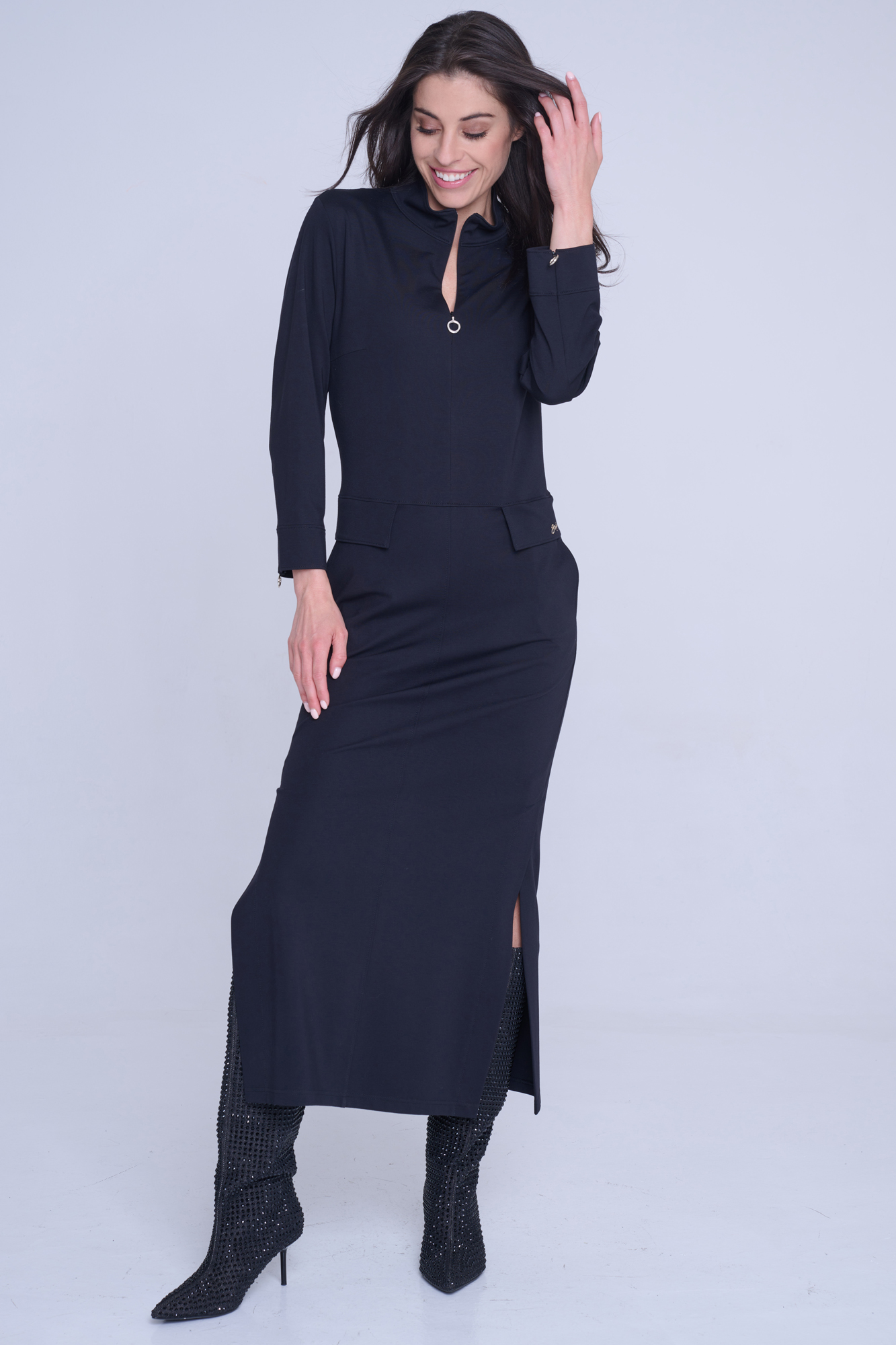 Bussiness šaty v dlouhé délce z příjemného strečového materiálu. Zlaté doplňky, zlatý krystalový motiv INF na předním díle.