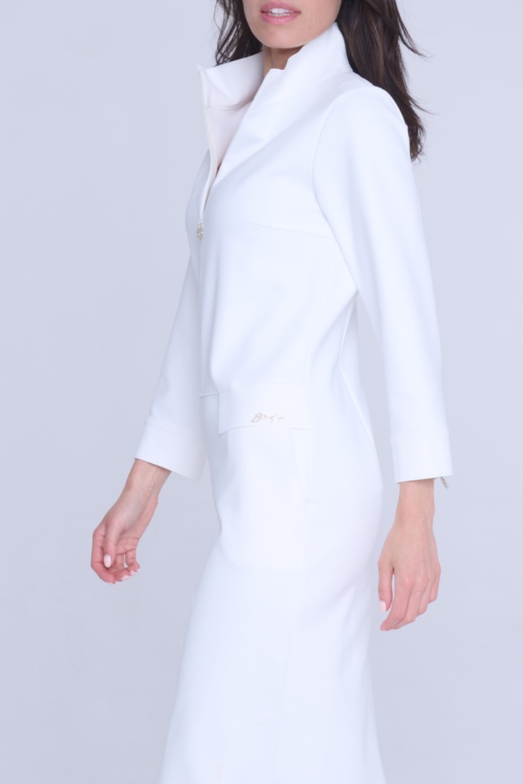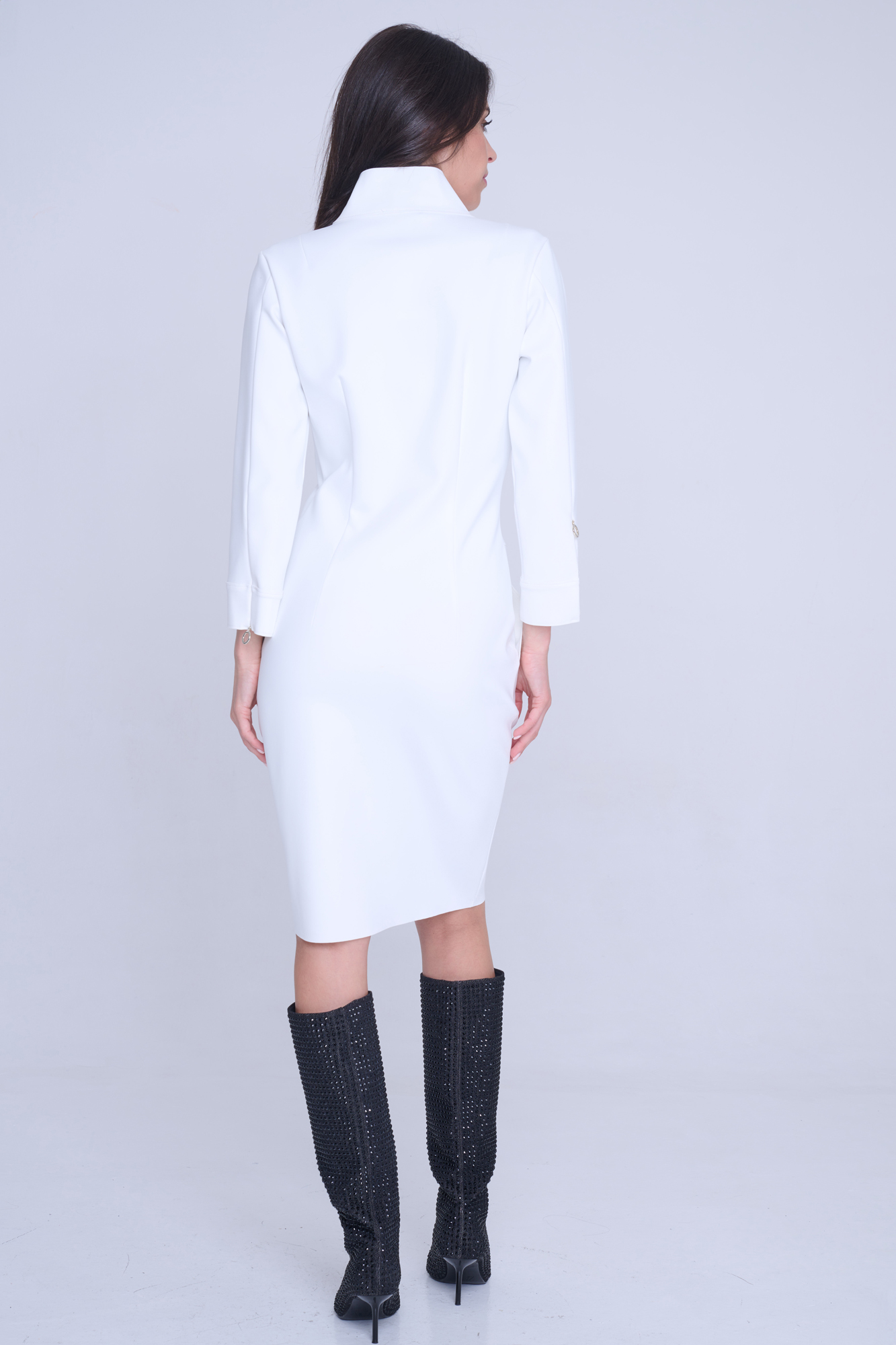 Krátké bussiness šaty Infinite. Zlaté doplňky, zlatý krystalový motiv INF na předním díle.