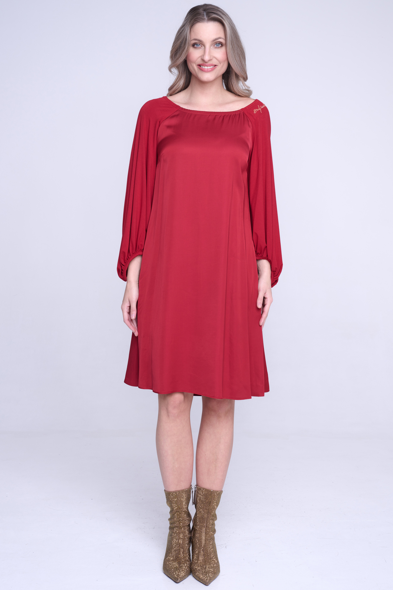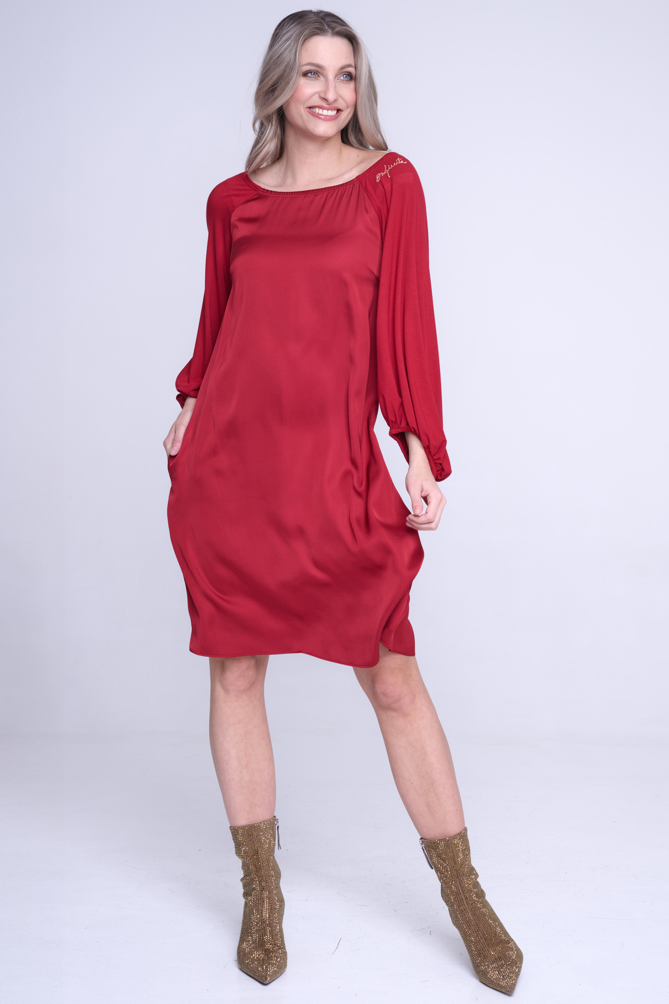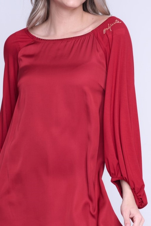 Šaty z viskózového saténu, rukávy z bambusového úpletu. Velmi příjemné materiály na nošení. Střih do "áčka" z ramen. Na rameni nápis Infinite ze zlatých krystalů Preciosa.