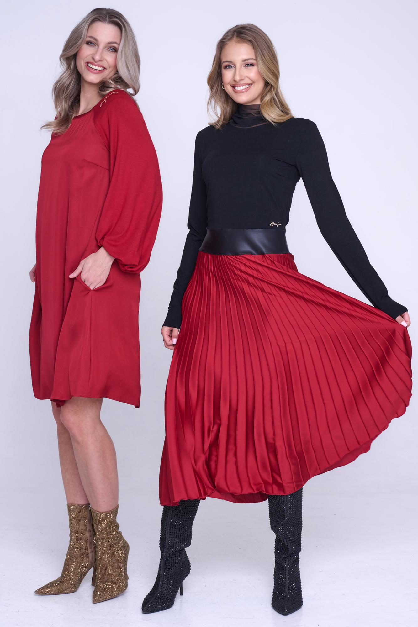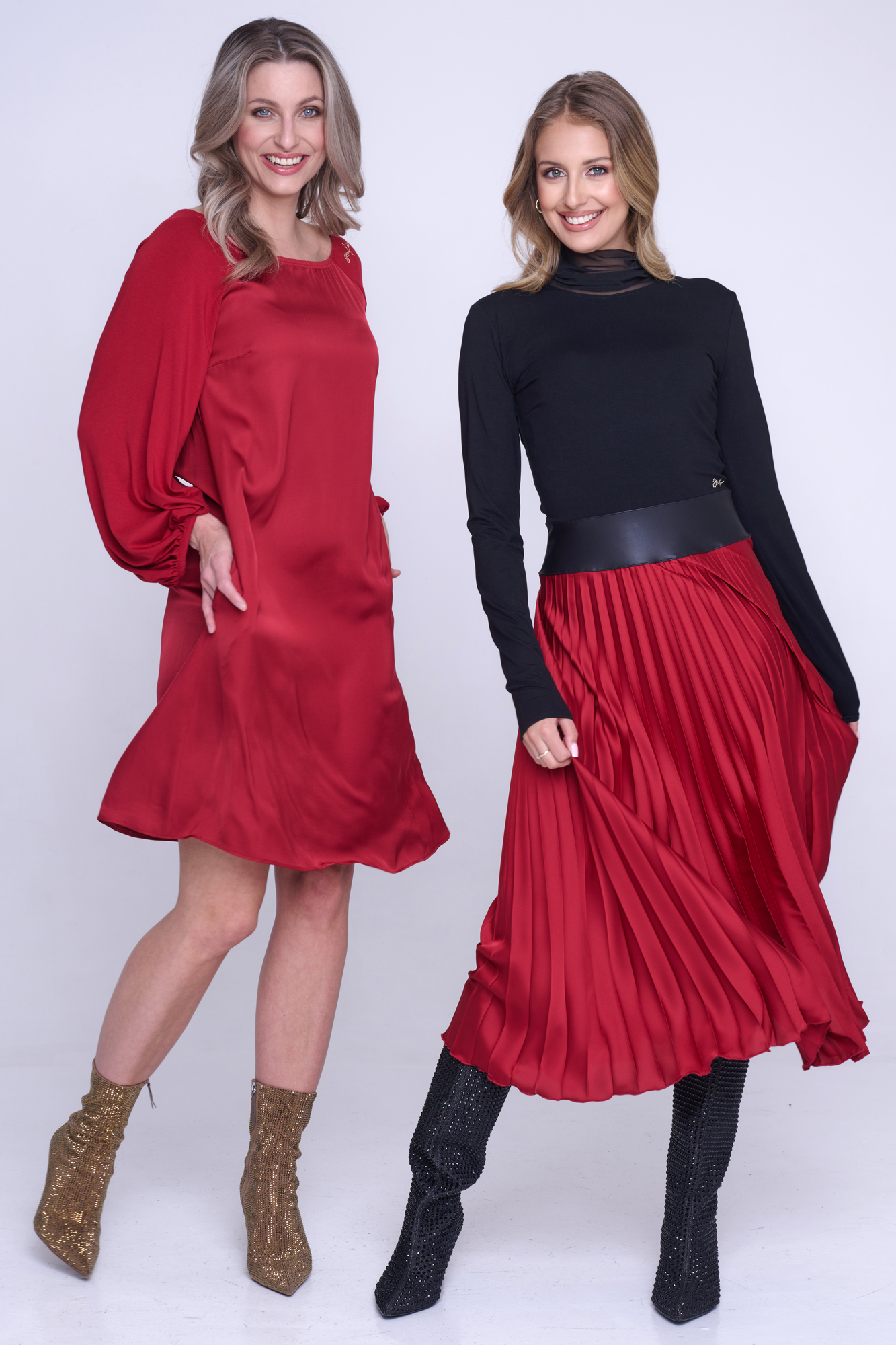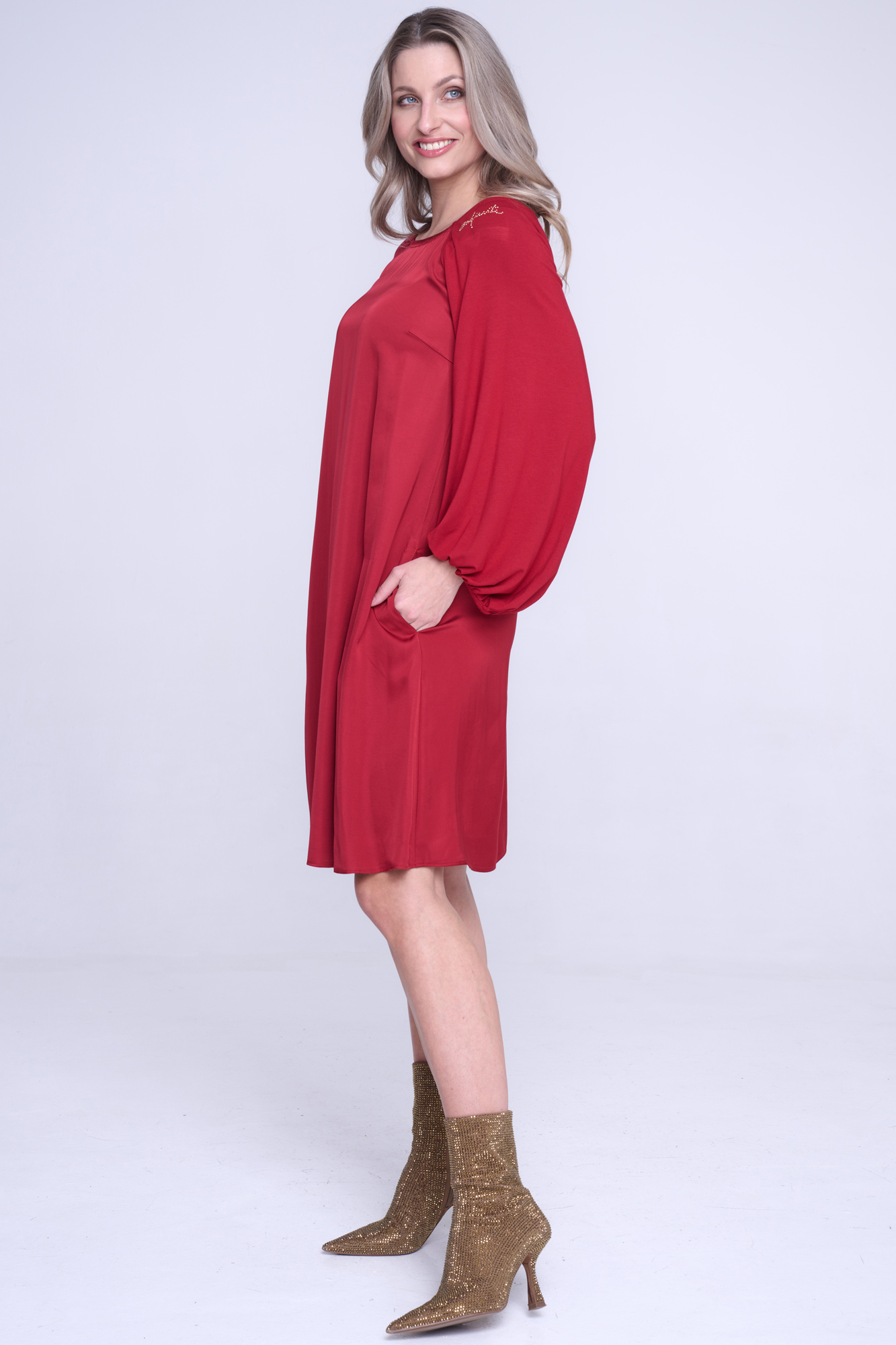 Šaty z viskózového saténu, rukávy z bambusového úpletu. Velmi příjemné materiály na nošení. Střih do "áčka" z ramen. Na rameni nápis Infinite ze zlatých krystalů Preciosa.