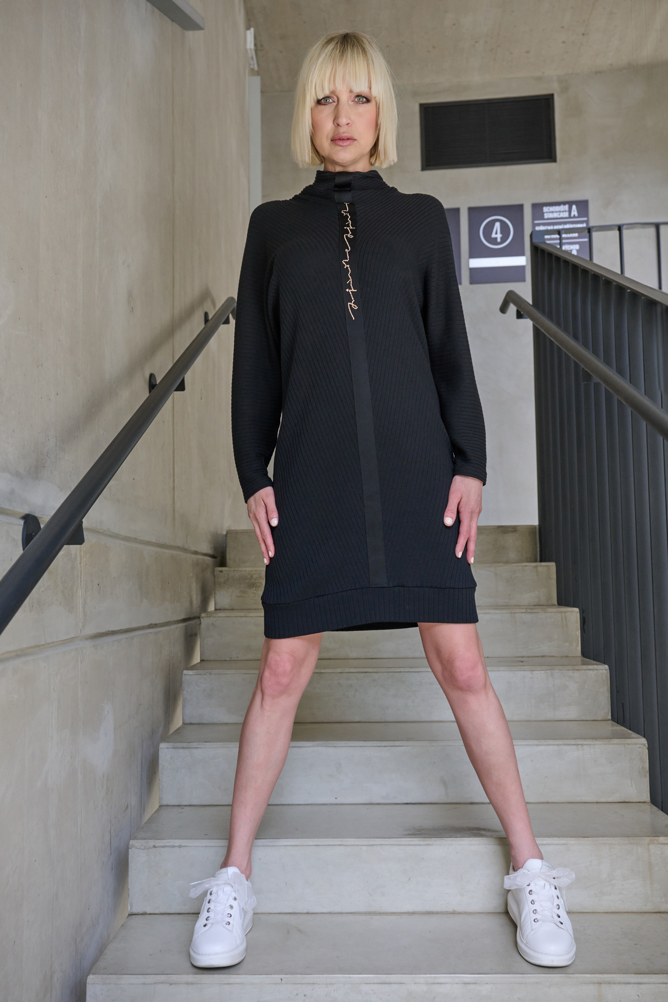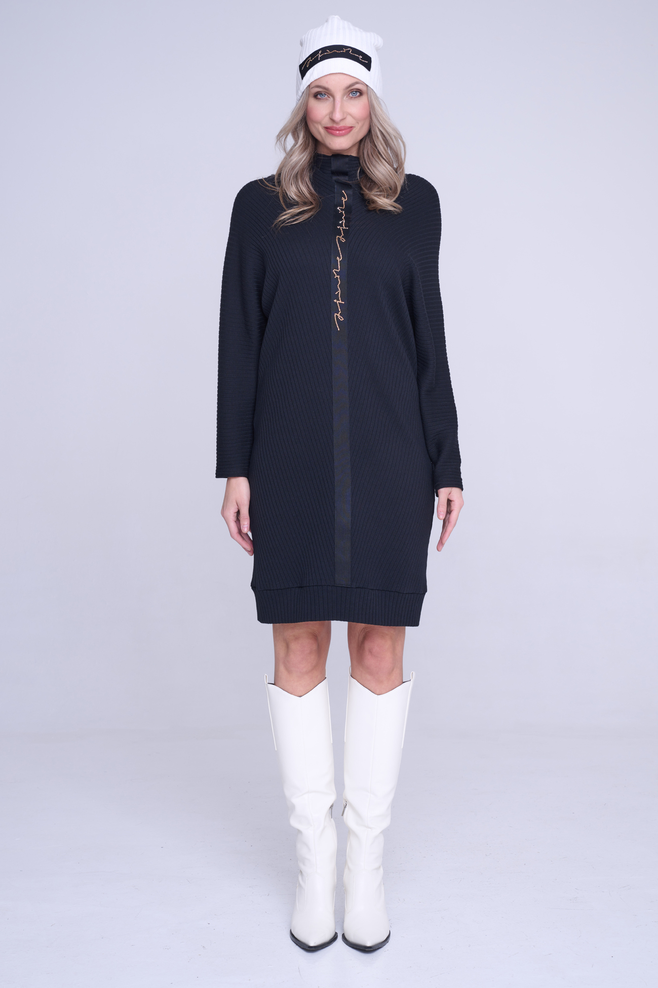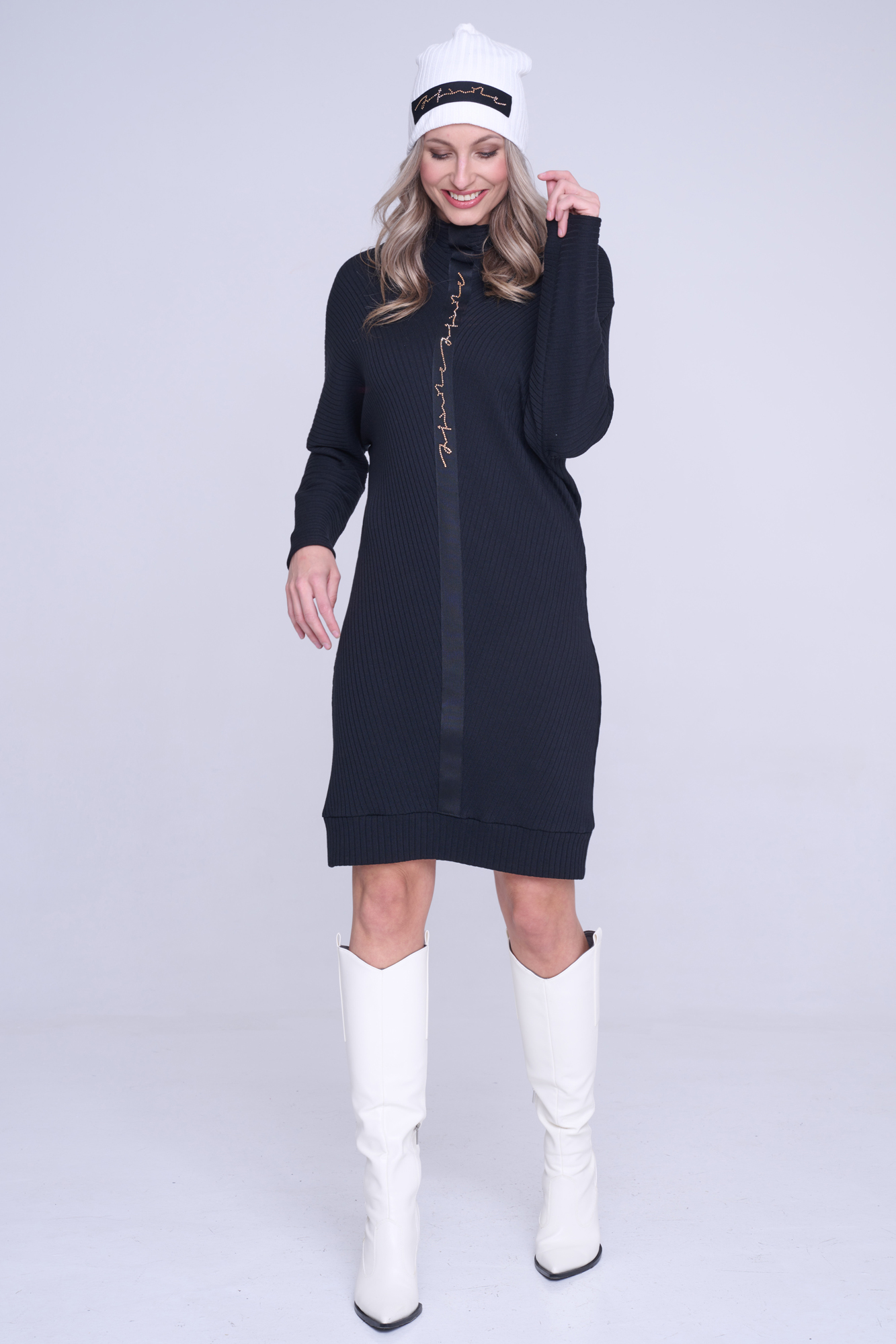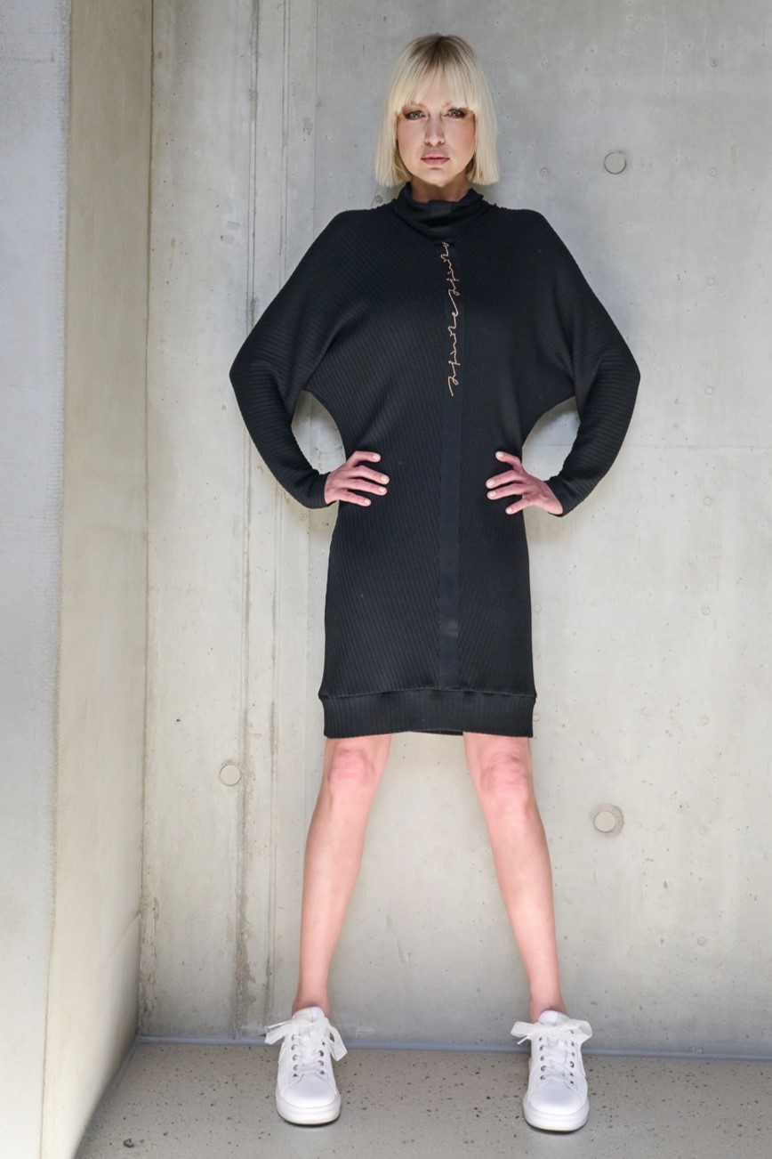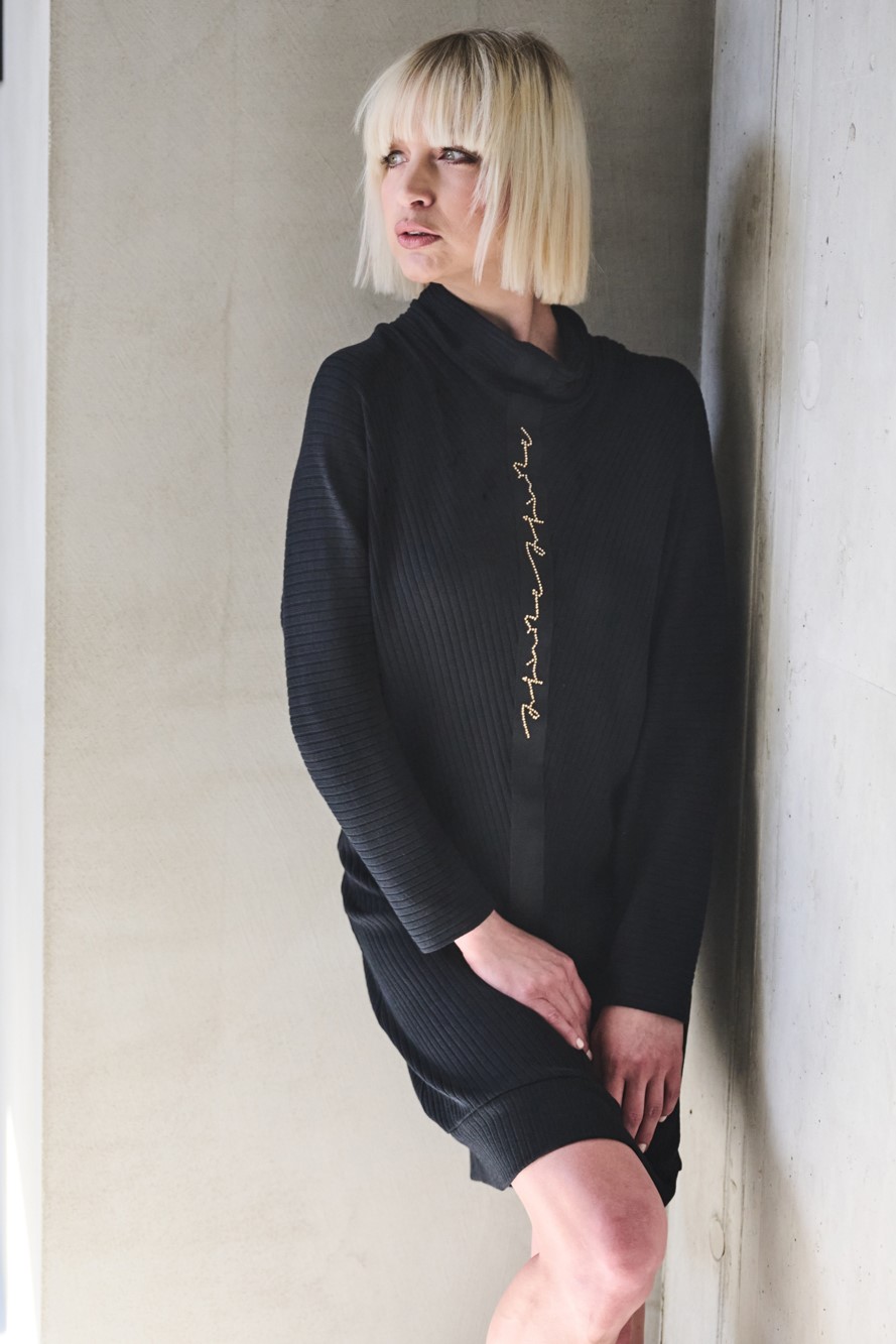 Šaty z úpletového žebra. Materiál je vyroben z bambusu, velmi příjemný na nošení. Na předním díle černá stuha s nápisem Infinite ze zlatých krystalů Preciosa.