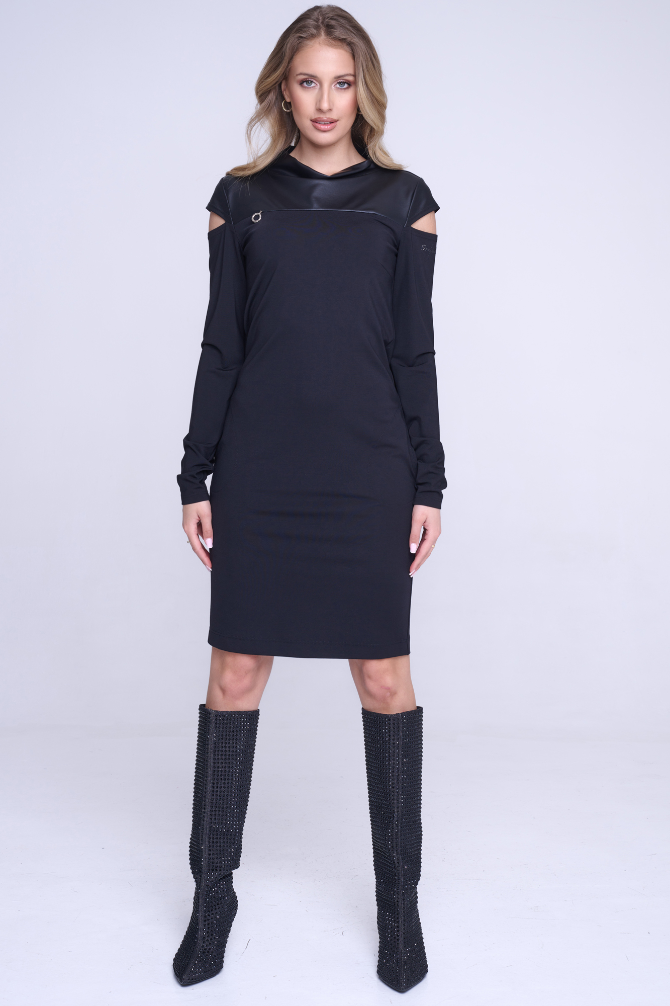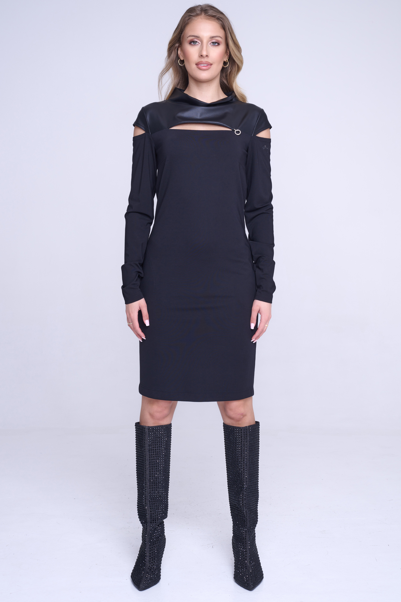 Šaty Infinite s kapsami. Vrchní díl z ekokůže. Na předním díle efektní zip. Pod rameny průstřihy na rukávech.