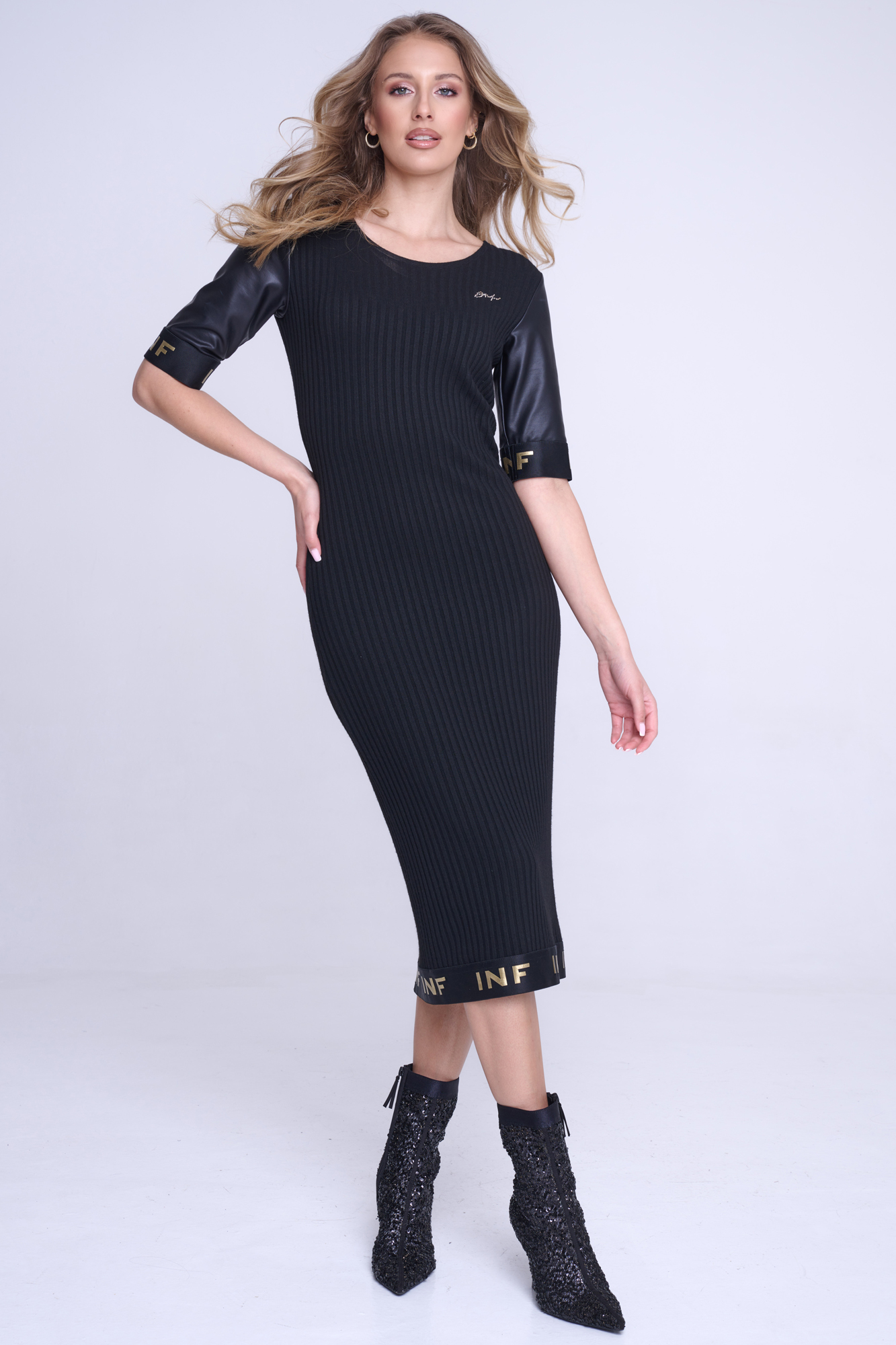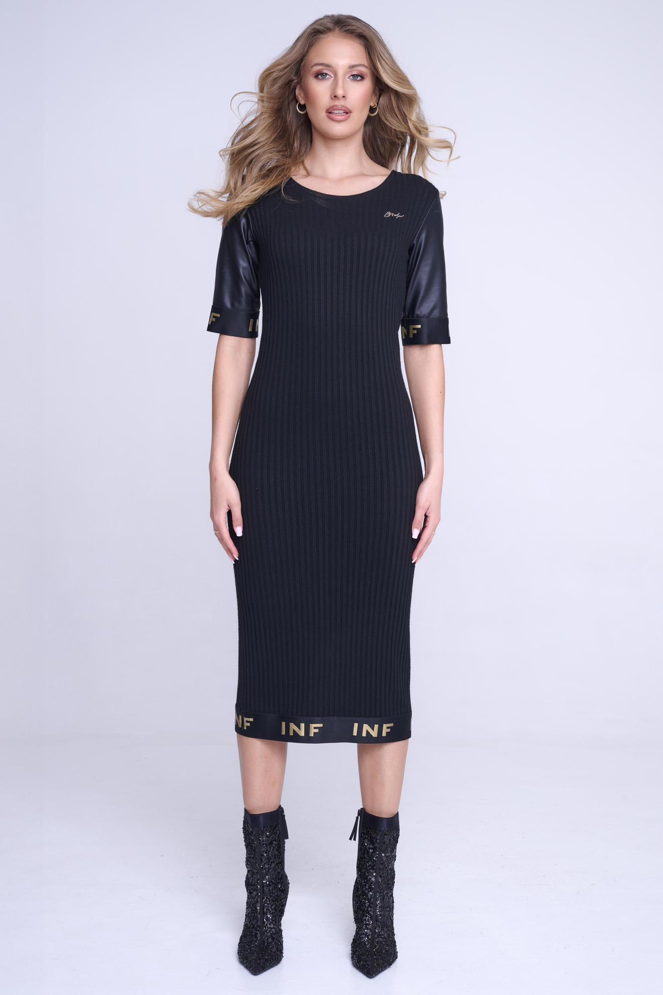 Šaty Infinite v midi délce. Na rukávech a v délce sukně efektní guma INF. Na předním díle minimalistický zlatý krystalový motiv INF.
