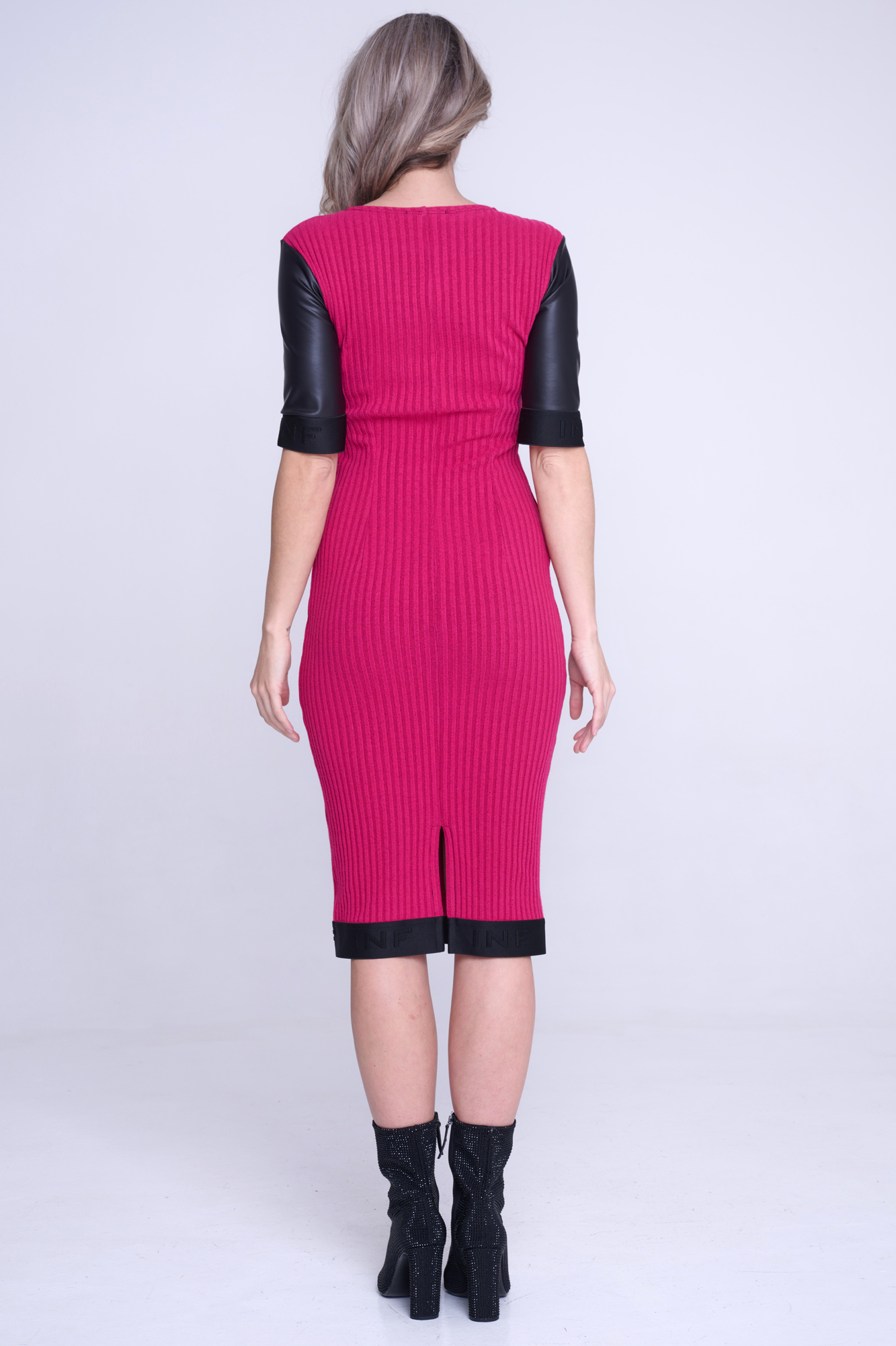 Šaty Infinite v midi délce. Na rukávech a v délce sukně efektní guma INF. Na předním díle minimalistický zlatý krystalový motiv INF.