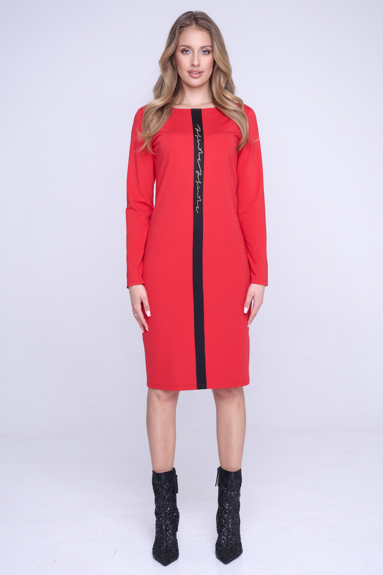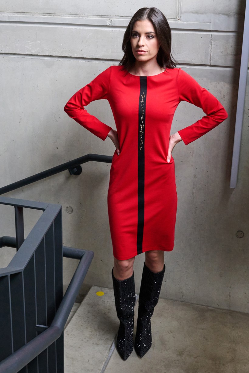 Mnohoúčelové tubové strečové šaty z úpletu. Možnost využití na party, ale i jako business šaty. Na předním díle černá stuha s nápisem Infinite ze zlatých krystalů Preciosa.